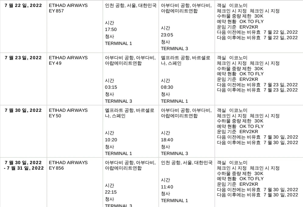 우리의 출발 편은 7월 22일 금요일 오후 17:50분에 인천을 출발하여 23일 토요일 오전 08:30분에 바르셀로나에 도착하는 EY857+EY 49, 돌아오는 항공편도 토요일 오전에 출발하여 일요일 정오쯤에 도착하는 것으로 일정이 그리 나쁘지 않았다. 결제 금액은 환차손, 기타 수수료 등을 포함하여 3인 모두를 합쳐서 205만 원!