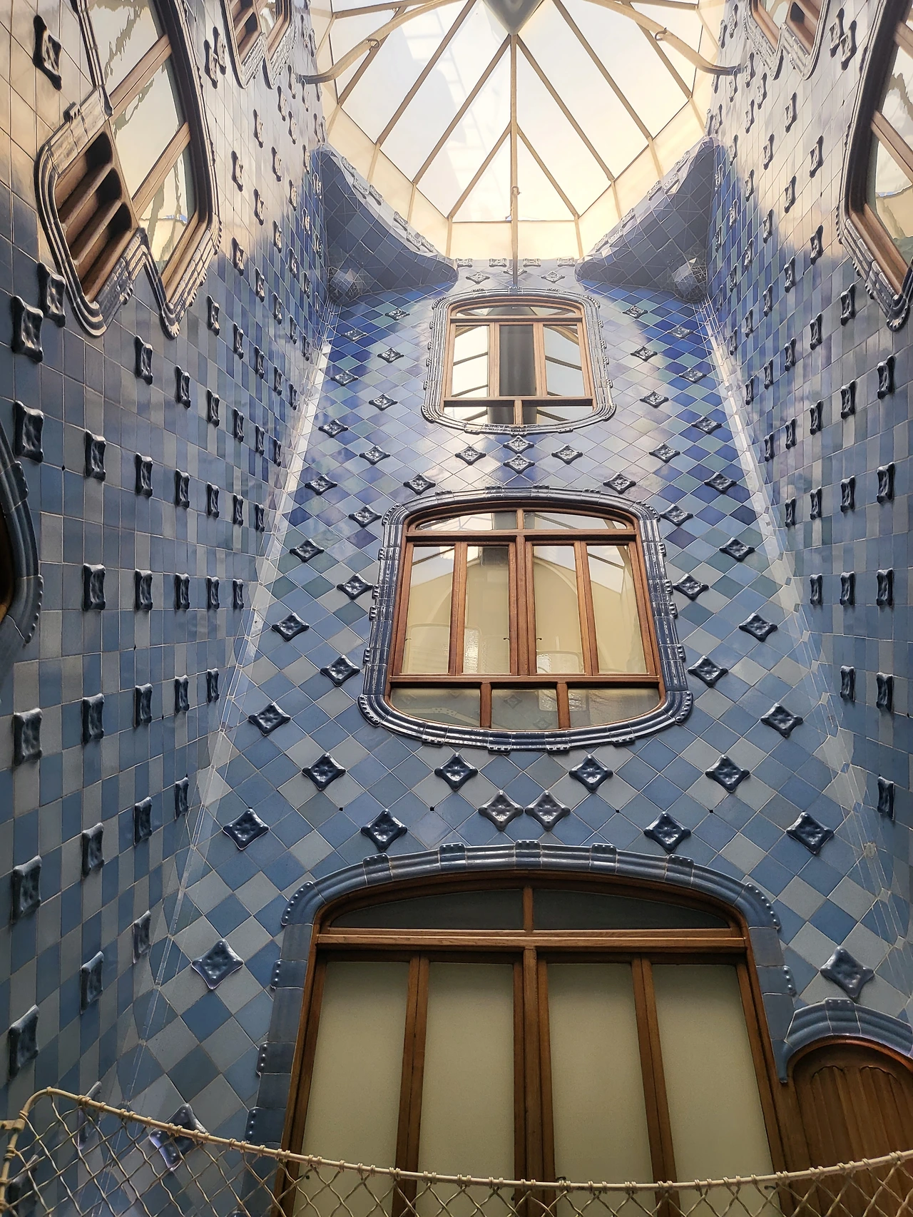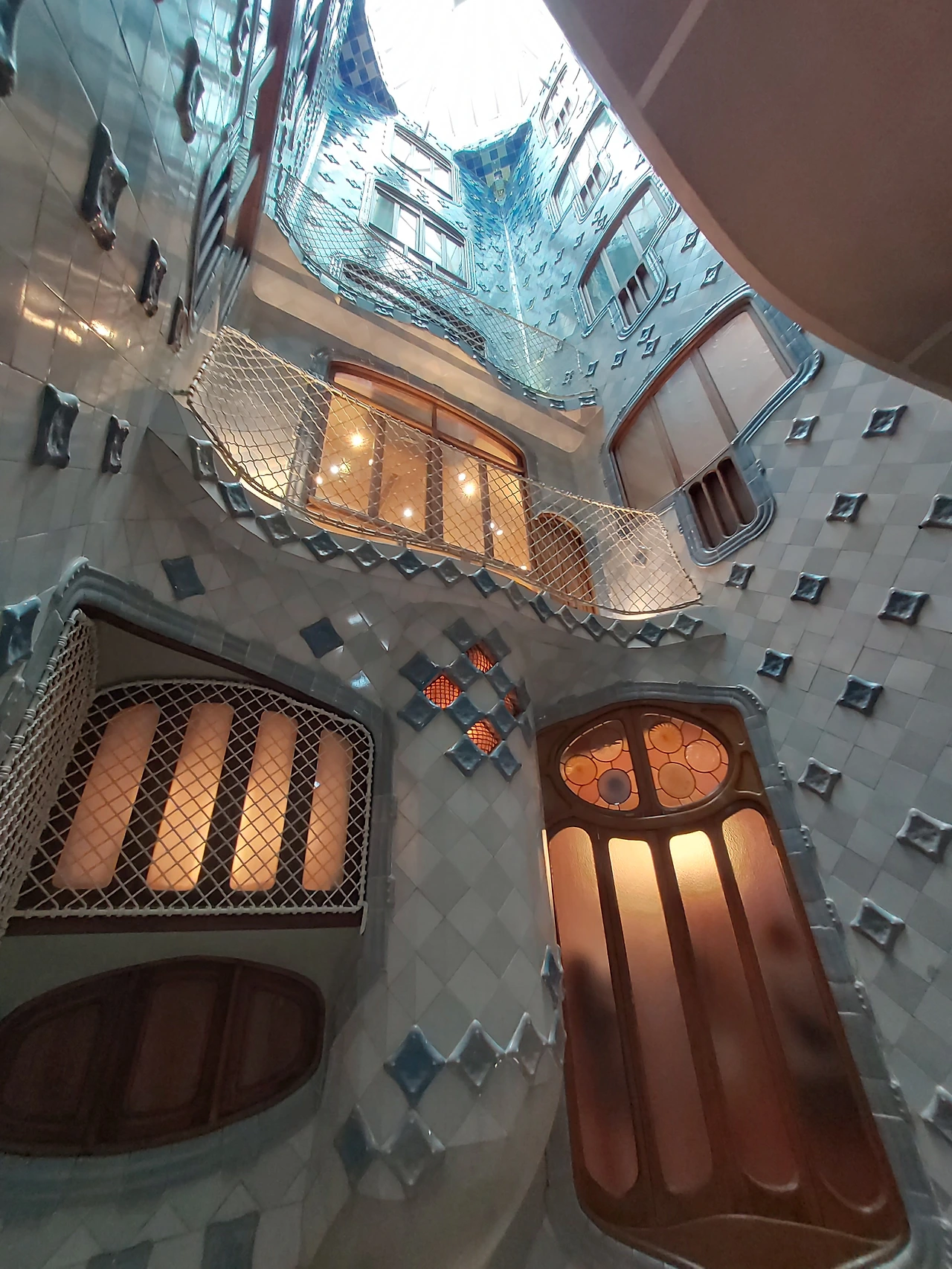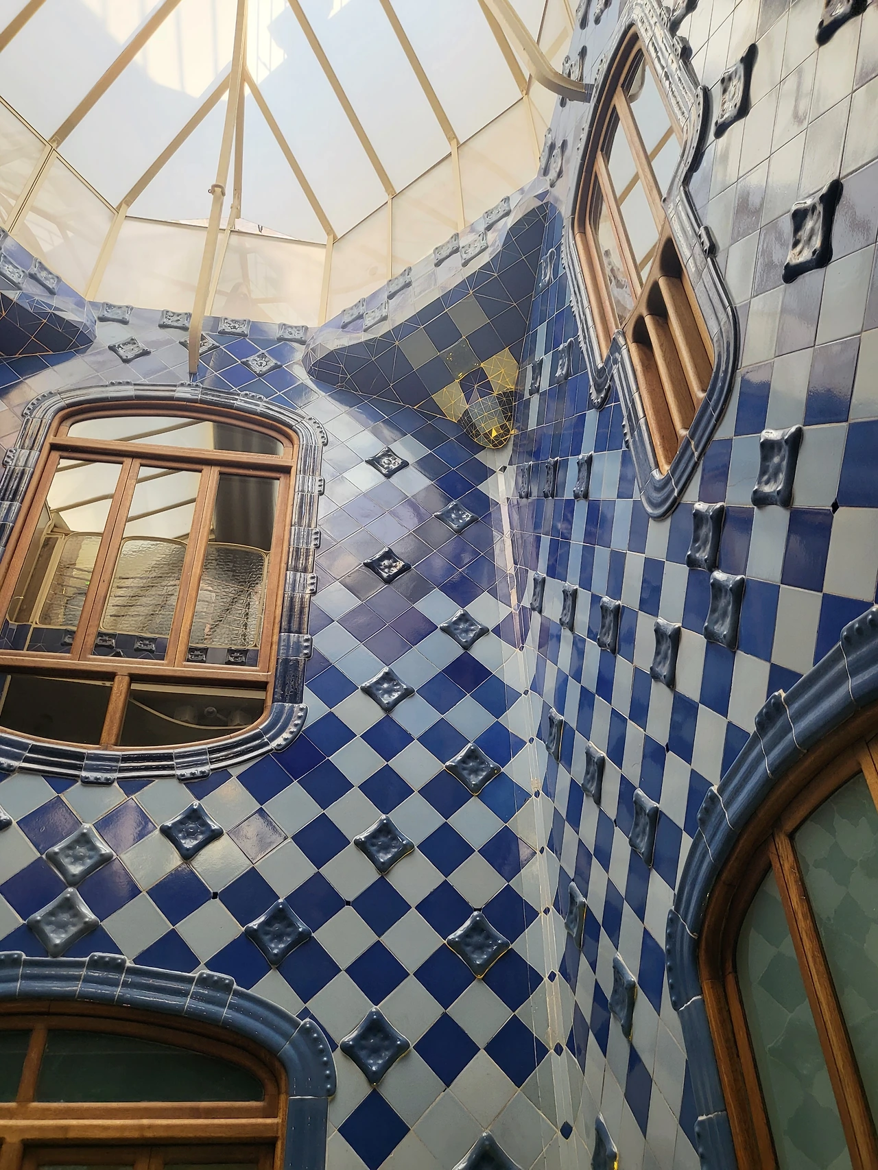내부 통로에서는 하늘의 빛이 건물 전체로 퍼지는 모습을 볼 수 있었다. 가우디는 자연광이 모든 방에 도달할 수 있도록 다양한 설계를 구상했으며, 색조가 다른 파란 타일을 활용하여 빛을 균일하게 분산시켰다. 빛이 강한 위층의 창문은 작고 아래로 내려갈 수도록 보다 많은 빛이 들어올 수 있도록 중앙부 통로를 디자인했다. 내가 본 가장 아름다운 집안의 파사트(내부통로) 풍경이었다. 바트요 가족의 전용 식당은 정원과 연결되어 있었다. 이 정원 공간은 아름다운 바닥 타일로 이루어져서 마치 인도나 중세의 작은 궁전에 있는 듯한 느낌을 주었다.