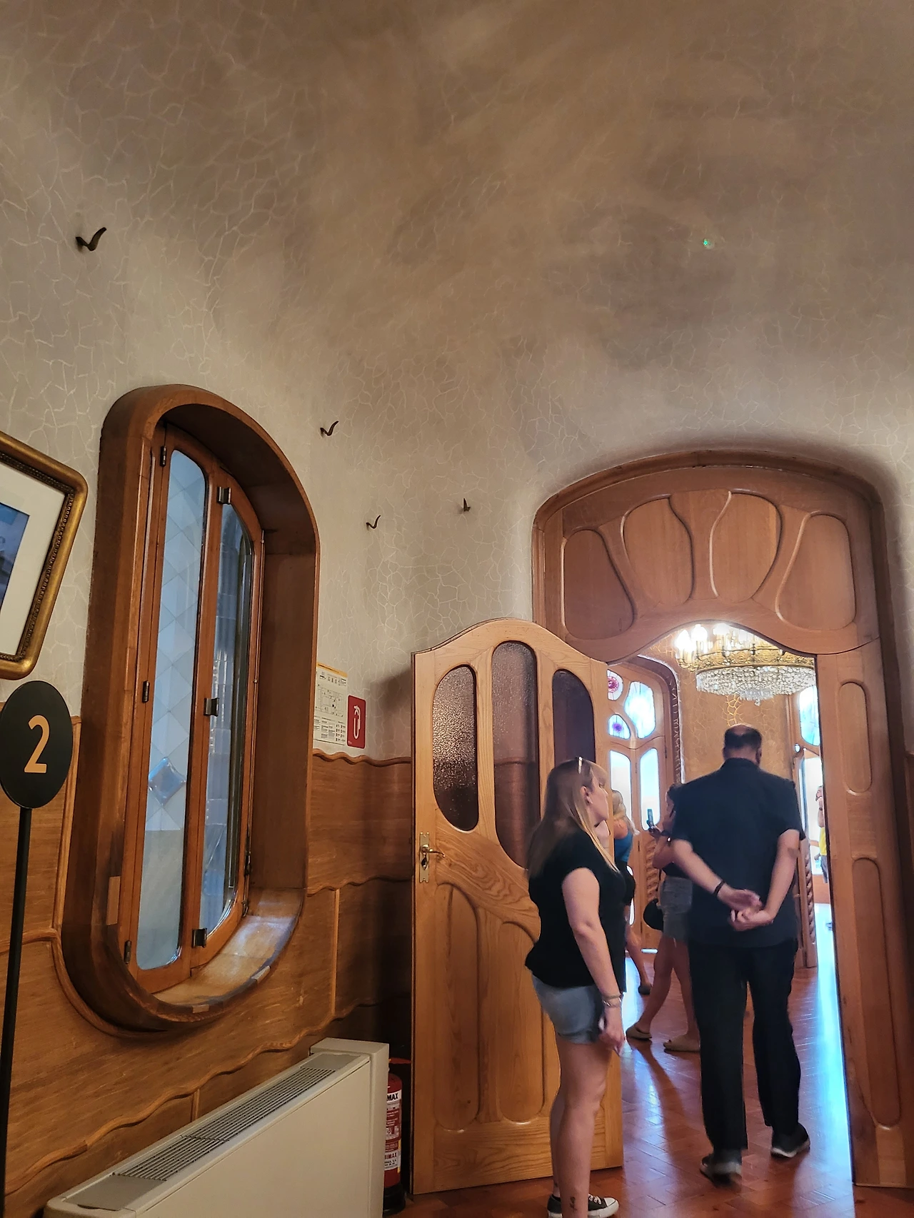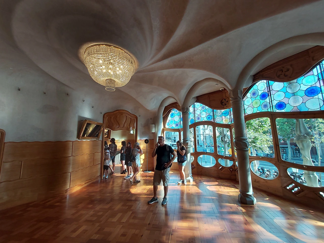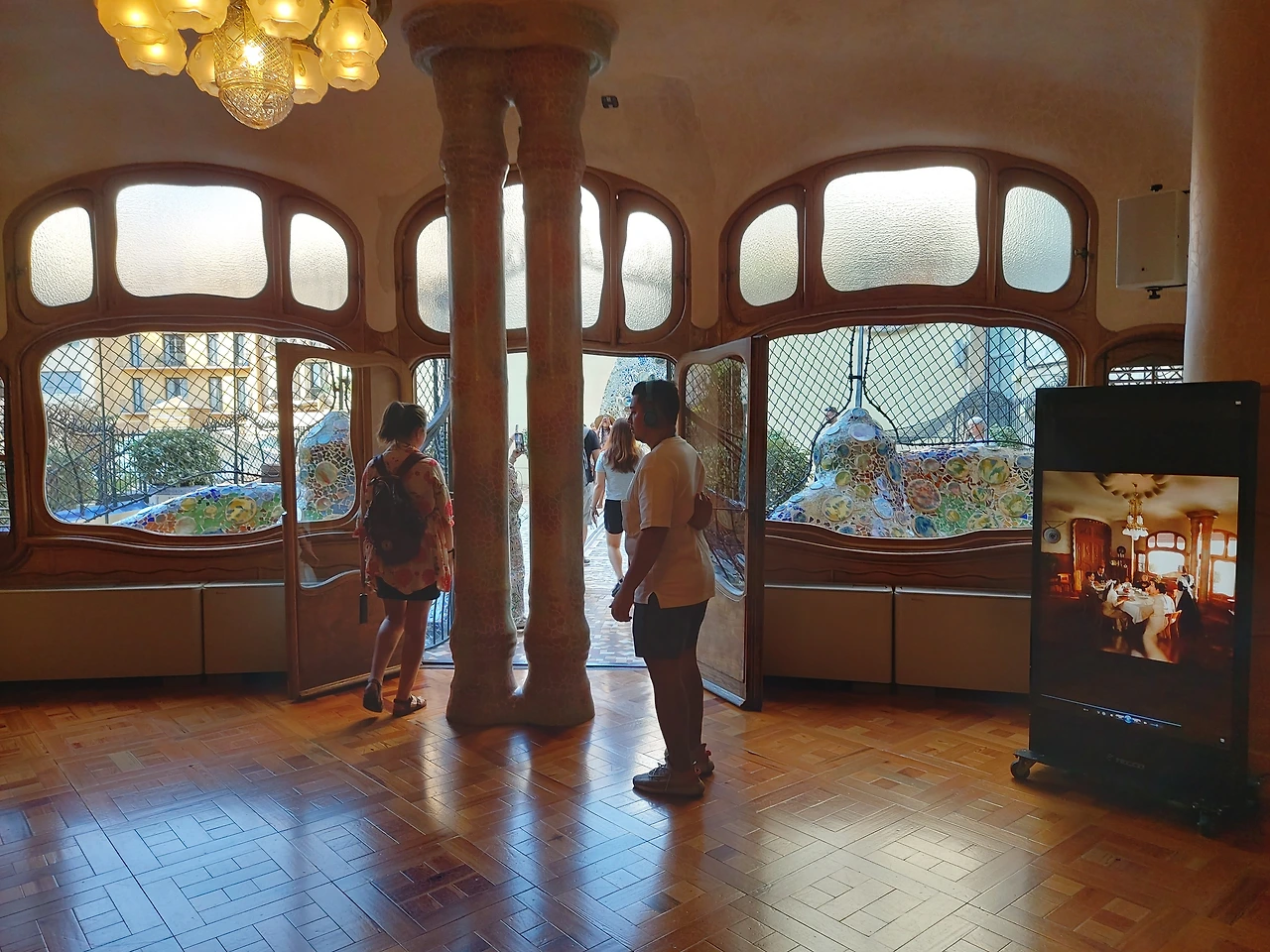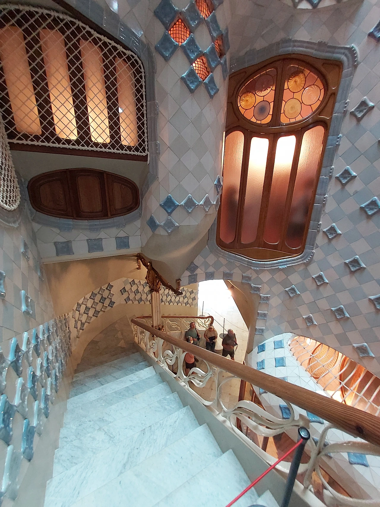 오전 9시 20분쯤에 우리 가족이 카사 바트요 입장을 시작했다. 한국어 오디오 가이드 북을 귀에 꽂고 설레는 마음으로 조심스럽게 입장을 했다. 가장 먼저 현관 입구로 향했다. 거북이 껍질 모양의 채광창과 곡선 모양의 둥근 천장, 화려한 목조 계단이 나타났다. 단단한 나무로 만들어진 목조 계단을 오르면 2층에 메인 홀이 나왔다.