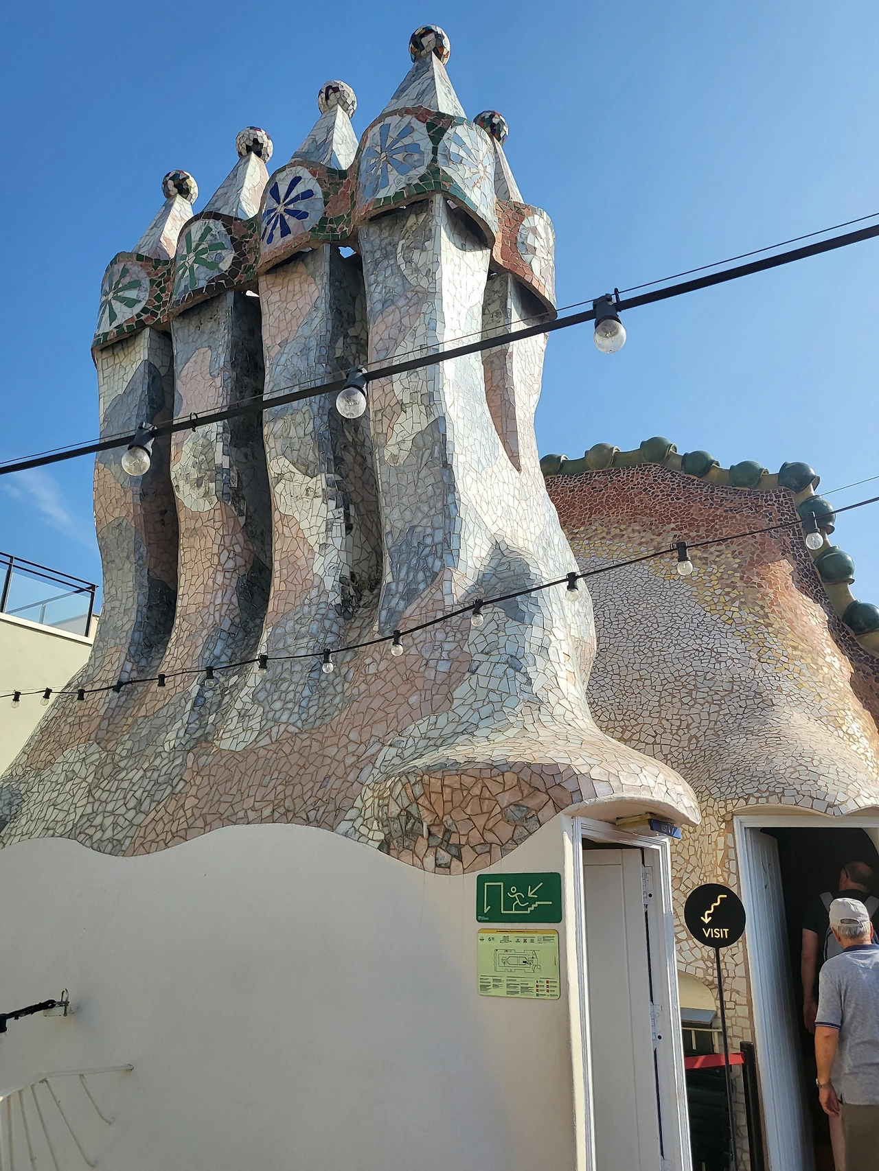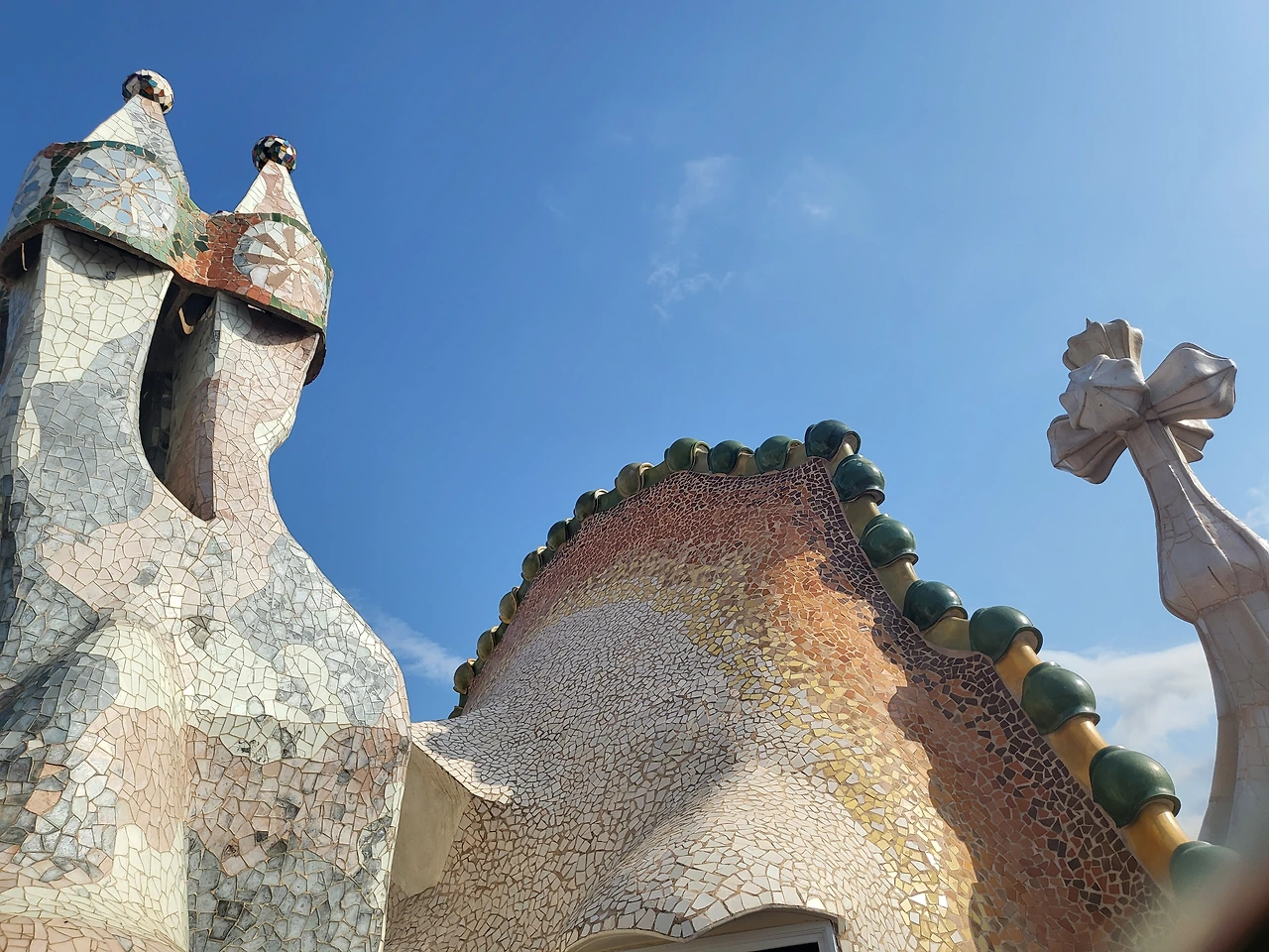 다락 공간을 지나서 우리는 옥상 테라스로 올라갔다. 옥상 테라스는 용의 등 모양 형태로 가우디가 타일을 통해 구현했던 그 기법을 그대로 활용했으며, 연기의 역류를 방지하도록 굴곡진 4개의 굴뚝이 인상 깊게 들어왔다. 옥상을 끝으로 다시 한층 한층 아쉬운 마음을 달래며 카사 바트요 건물을 내려왔다. 공간 하나하나 둘러볼 때마다 가우디의 디자인에 놀랐고, 이런 공간에 지구상에 있다는 것. 그리고 내가 보고 있다는 것만으로도 너무나 행복했다. 우리는 다시 지하로 내려와서 비디오 아트쇼를 감상했다. 제주도에 있는 빛의 벙커와 비슷한 느낌이었다. 이것을 마지막으로 카사 바트요의 투어가 마무리되었다.
