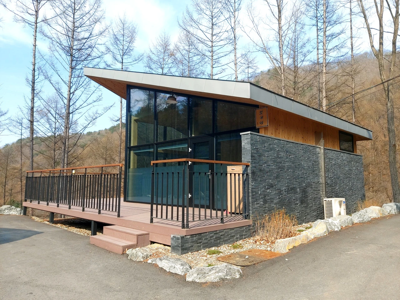 잠시 후에 휴양림 전체를 둘러보기 위해서 집을 나선다. 옷을 갈아입으려는 순간 투명한 통창의 단점이 보였다. 통창의 특성상 불을 켜면 밖에서 방을 보기 쉽다는 것. 블라인드가 있으니 이럴 때 잘 활용해야 할 듯하다.