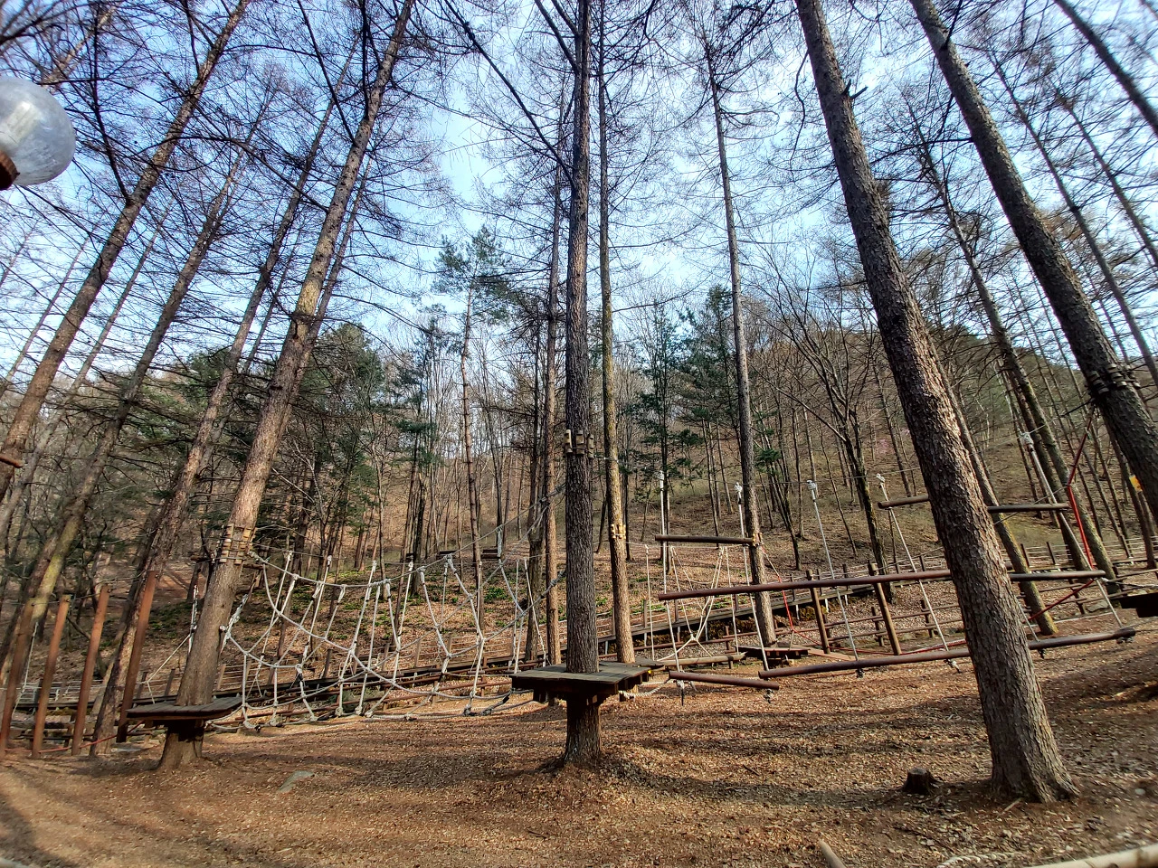 다시 강원 숲체험장 중심으로 이어지는 길. 그 길의 끝에는 이곳에서 가장 인기가 많은 곳이 있다. 바로 숲속모험동산이라고 불리는 아이들의 놀이터. 도시에서 아이들이 체험할 수 없는 숲과 함께하는 놀이 공간이다. 숲속모험동산은 나무나 그물 등을 이용해 나무와 나무 사이를 이동하는 체험 놀이터다. 아이 수준에 따라서 할 수 있는 다양한 놀이 시설이 가득했다. 지난 뉴질랜드에서 접했던 놀이시설과 유사한 느낌. 한국에서도 이런 시설을 만날 수 있다니 그저 반가웠다. 이 장소가 진정한 숲체험의 공간이었다.