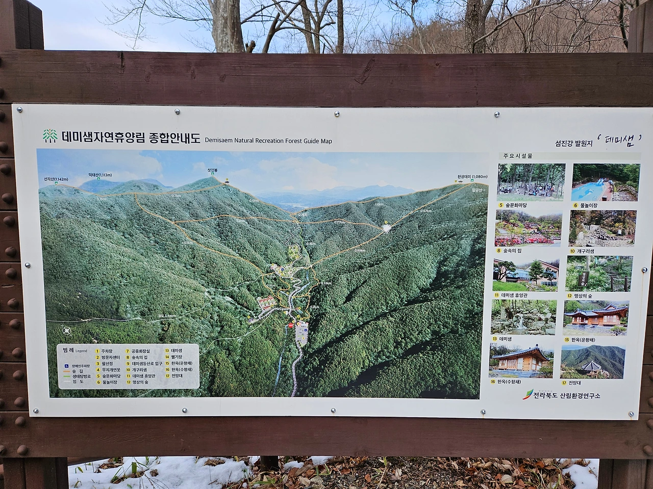 펜션을 제외하고 민가가 드물 만큼 전라도의 오지인 것은 분명했다.표지판을 지나서 약 3분 정도 가파른 언덕길을 오르니 데미샘 자연휴양림 입구가 나왔다.