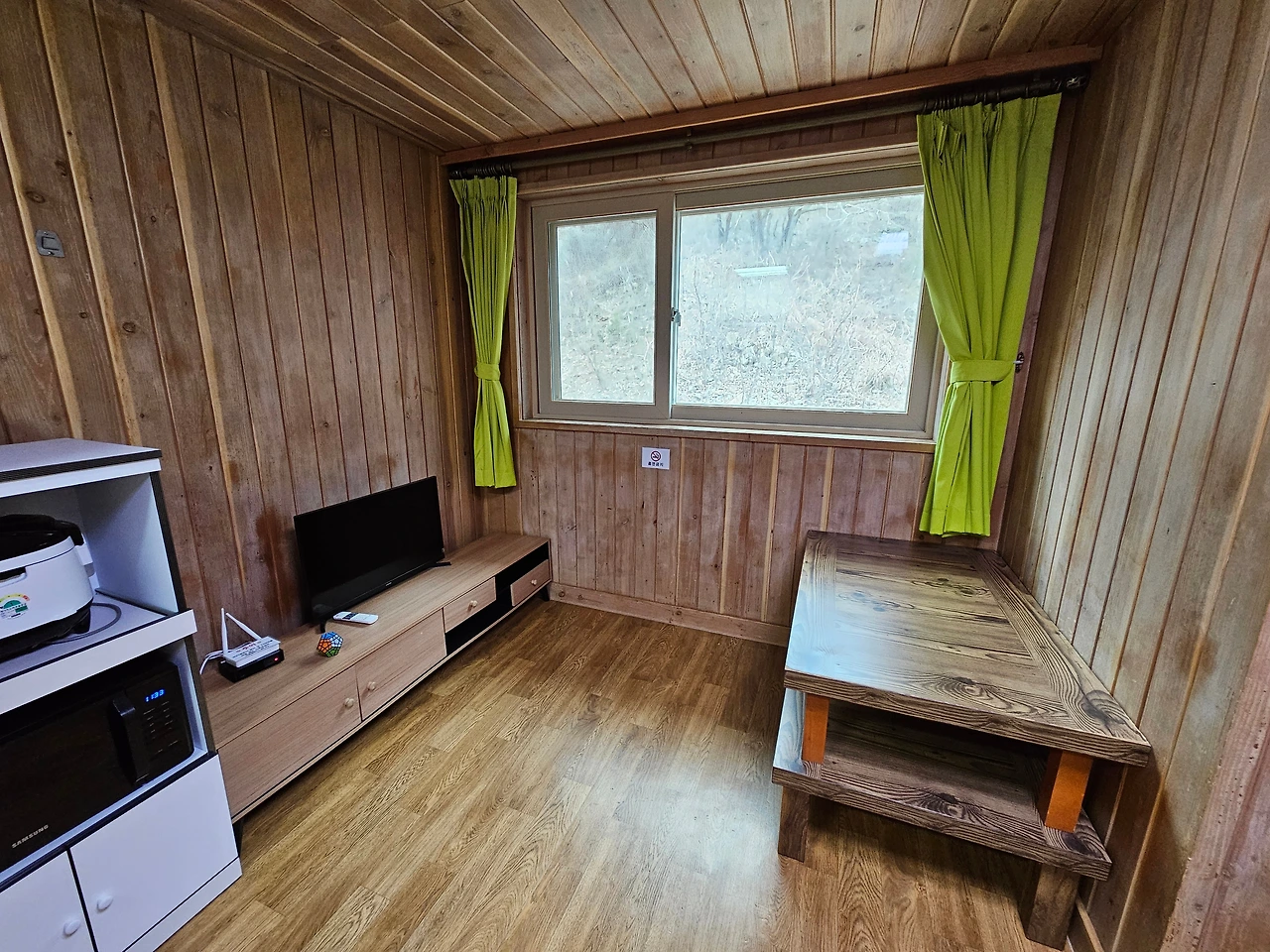 겨울철이라서 아직 많은 시설들이 공사 중이었고, 시설 보수를 위해서 예약을 받지 않는 숙소도 있었다. 숲 속의 집을 예약하고 싶었지만 아쉽게도 이번에는 가족휴양동을 예약할 수밖에 없었다. 투룸 구조로 만들어진 휴양동 객실도 방과 거실로 넓게 잘 빠져있고 방마다 큰 창이 있어서 자연 풍경을 즐기기에 부족함이 없었다.