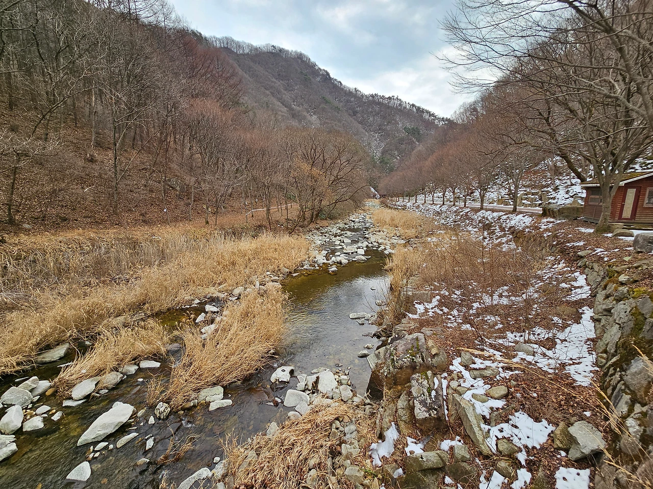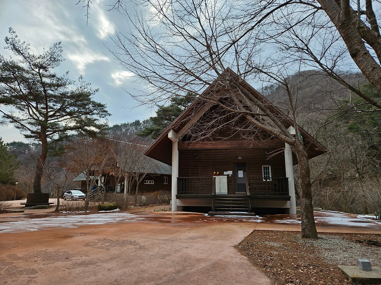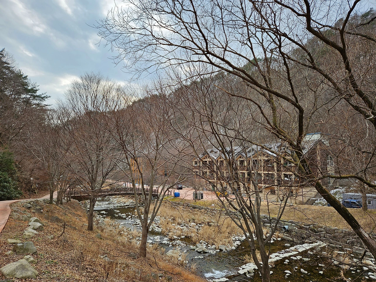 차를 차고 다시 휴양림 안쪽으로 들어갔다. 자연과 어우러져 잘 꾸며진 산책로가 눈에 들어왔다. 겨울을 이겨내고 있는 나무들과 맑은 물이 조화를 이루면서 아기자기한 모습을 자아내고 있었다. 가장 먼저 오토캠핑장이 나왔고, 다시 한 적한 길을 지나니 갈림길이 나왔다. 갈림길에서 직진으로 가면 산림문화휴양관이 나왔고, 다리를 건너서 가면 숲 속의 집과 계곡을 따라서 이어지는 산책로가 있었다. 조금 더 가니 숲 속의 집 지구가 있었다. 통나무집 총 4채가 있었다. 일부는 아직 수리 중이었고, 일부는 예약이 가능해 보였다. 한 채 한 채 웅장한 자태가 마음에 들었다. 바로 앞 쪽에 투숙객들만 오붓하게 이용할 수 있는 계곡이 있어서 여름이나 가을에는 상당히 인기 있는 숙소로 보였다. 경쟁률이 높아서 예약하기가 쉽지 않겠다는 생각이 들었다.