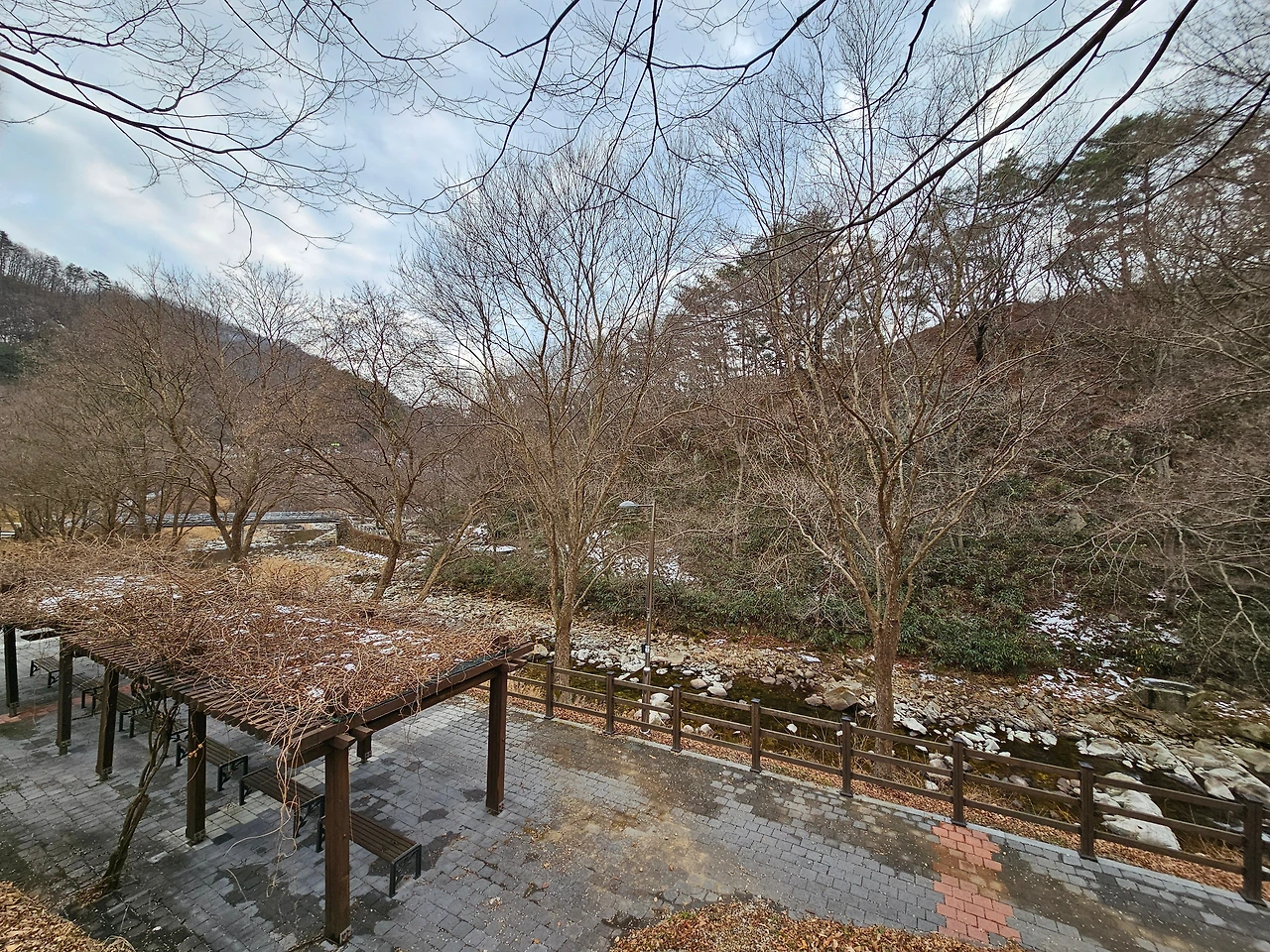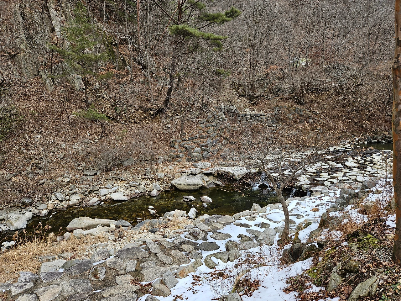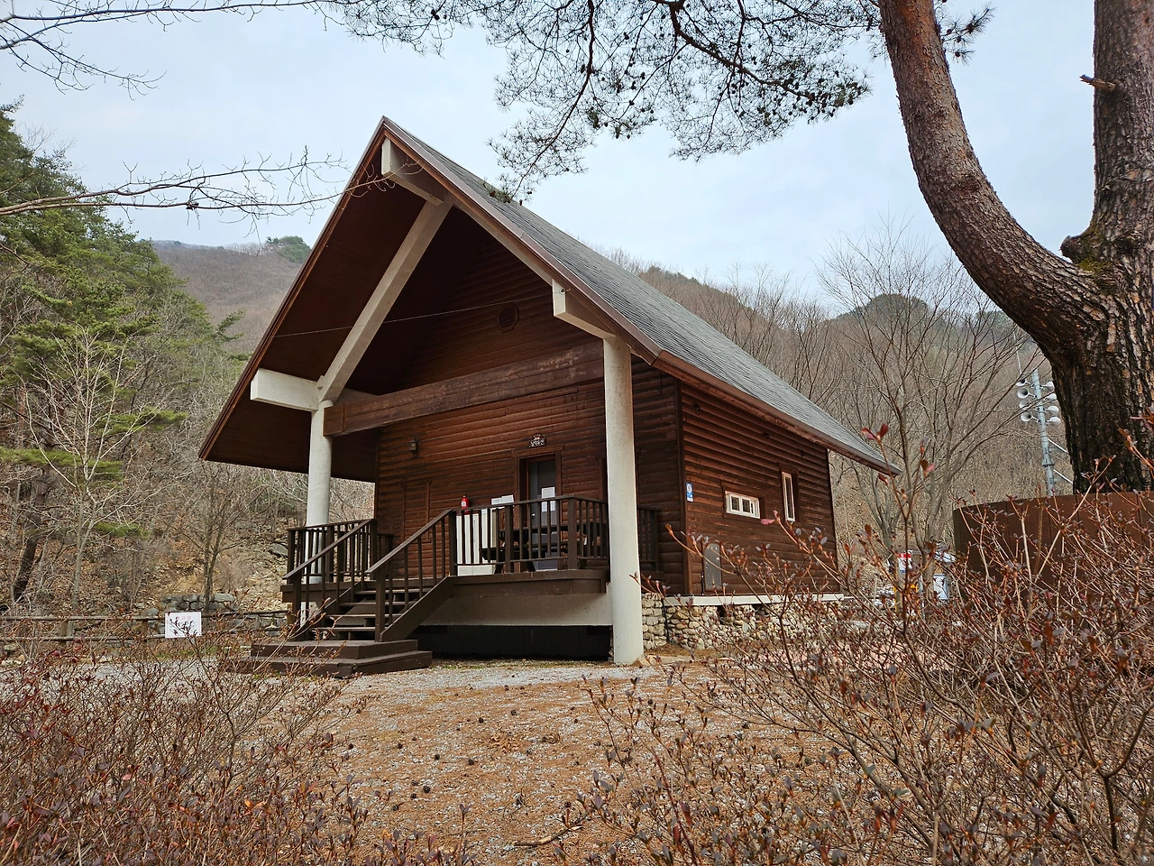 차를 차고 다시 휴양림 안쪽으로 들어갔다. 자연과 어우러져 잘 꾸며진 산책로가 눈에 들어왔다. 겨울을 이겨내고 있는 나무들과 맑은 물이 조화를 이루면서 아기자기한 모습을 자아내고 있었다. 가장 먼저 오토캠핑장이 나왔고, 다시 한 적한 길을 지나니 갈림길이 나왔다. 갈림길에서 직진으로 가면 산림문화휴양관이 나왔고, 다리를 건너서 가면 숲 속의 집과 계곡을 따라서 이어지는 산책로가 있었다. 조금 더 가니 숲 속의 집 지구가 있었다. 통나무집 총 4채가 있었다. 일부는 아직 수리 중이었고, 일부는 예약이 가능해 보였다. 한 채 한 채 웅장한 자태가 마음에 들었다. 바로 앞 쪽에 투숙객들만 오붓하게 이용할 수 있는 계곡이 있어서 여름이나 가을에는 상당히 인기 있는 숙소로 보였다. 경쟁률이 높아서 예약하기가 쉽지 않겠다는 생각이 들었다.