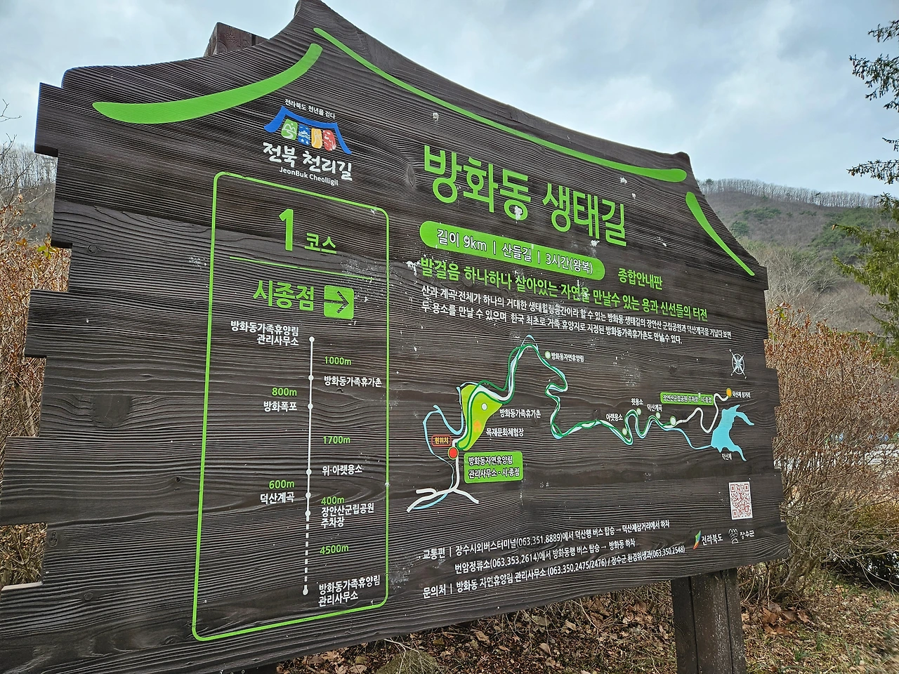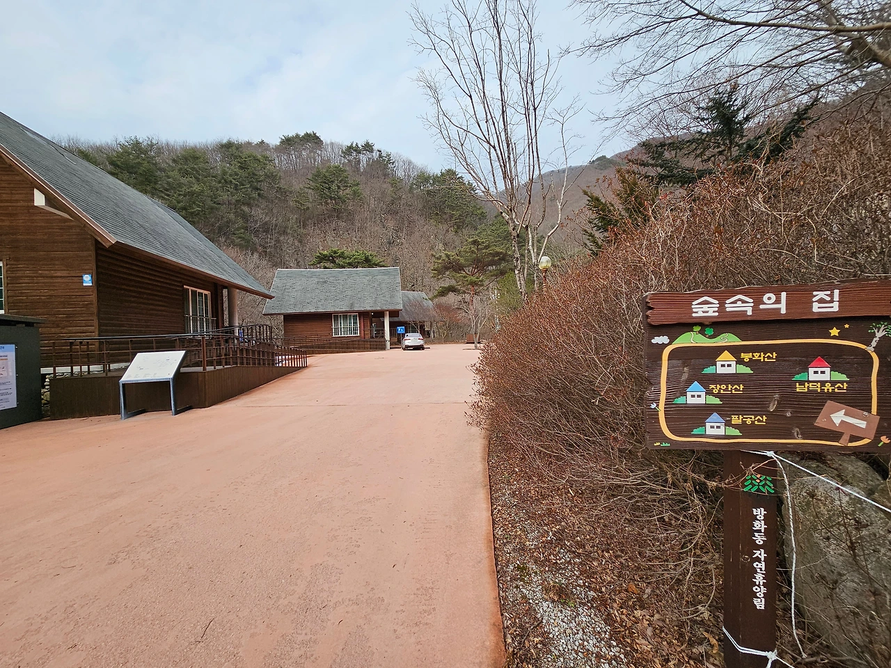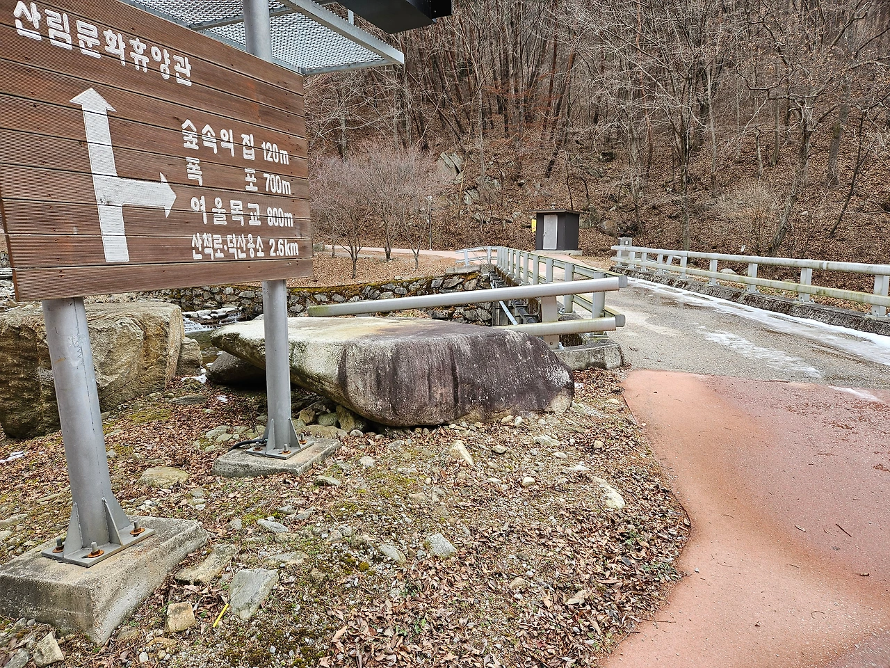 여기에서는 산행길도 이어진다. 장안산과 덕산계곡로 이어지는 길이다. 조금 난이도가 있는 길을 원한다면 방화동가족휴가촌에서 덕산계곡을 지나 범연동, 장안산에 이르는 등산코스를 선택해도 된다. 아쉽게도 살포시 겨울비가 내리기 시작하여 산책을 즐기지 못하고 다시 차를 돌렸다.