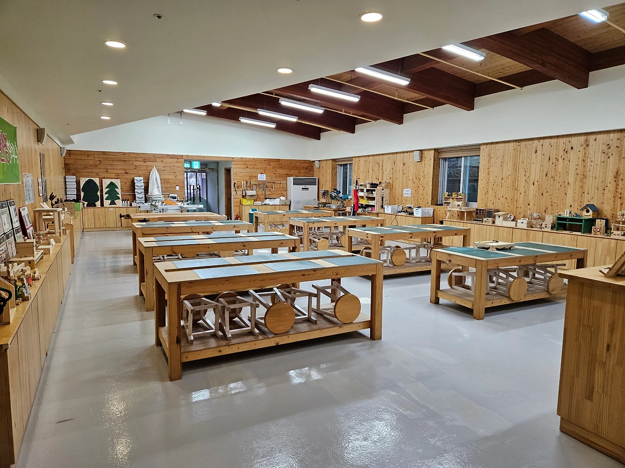 목재문화체험장은 웅장한 규모로 전시동과 다문화동으로 꾸며져 있었다. 어린이와 가족 단위 방문객을 위해 시계, 책꽂이, 도마 등의 제작이 가능했다. 우리 가족은 1만 원의 교재비를 내고 목공 체험을 진행했다. 40분 정도 열심히 사포질과 망치질을 해서 근사한 쟁반 하나를 만들었고, 아이는 환한 미소를 지으며 멋진 목공 작품을 가지고 숙소로 향했다.