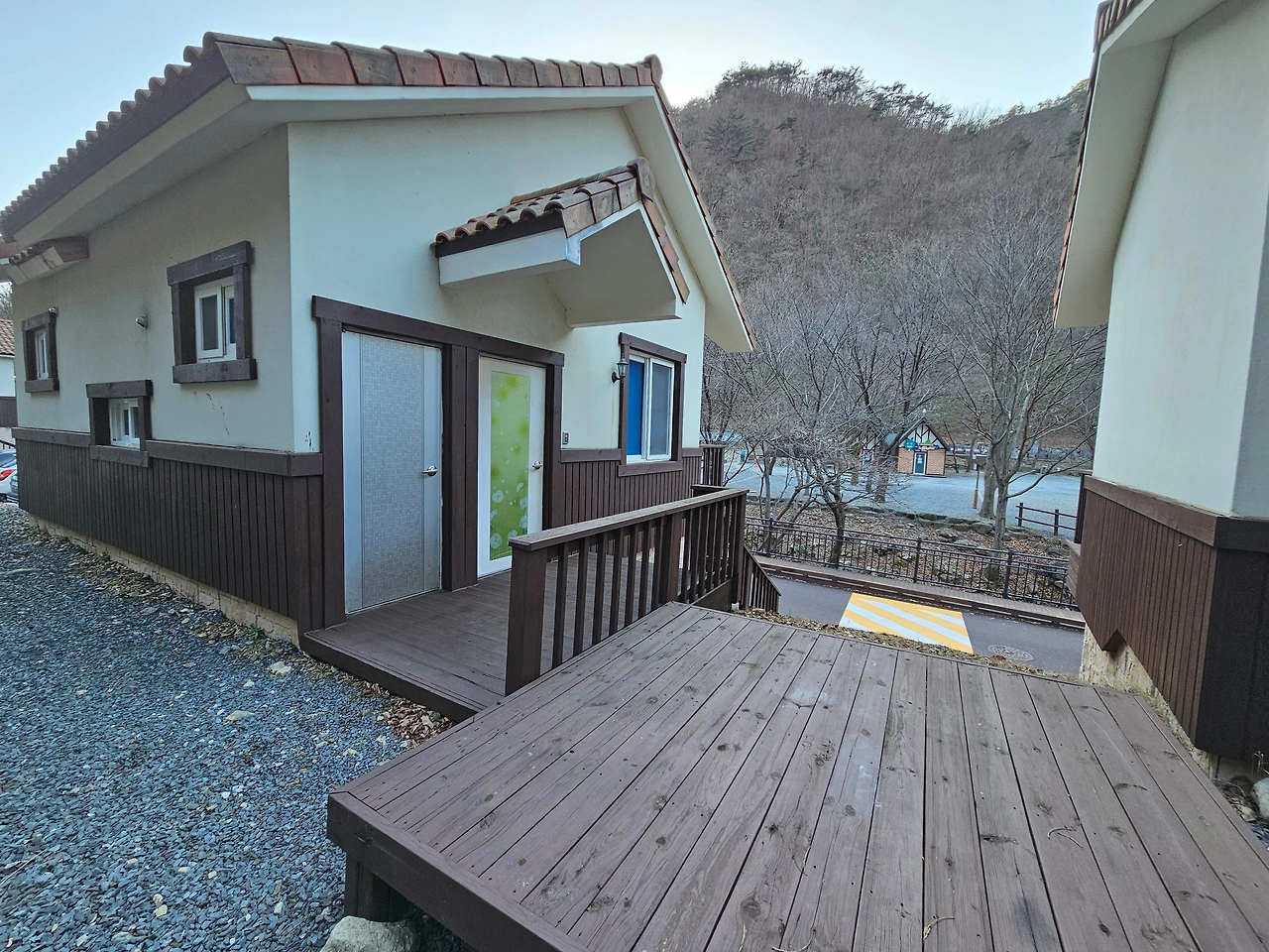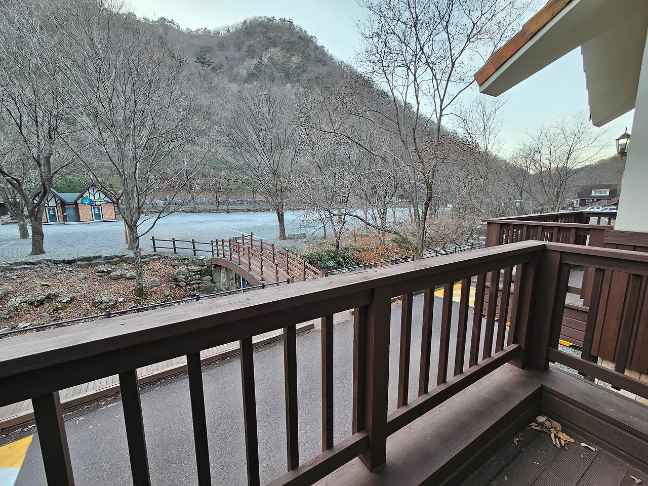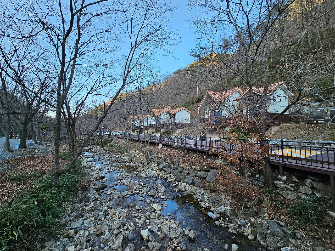 조금 더 달리니 커다란 광장이 나왔고 그 앞에 관리사무실 건물이 나왔다. 사무실에 들러서 키를 건네받고 바로 건너편의 숲 속의 집으로 향했다. 숲 속의 집은 개울 건너편에 나란히 위치하고 있었다. 맑게 흐르는 계곡이 눈앞에 펼쳐지고, 차량 이동이 쉽도록 앞으로 도로가 잘 정리되어 있었다. 숲 속의 집에는 테라스가 2개였다. 문을 열고 들어서면 깔끔하게 정리된 거실이 먼저 우리를 반겨주었다. 텔레비전과 넓은 통창이 눈에 들어왔고, 반대쪽에는 싱크대와 냉장고, 전자레인지 등이 잘 준비되어 있었다. 중간 통로에는 화장실이 있었고, 건너편에는 큰 방이 하나 있었다. 거실과 방에는 모두 테라스가 있었다. 테라스 밖으로 나가니 산뜻한 맑은 공기와 졸졸졸 흐르는 맑은 계곡물소리가 내게 웃음을 선물해 줬다.
