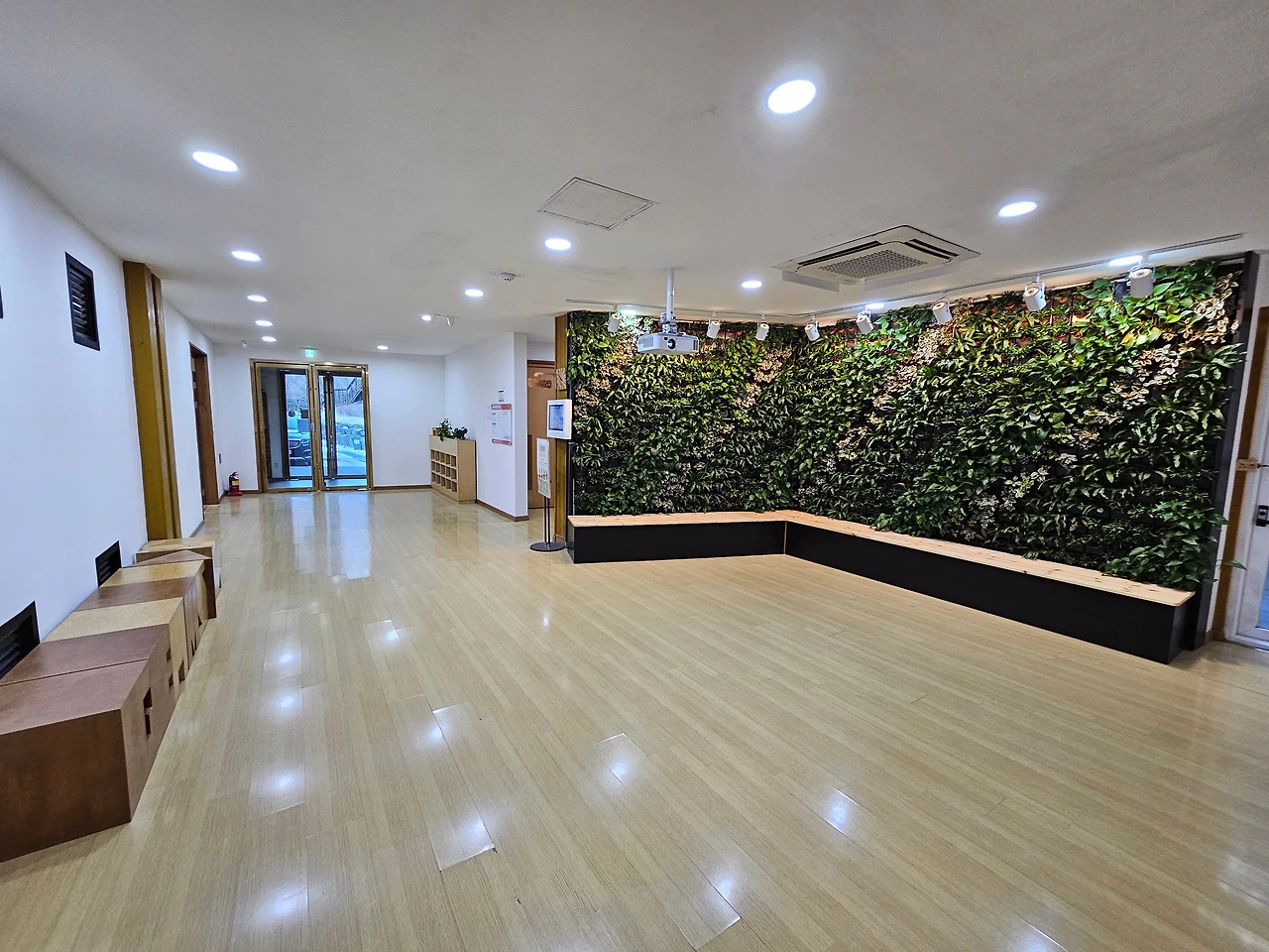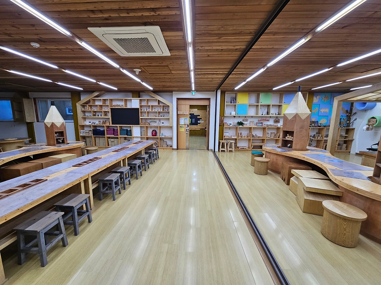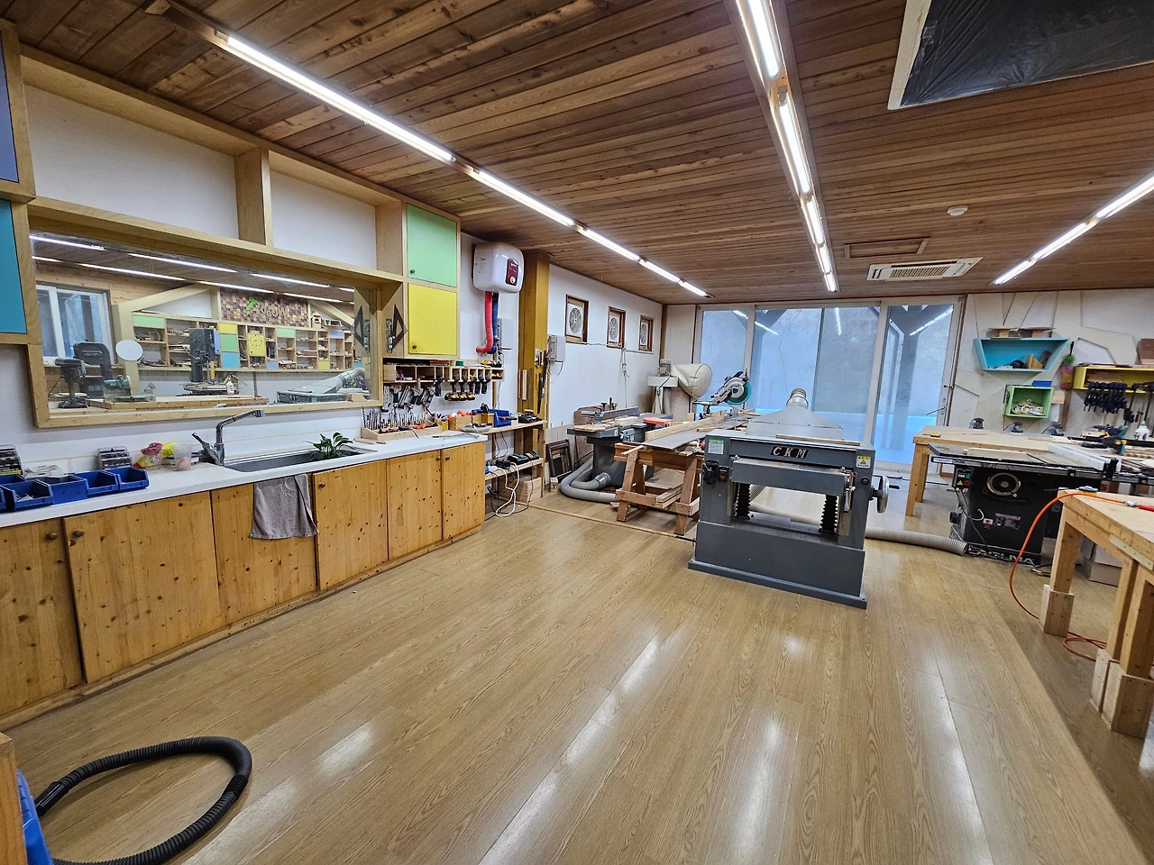 투명한 계곡물금산산림문화타운 가장 위쪽에는 목재문화체험장이 있었다. 가족들의 목공예 체험장이자, 아이와 함께 자연을 배울 수 있는 공간이 마련되어 있었다. 1층에는 어린이에서 성인들까지 다양한 목공수업을 할 수 있는 3개의 체험장이 있었고, 2층에는 목재문화에 대한 상설전시장과 목공작품이 전시되어 있는 기획전시장, 무인으로 운영되는 카페테리아, 아이들의 등반체험 공간이 있었다.