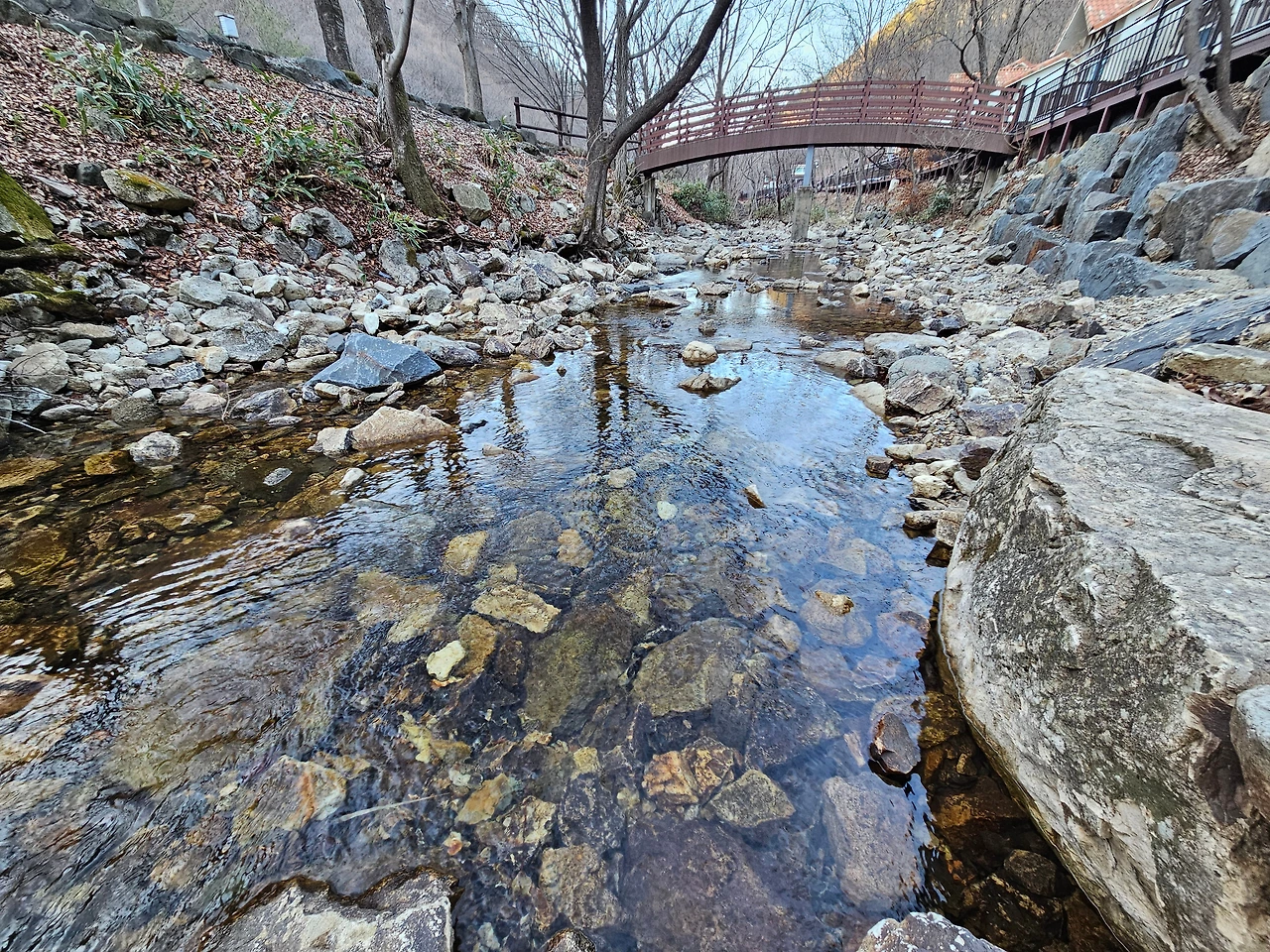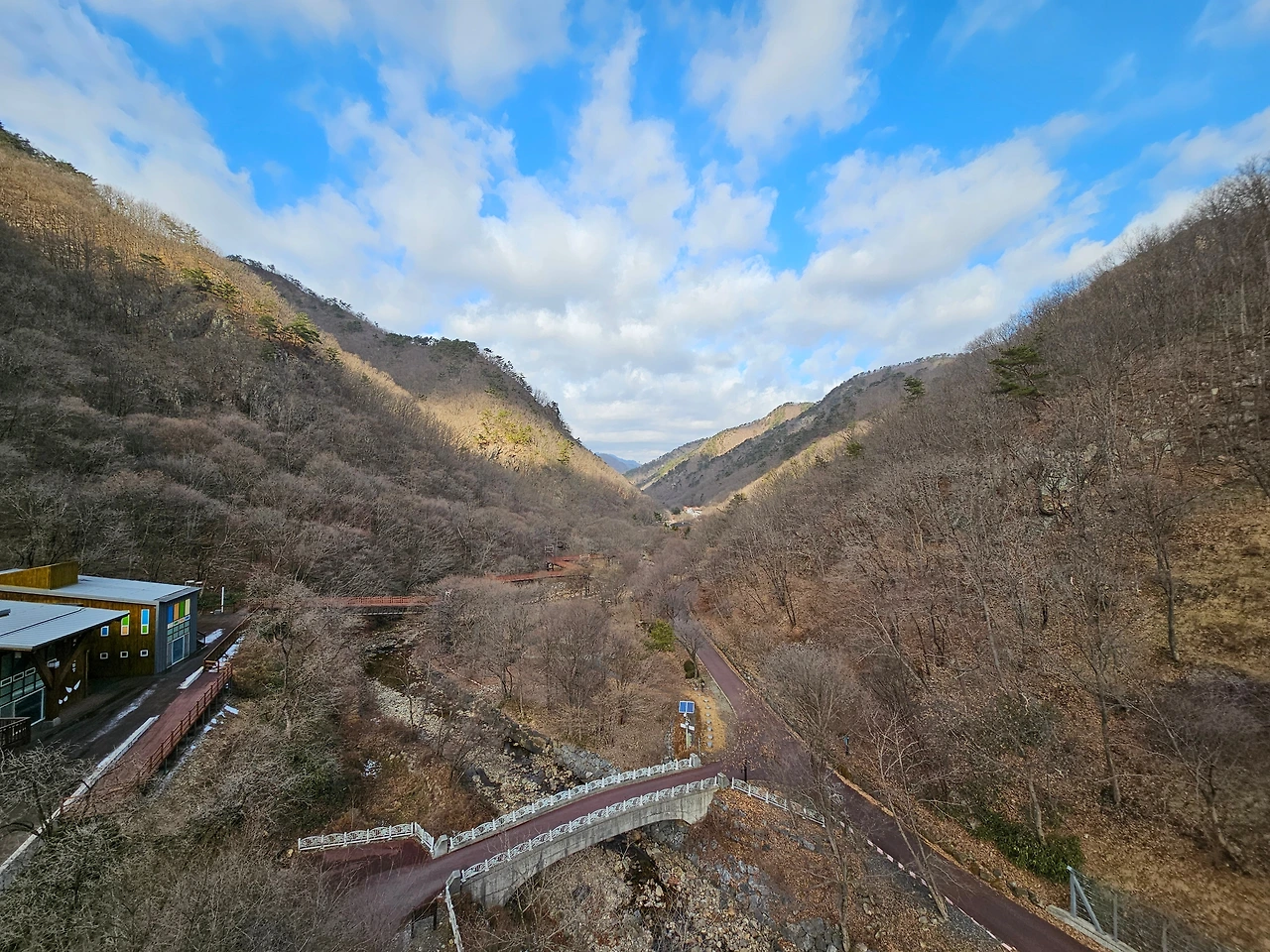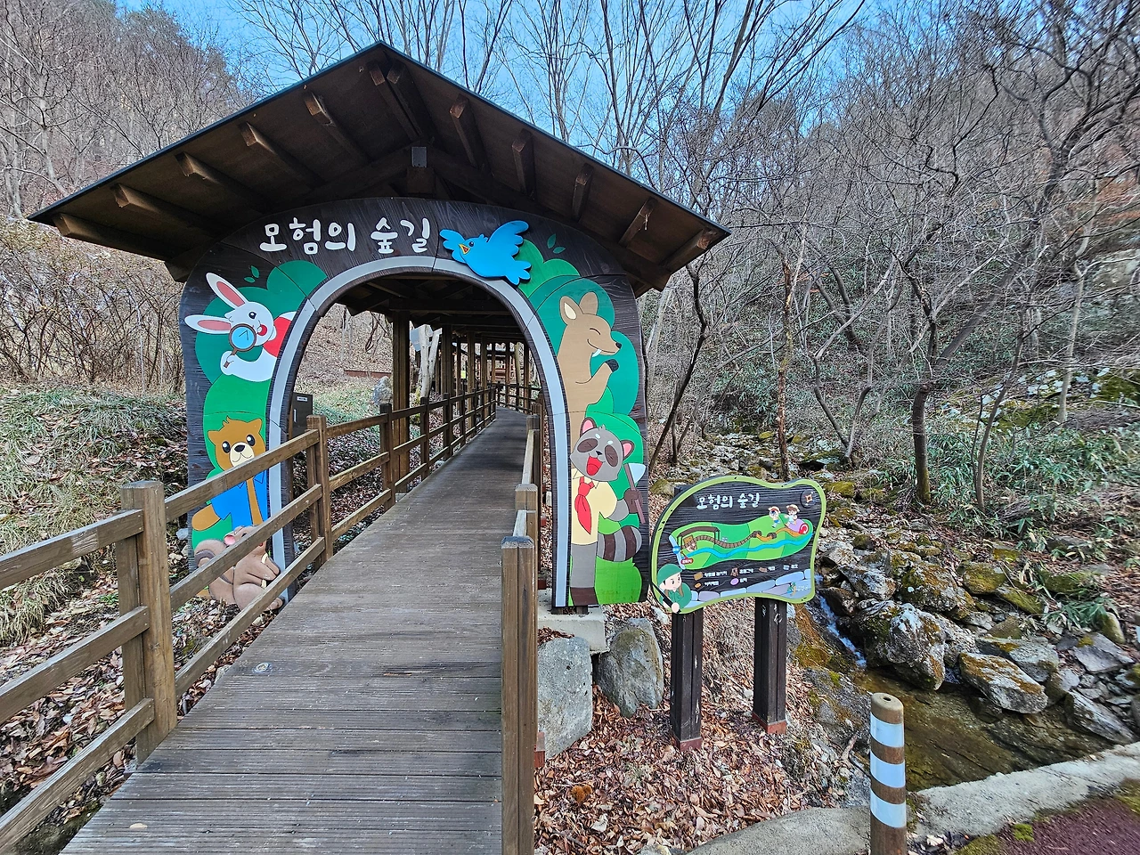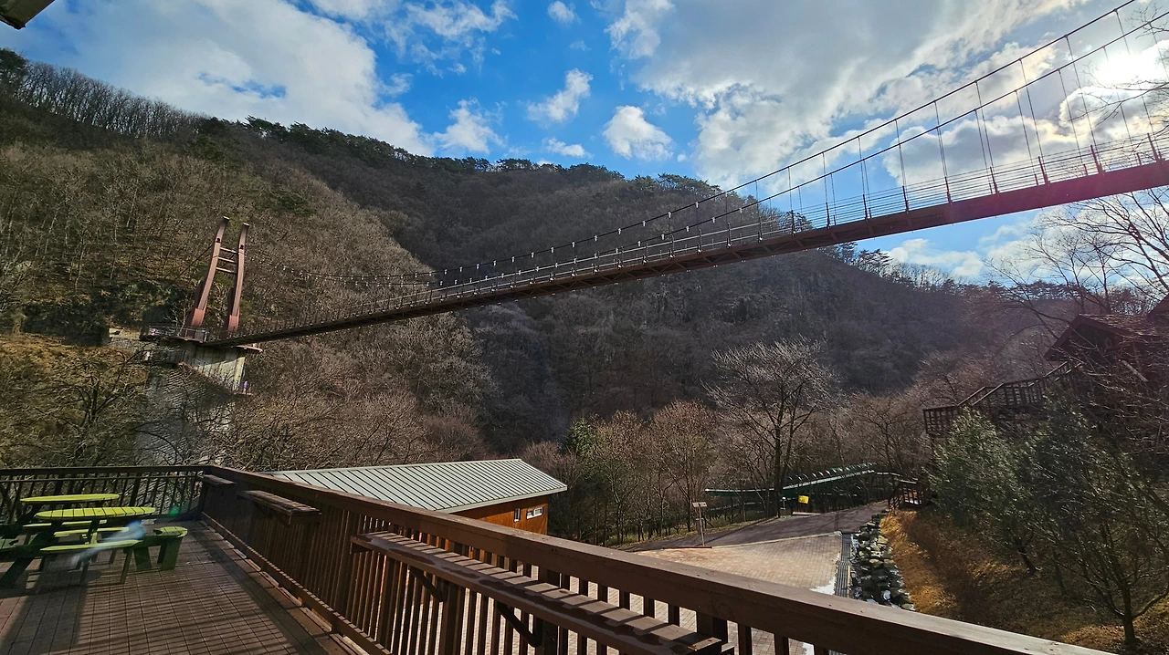 개울가 앞의 숲 속의 집 풍경 숲 속의 집 1채는 2개의 테라스를 가지고 있음 짐을 풀고 숙소 밖으로 나왔다. 아내와 아이의 손을 잡고 휴양림 산책에 나섰다. 가장 먼저 눈에 들어온 것은 길게 이어진 청정한 계곡이었다. 수량이 적은 겨울임에도 불구하고 맑은 물이 유쾌한 소리를 내며 흘렀다. 강우량이 풍부한 여름철에는 물놀이하기에 부족함이 없어 보이는 계곡이었다. 물소리를 따라서 산 위쪽으로 걸으니 산림휴양관이 나왔다. 유럽 알프스의 예쁜 산장처럼 지어진 2층 건물로 이곳에는 10여 채의 숙소가 있었다. 성수기 숲 속의 집 예약이 쉽지 않을 경우, 휴양관을 예약한다면 조금 쉽게 금산의 자연을 즐길 수 있다. 조금 더 위쪽으로 걸으면 자연생태관이 나온다. 동절기에는 운영하지 않기에 이곳은 그냥 패스하고 가장 보고 싶었던 하늘 다리를 향해서 산책로를 조금 더 걸었다.