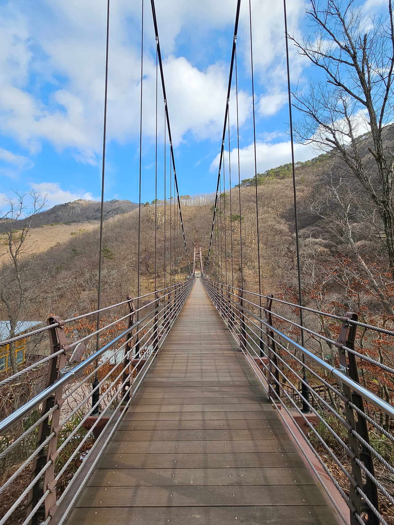 2층의 체험시설이제 남은 것은 하늘 다리. 목재문화체험장 카페에서 하늘 다리는 손으로 잡을 수 있을 정도로 가까이에 있었다. 몇 분만 걸으면 충분히 오를 수 있는 거리였다. 우리 가족은 설레는 마음으로 하늘 다리로 향했다. 계단이 조금 가파르기는 했지만 큰 무리는 없었다. 이윽고 하늘 다리 입구에 도착했다. 이곳에서 가장 높은 곳이기도 했다. 천천히 하늘 다리에 오르는 순간, 우리는 드넓게 펼쳐진 자연을 가슴에 품을 수 있었다. 콧 끝으로 살포시 스쳐 지나가는 바람의 느낌이 좋았고, 살짝 흔들리는 하늘 다리의 움직임도 재미를 선사해 주었다. 열심히 사진을 찍어가면서 하늘 다리를 즐겼다. 하늘 다리 중간에 서서 휴양림을 살피니 저 멀리 대둔산의 모습이 보이기도 했다.