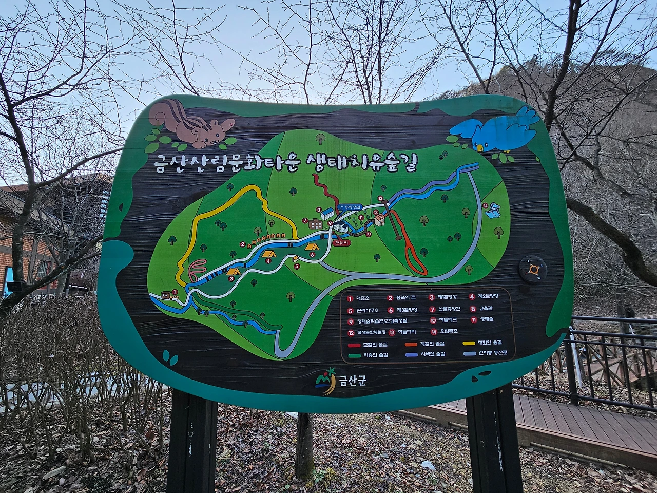 인삼이 유명한 충청도 금산읍내에서 차를 타고 30분정도 달리면 깊은 산골에 숨겨진 힐링 마을이 나온다. 아무도 상상하지 못한 숲 속에 자리잡은 조용한 휴양림, 여기가 금산산림문화타운이다.