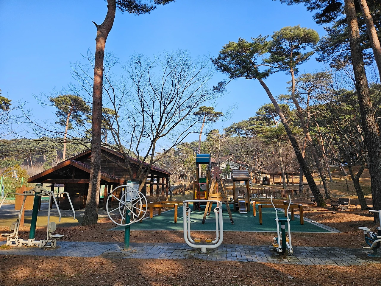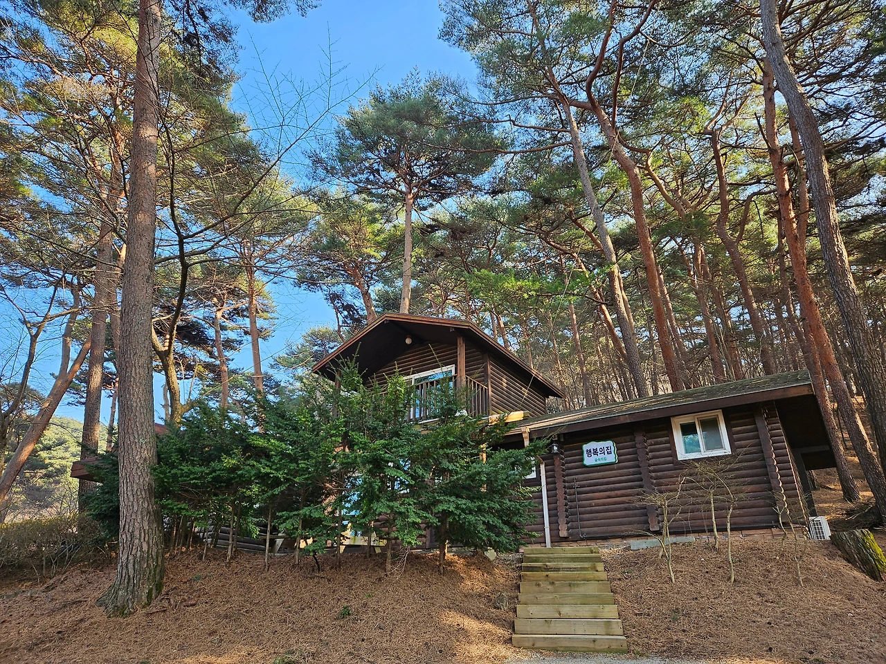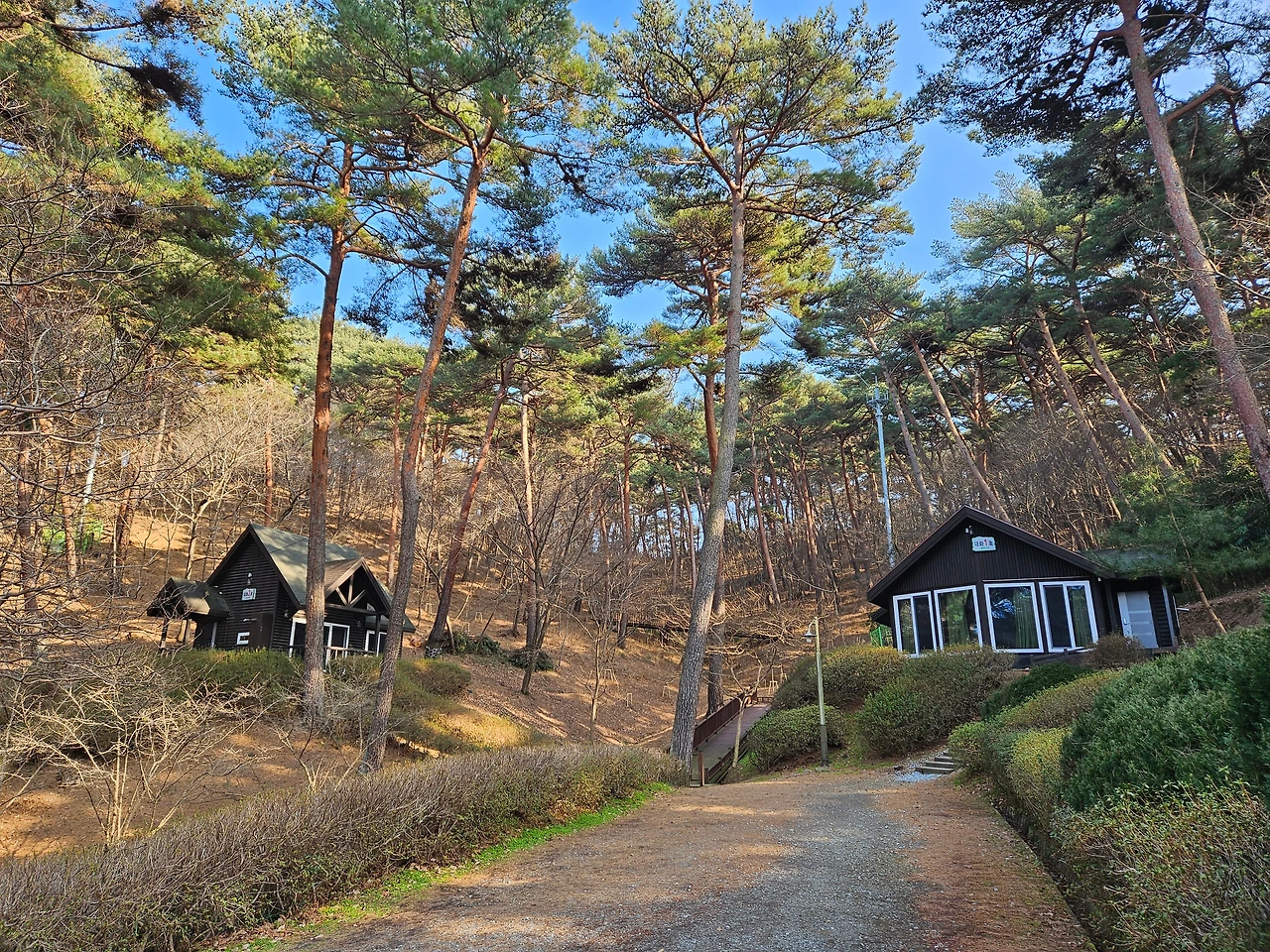 왼쪽으로 가면 산림휴양관이 나오고 직진을 하면 산자락에 일렬로 옹기종기 모여있는 숲 속의 집을 만날 수 있다. 산림휴양관에는 사진에서 보는 것처럼 4개의 객실이 있고 그 앞에는 피크닉장과 축구장, 농구장, 어린이 놀이터가 있다. 단체로 여행을 오거나 대단위 가족들에게 적합한 숙소였다.