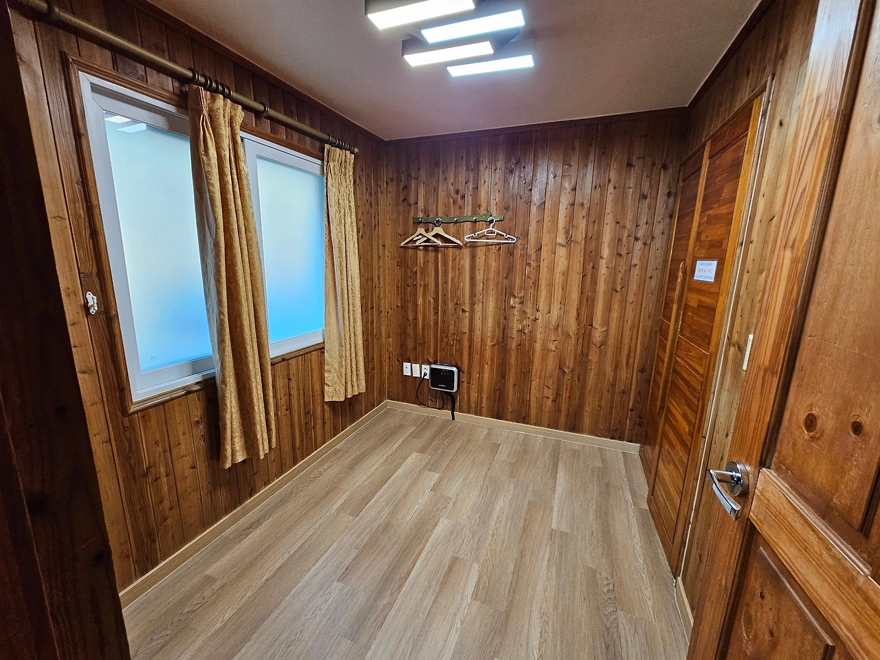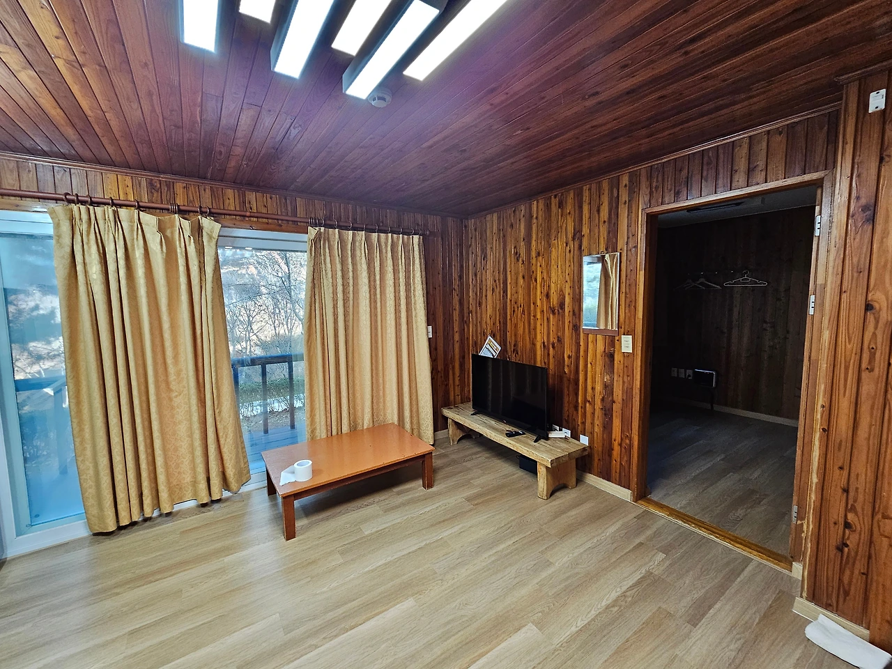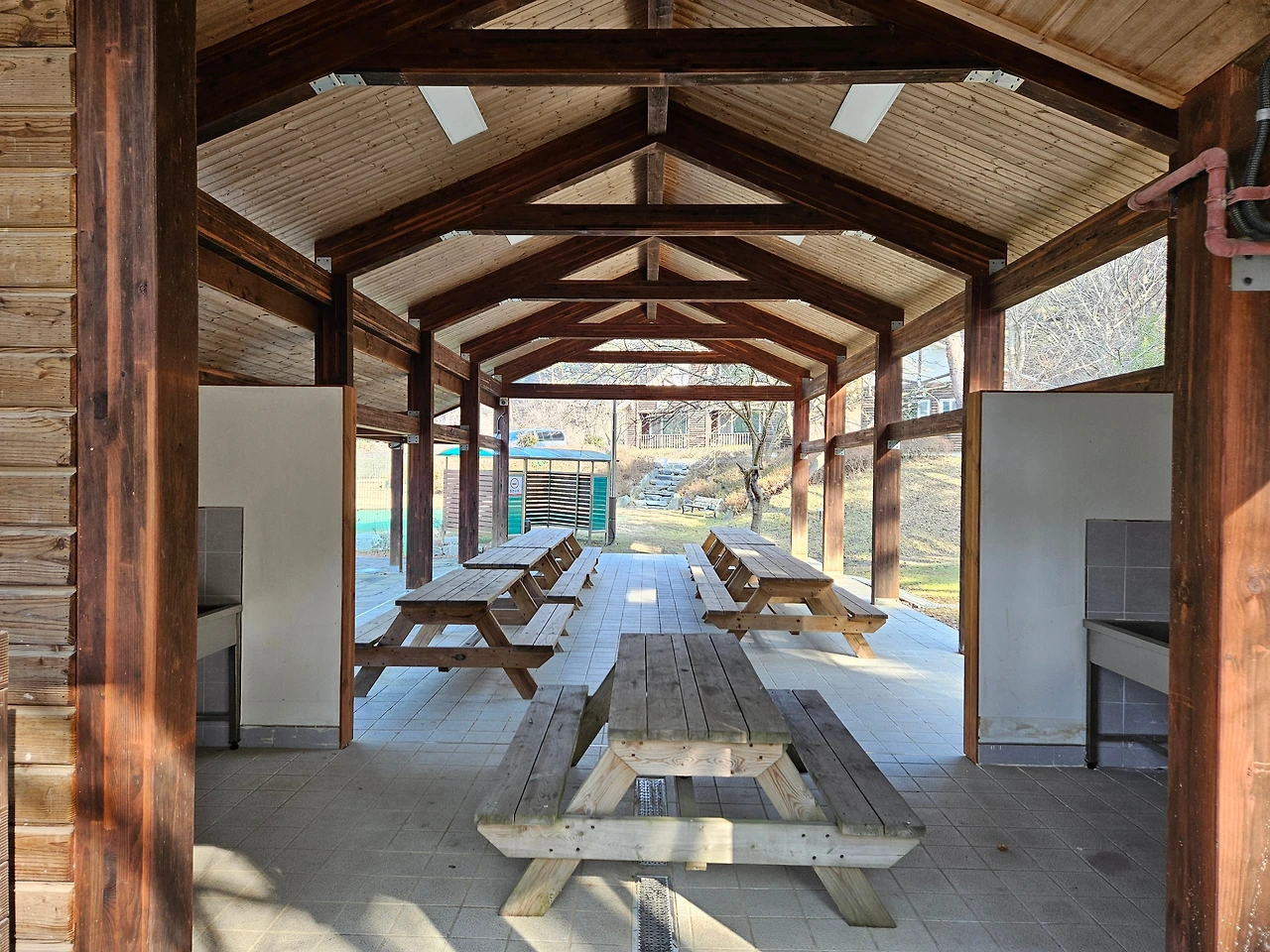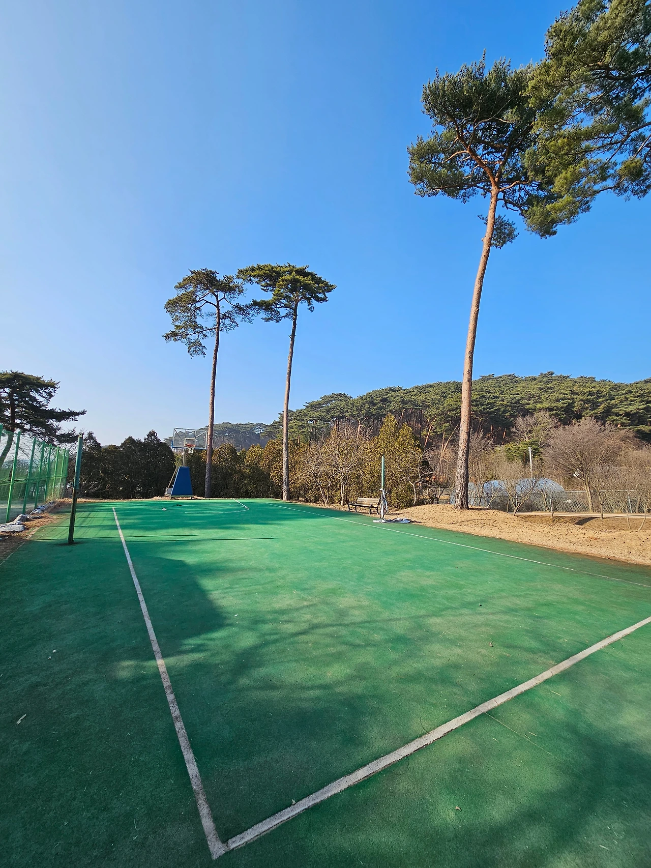 왼쪽으로 가면 산림휴양관이 나오고 직진을 하면 산자락에 일렬로 옹기종기 모여있는 숲 속의 집을 만날 수 있다. 산림휴양관에는 사진에서 보는 것처럼 4개의 객실이 있고 그 앞에는 피크닉장과 축구장, 농구장, 어린이 놀이터가 있다. 단체로 여행을 오거나 대단위 가족들에게 적합한 숙소였다.