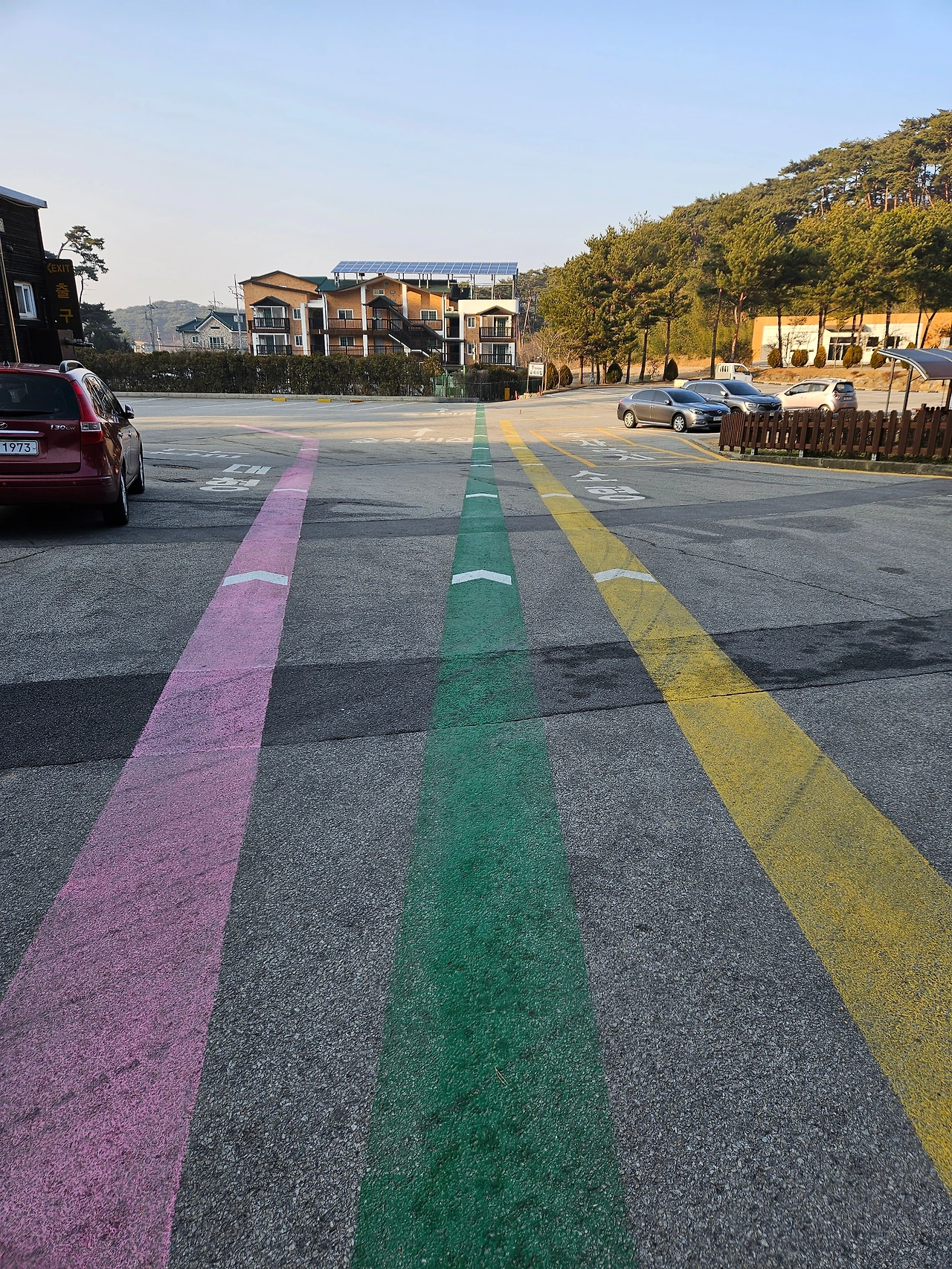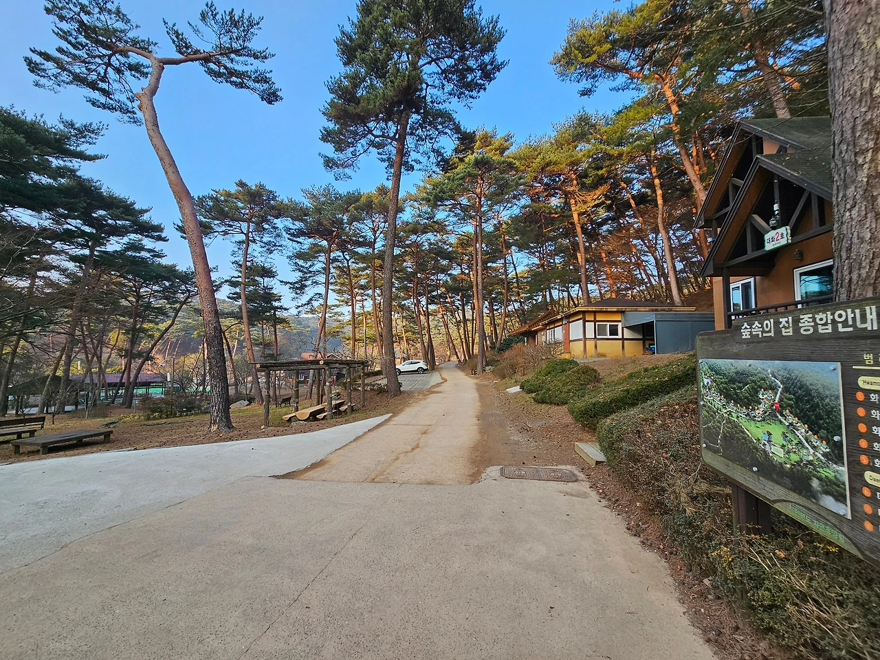 주차장에 잠시 차를 정차하고 입구로 가면 숙소 키를 전달받을 수 있었다. 휴양림 중간에는 소나무 숲이 있기에 산책만 가능하고 차량으로 이동할 수 없다. 대신 주차장 왼쪽으로 이어지는 외곽도로를 이동해야만 소나무 숲 반대편의 숲 속의 집을 만날 수 있다. 담당자가 설명해 준 대로 녹색 도로안내선을 따라서 차를 타고 이동했다. 그 길을 따라서 울타리 옆으로 이어진 작은 고개를 넘어서면 휴양림의 숙소들이 하나둘씩 나타나기 시작한다.