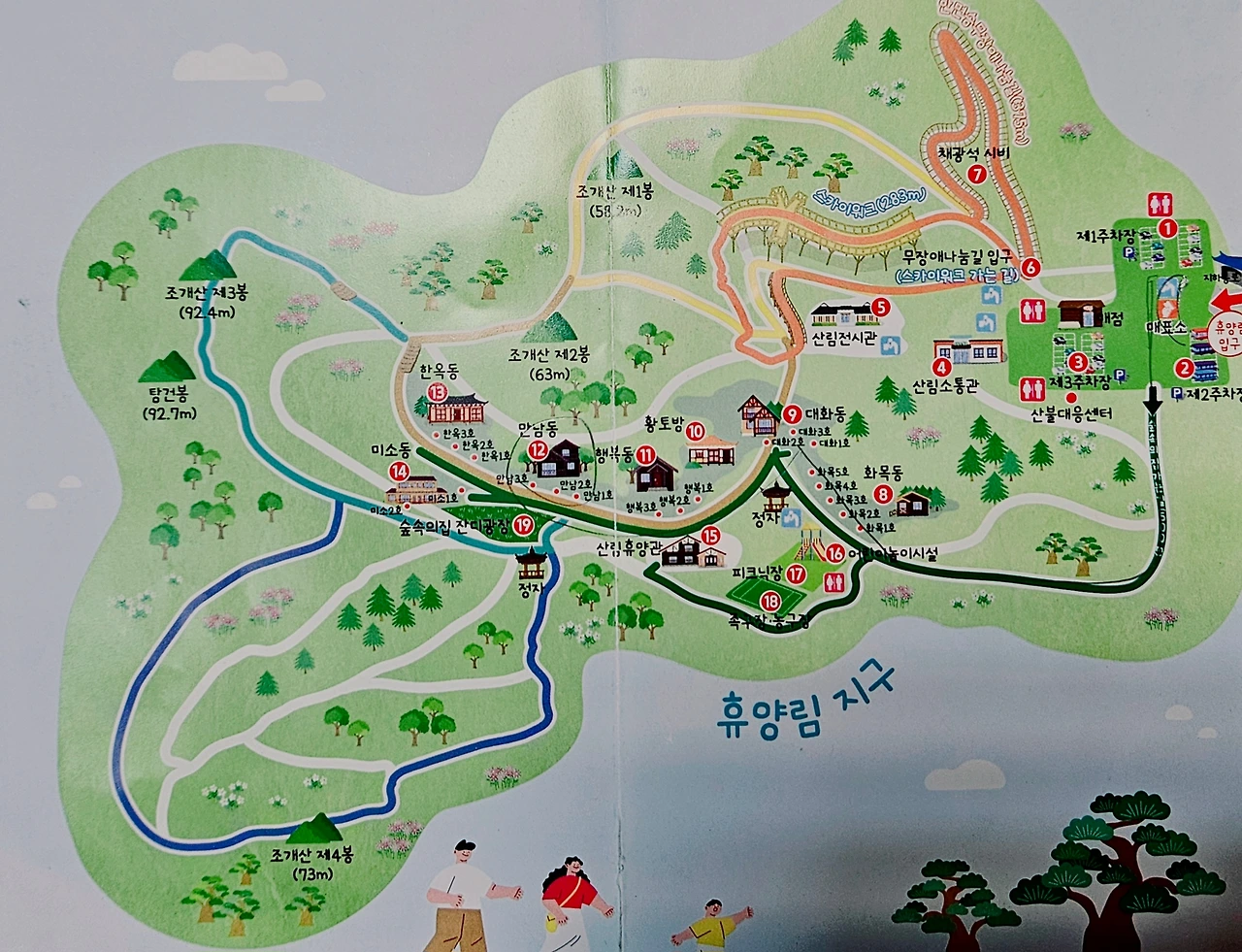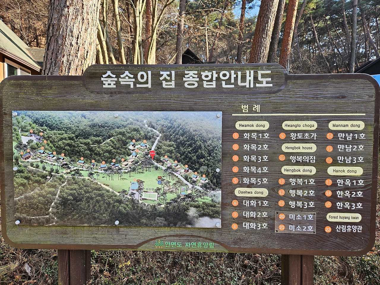 우리는 만남 3호라는 숲 속의 집을 찾아서 직진을 했다. 바로 옆에 5동의 숲 속의 집이 나왔는데 화목동이라고 적혀있었다. 우리 방은 아니었다. 잠시 차에서 내려서 안내판을 둘러보았다.