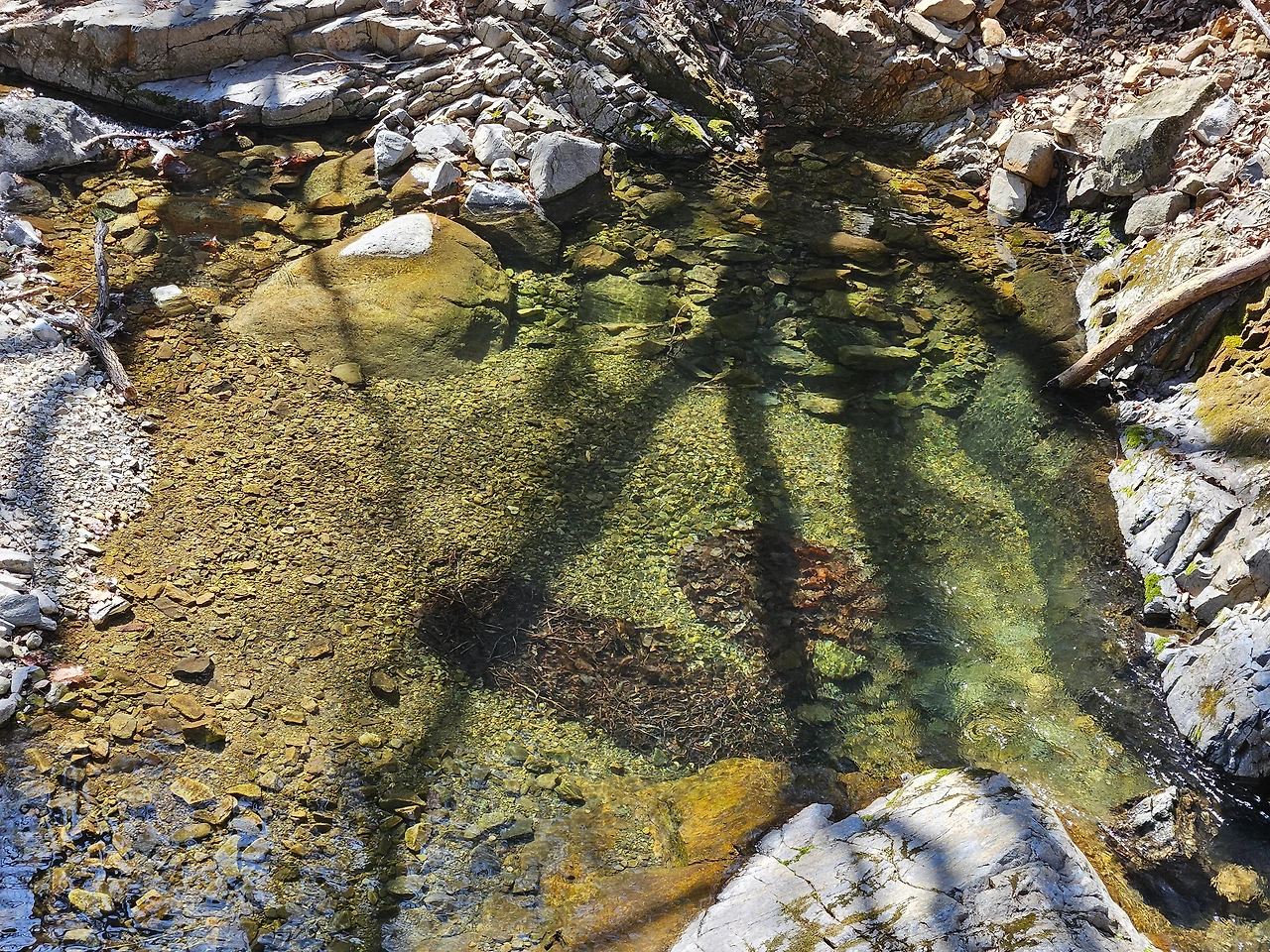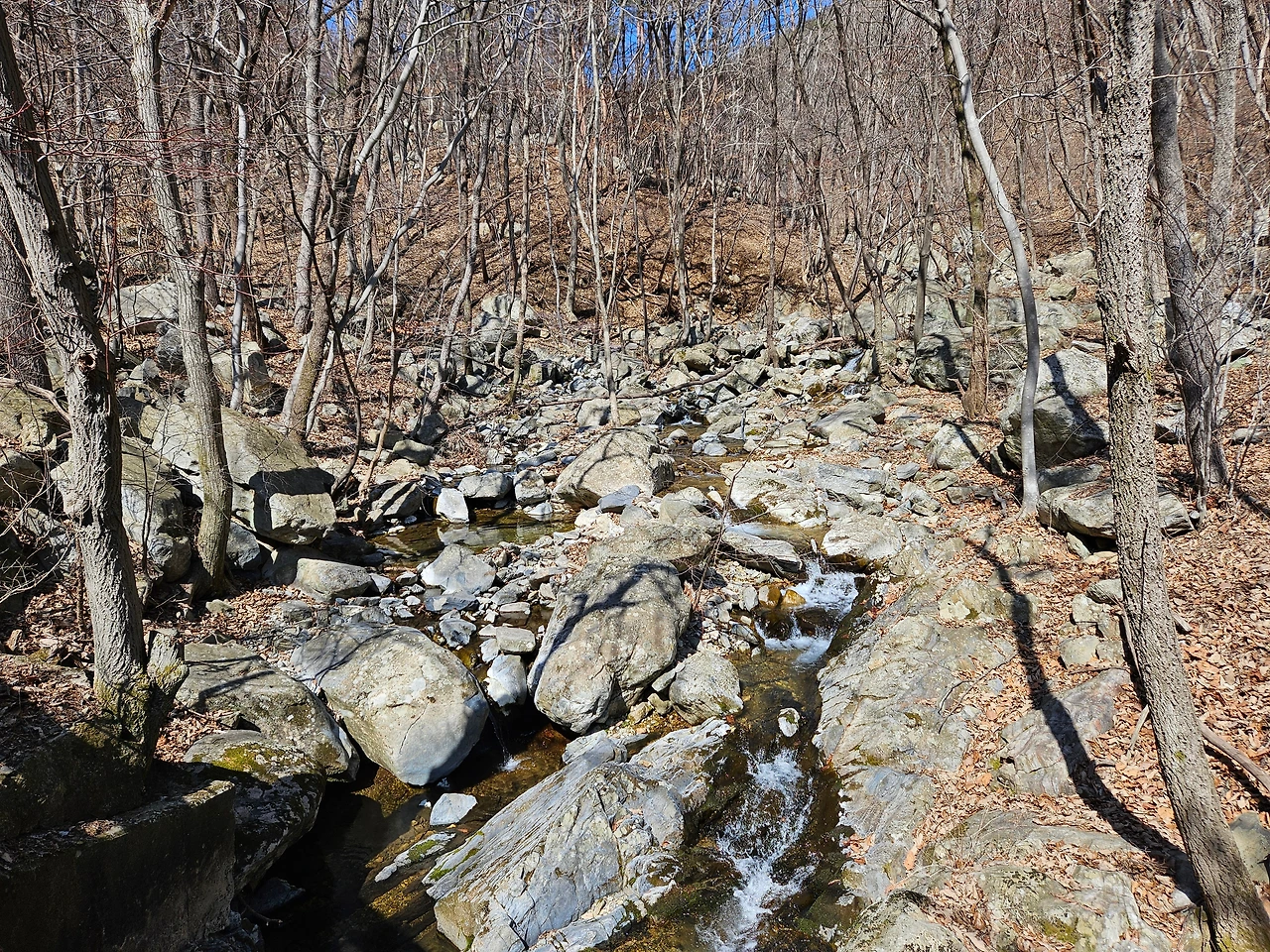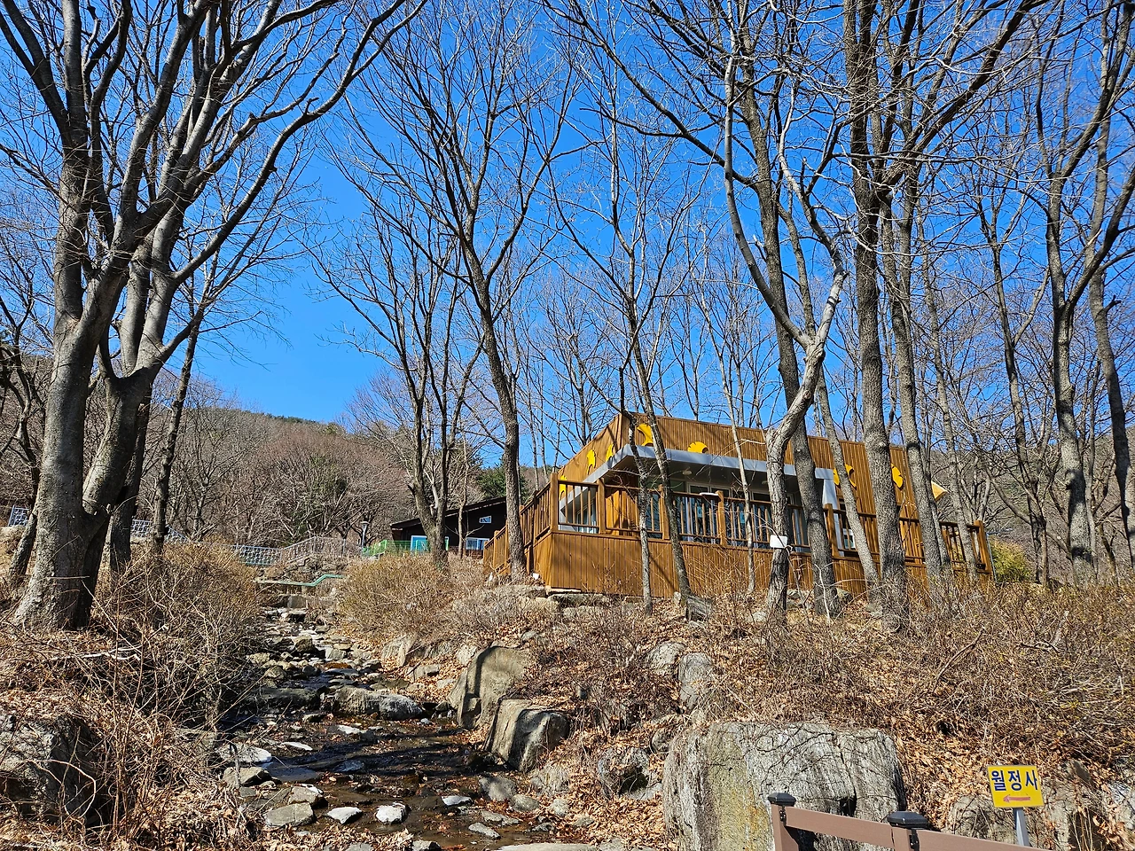 이곳부터는 길이 좁아서 버스 진입이 어렵다고 했다. 휴양림으로 올라가는 길은 포장은 잘 되어 있었지만, 길은 그리 넓지 않았다. 2대의 차량이 교차하기 쉽지 않았다. 혹여나 위쪽에서 자동차가 내려오지 않을까 조심조심 운전대를 잡았다. 조금 오르다 보니 주차할 수 있는 작은 공간이 나왔다. 잠시 차에서 내려서 계곡 옆으로 갔다. 산 위에서 흘러내려오는 맑은 계곡물이 눈에 들어왔다. 금방이라도 물속으로 풍덩 뛰어들고 싶다는 유혹이 느껴질 정도였다. 잠시 물멍 타임. 아무 생각 없이 맑은 물을 바라봤다.