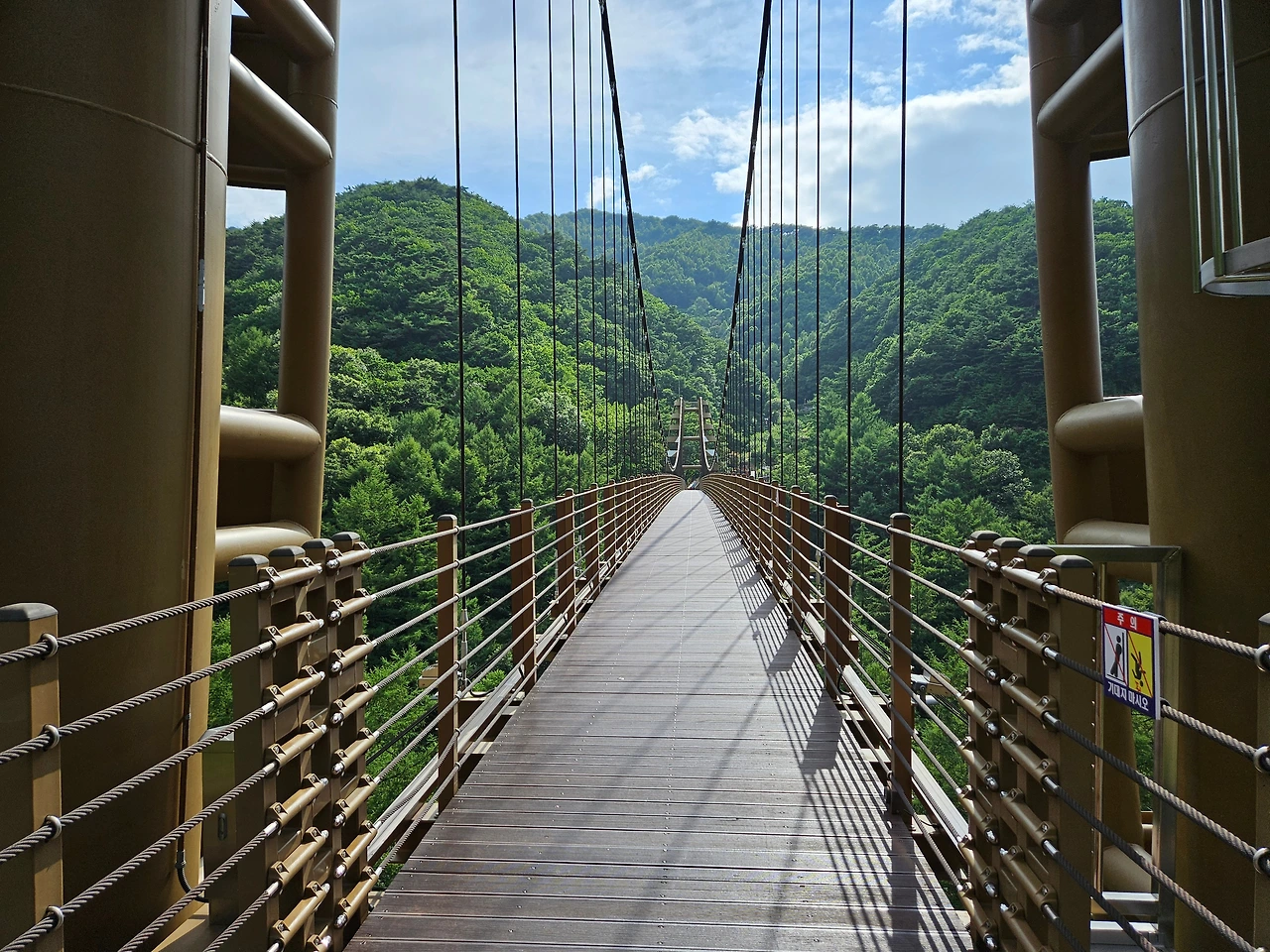다시 조금 더 내려왔다. 천문대에서 숲 속의 집 입구를 지나서 다시 내리막 길을 내려왔다. 오는 길에 보았던 멋진 구름다리를 보기 위해서였다. 숲 속의 집에서 약 7~8분 정도를 걸어서 내려오면 근사한 구름다리가 있었다. 떨리는 마음으로 구름다리 입구로 향했다. 안전상의 이유로 운영되는 시간이 오후 18시까지라고 적혀 있었다. 눈으로 봐도 상당히 긴 거리였다. 중간쯤 가니 바람을 따라서 구름다리가 흔들렸다. 살짝 떨리는 기분. 오우~라는 감탄사가 나왔다. 중간에 서서 다리 아래로 펼쳐지는 풍경을 살폈다. 저 멀리 증평의 멋진 풍경이 그대로 펼쳐졌고 반대편으로는 좌구산의 계곡과 함께 산 위의 천문대가 저 멀리 보였다. 잠시 눈을 감고 바람을 즐겼다. 한 여름이었지만 시원한 계곡 바람이 내 뺨을 스쳐 지나갔다. 땀으로 젖은 내 몸을 산뜻하게 바람으로 샤워시켜 주는 그런 기분. 아무도 없었기에 두 팔을 위로 들고 바람의 싱그러움을 즐겼다.