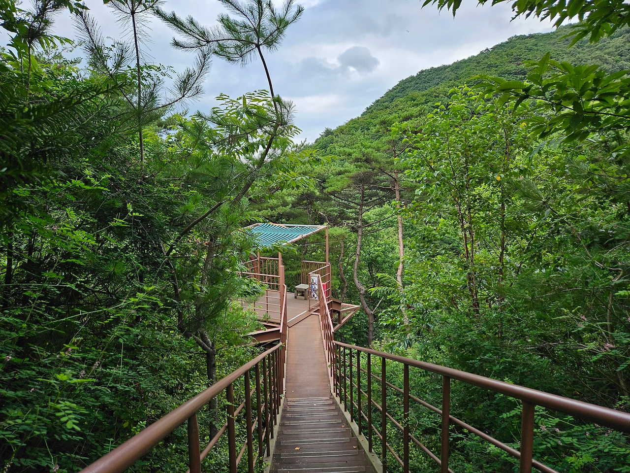 실제는 아이가 된 것처럼 구름다리를 몇 번 오고 갔다. 보는 이들이 거의 없었기에 산책 겸 운동으로 구름다리 왕복. 바람에 흔들림이 마치 놀이기구를 타는 듯한 기분이었다. 이번에는 좌구산의 계곡을 보고 싶어서 아래로 내려갔다. 산책로에서 들리는 계곡물소리를 따라서 아래로 내려갔다.