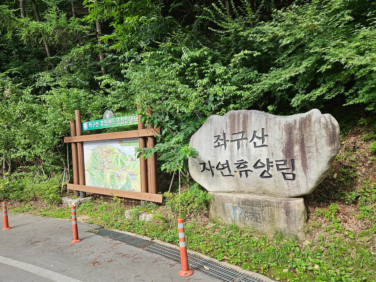서울에서 출발하여 죄구산 자연휴양림까지는 약 1시간 30분이 걸렸다. 가는 길에 시원한 천연 광천수 초정약수 한 잔을 마시고 좌구산 휴양랜드로 향했다. 10여분 정도를 더 달리니 오늘의 최종 목적지인 좌구산 입구가 눈앞에 보였다. 좌구산이란 이름은 산의 모양이 거북이가 앉아 남쪽을 바라보는 형상이라고 하여 붙여진 이름이다. 산의 높이는 657미터로 근처에서 가장 높은 산이기도 하다. 행복과 장수를 상징하는 거북이가 앉아있는 형상이기에 오래전부터 많은 이들이 기(氣)가 좋은 좌구산 계곡을 찾아서 휴식을 취했다고 한다.