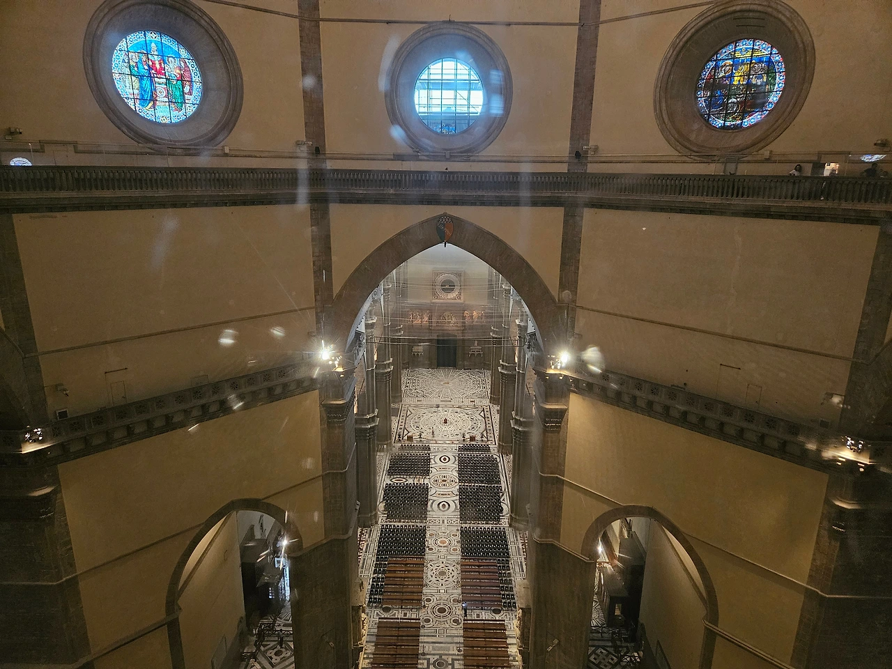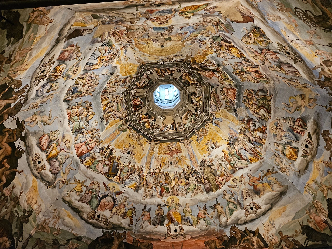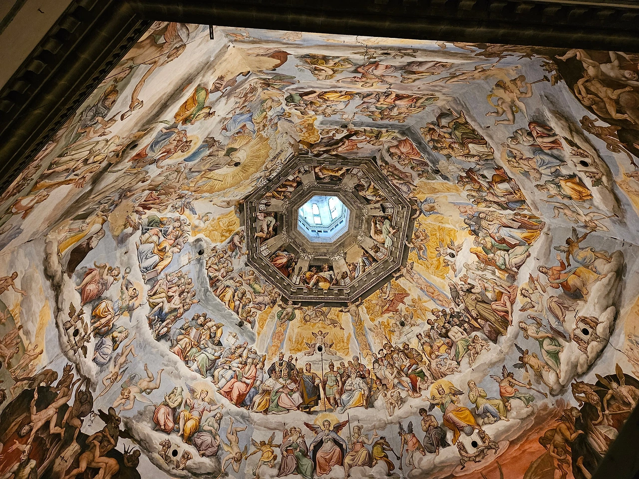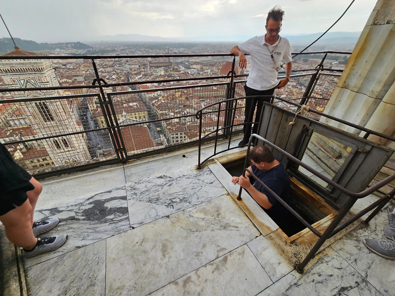 이제 절반 정도 올라온 듯했다. 내려오는 사람들과 교차해야 했기에 잠시 중간 지점에서 대기해야 했다. 아래로 잘 정돈된 성당 내부가 한눈에 들어왔고, 위쪽으로는 둠 아래로 화려하게 그려진 벽화가 눈에 들어왔다. 바티칸만큼은 아니었지만 그래도 화려한 그림들이 천장을 가득 채우고 있었다. 다들 거친 숨을 돌려가면서 그곳에서 여기저기 사진을 찍고 있었다. 위에서 내려오는 사람들이 반대로 내려간 이후에 다시 우리는 계단을 올랐다. 이곳부터는 경사가 더욱더 가팔랐다. 실제로 올라가는 것이 쉽지 않았다. 숨소리가 더욱 거칠어졌다. 마치 여행 프로그램에서 보는 피라미드 오르는 듯한 느낌이었다. 그렇게 얼마를 올라갔을까? 저 멀리서 광명이 보이기 시작했다. 정상이었다. 실제로 약 20분 정도가 걸린 듯했다.