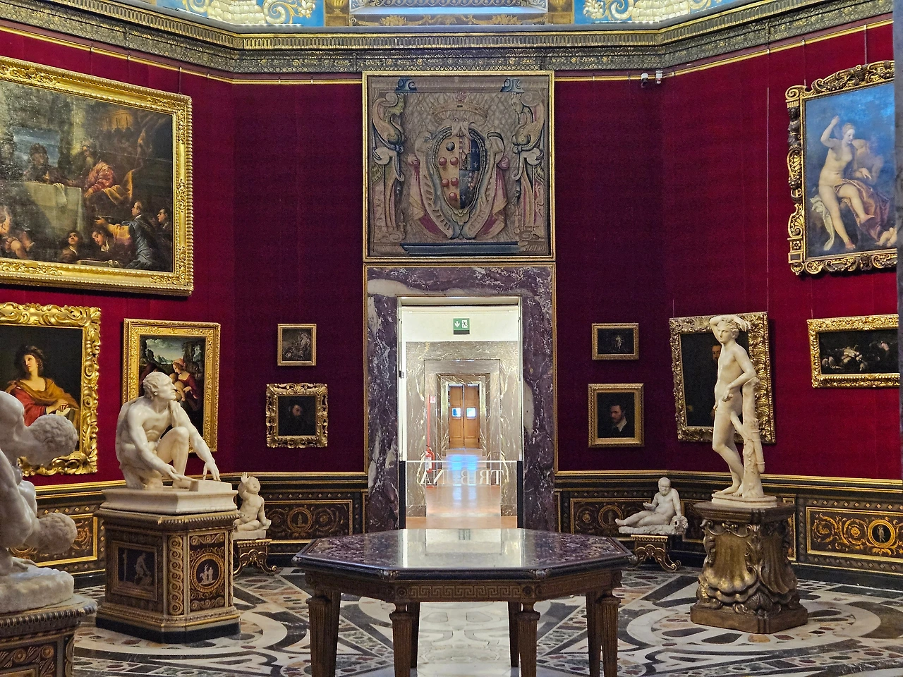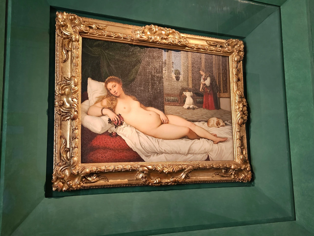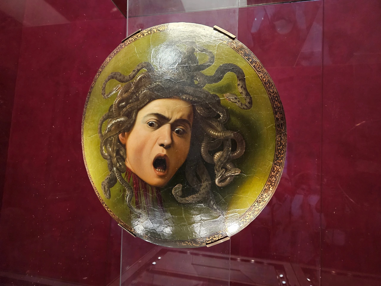 빠르게 1층 전시실로 내려와서 남은 작품들을 감상했다. 르네상스 이후의 작품들이 하나둘씩 보이기 시작했고 특히 인물화들이 많이 등장했다. 메디치 가문의 그림들이 많았고 역시 부와 명성을 지난 가문인만큼 자태와 옷들이 하나같이 고급스러움 그 자체였다. 1층에서 가장 눈에 들어온 작품은 우르비노의 비너스와 메두사라는 작품. 우르비노의 비너스는 티치아노가 1538년 그린 작품으로 가장 완벽한 여성의 아름다움을 표현한 그림으로 꼽힌다. 후대 화가들에게 직접적인 영향을 주었다고 전해지며 장미꽃은 비너스를, 강아지는 영원한 사랑을 상징한다고 했다. 마지막으로 가장 인상 깊게 남은 카라바조의 메두사. 바로크 시대 대표화가인 카라바조가 방패에 그린 메두사. 정말 사실적이고 섬뜩한 느낌을 그대로 주는 그림이었다. 그 강렬함이 우리의 시선을 사로잡았다.