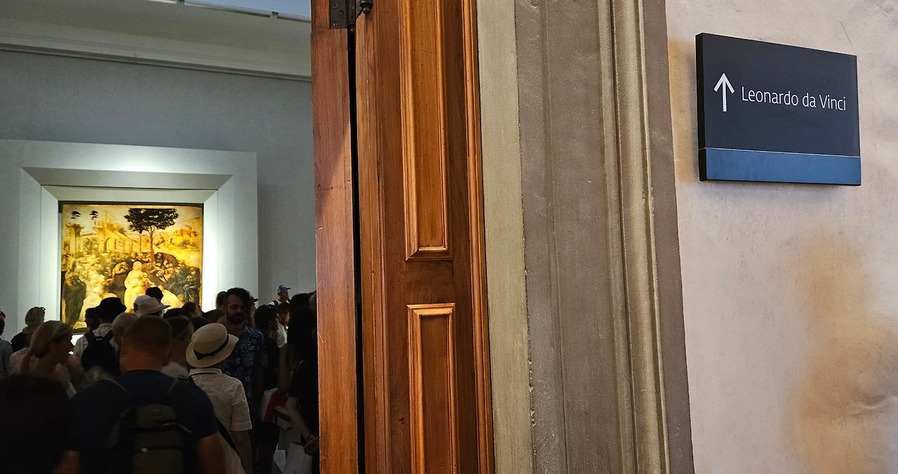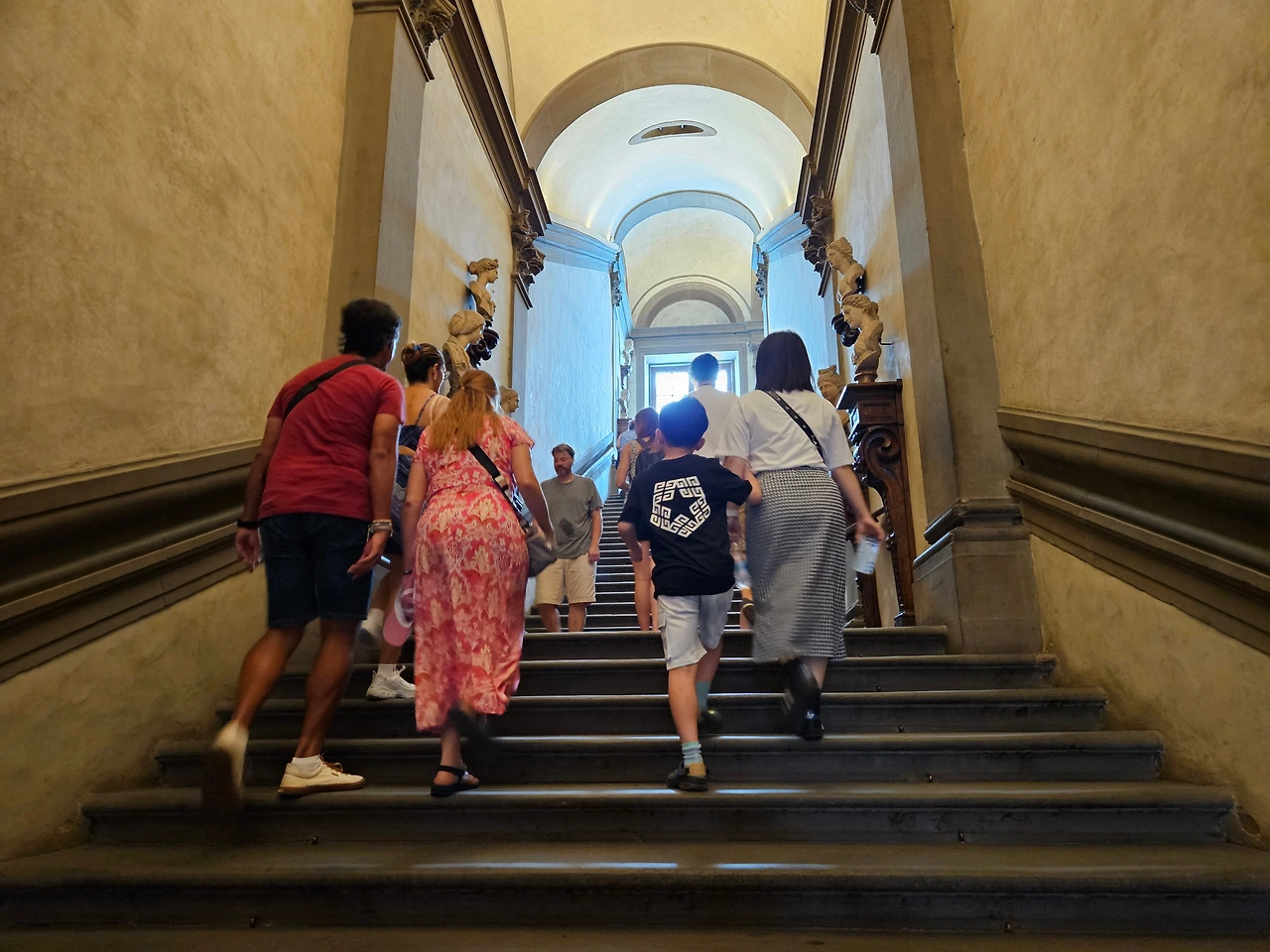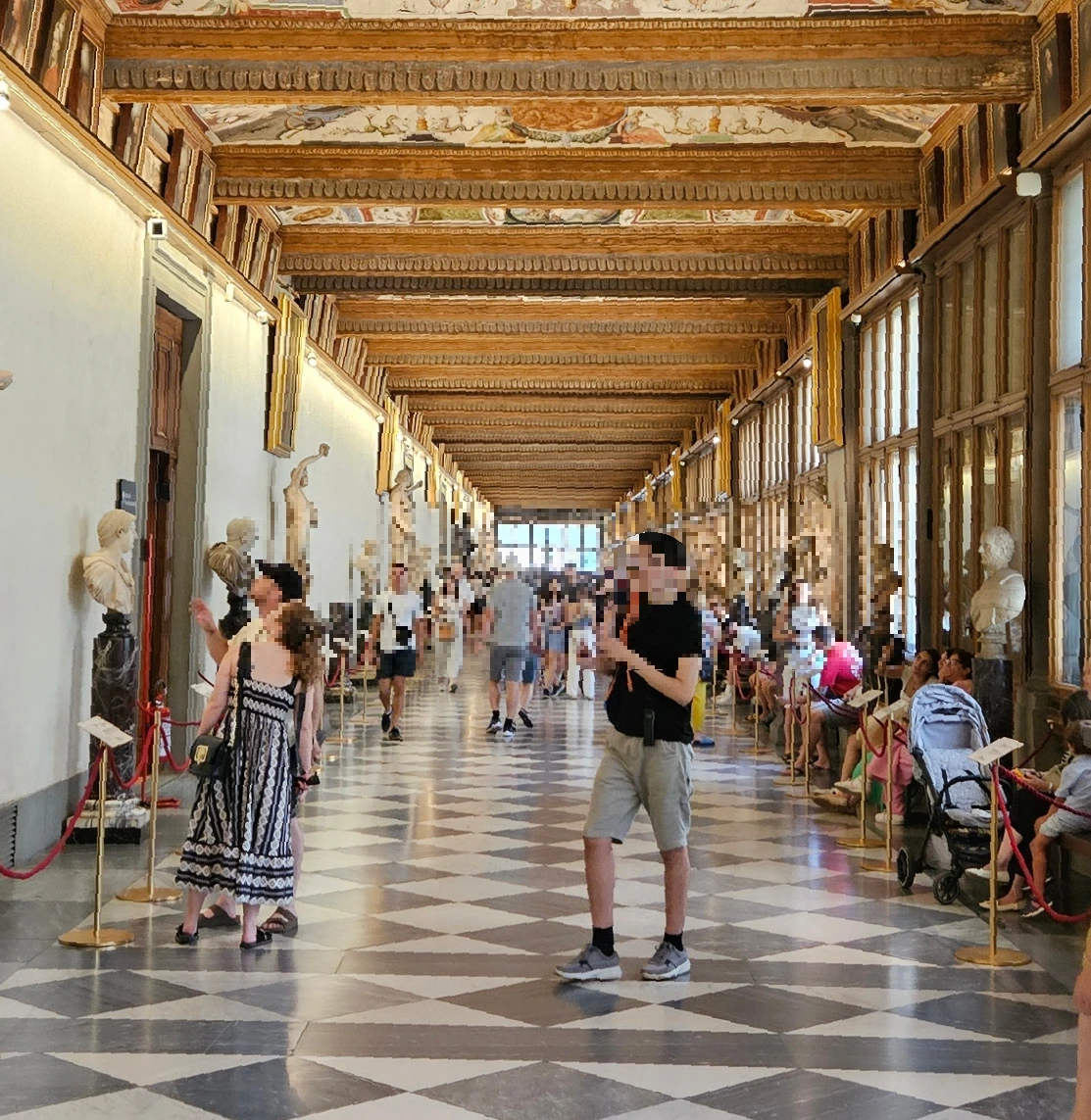 우리 숙소에서 우피치 미술관까지는 정확히 5분 컷이었기에 11시가 조금 넘은 시각에 여유롭게 미술관으로 향했다. 어제 오후에 들렸던 베키오궁을 지나서 바로 앞에 위치한 우피치 미술관 입장하는 곳으로 갔다. 이미 많은 사람들이 입장을 위해 대기하고 있는 상황이었다. 11시 30분 대기라인에 서서 입장을 준비했다. 티켓을 확인하고 간단한 짐 검사 후에 미술관에 입장할 수 있었다.