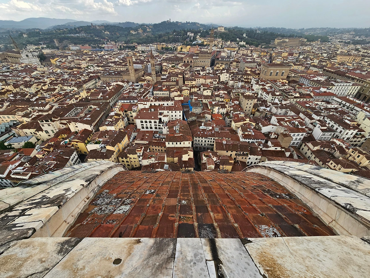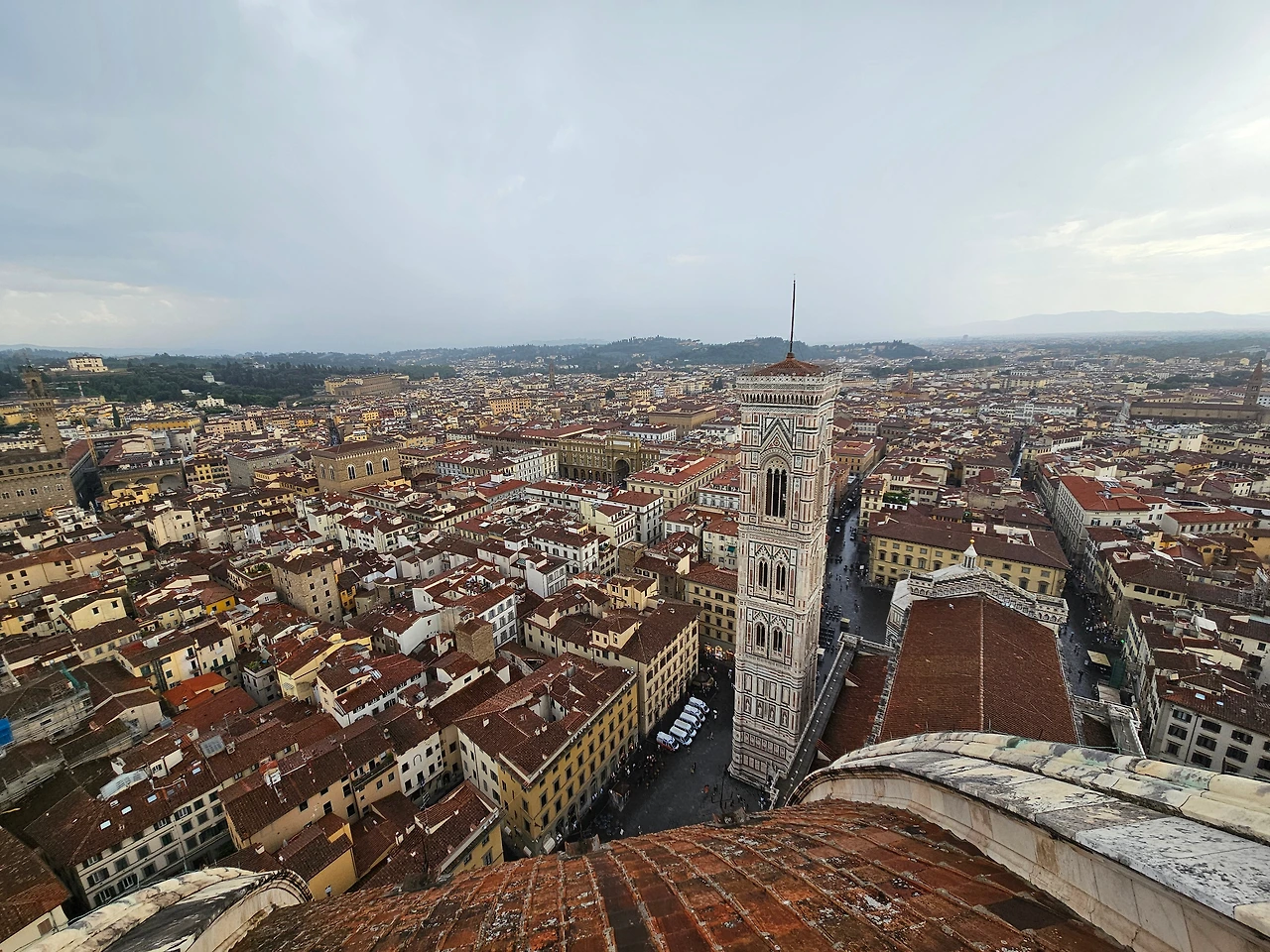 정상에 오르니 가장 먼저 신선한 공기가 나를 반겨줬다. 그리고 갑자기 소나기가 내리기 시작했다. 우리가 정상에 온 것을 반겨주는 소나기 같았다. 눈을 들어 위쪽을 바라보니 성당의 꼭대기가 보였고 뒤를 돌아서니 피렌체의 풍경이 한눈에 들어왔다. 정상에 올라서 전망대를 한 바퀴 돌면 피렌체 동서남북을 모두 감상할 수 있었다. 정말 아름다운 풍경이었다. 이탈리아에 와서 본 광경 중에서 가장 아름답다고 해도 과언이 아니었다. 이곳에 잘 올라왔다는 생각이 들었다. 아내와 아들도 그 아름다운 풍경에 심취된 듯했다. 여기저기 사진을 찍으며 피렌체 가장 높은 곳에서 보이는 그림 같은 모습을 담았다.