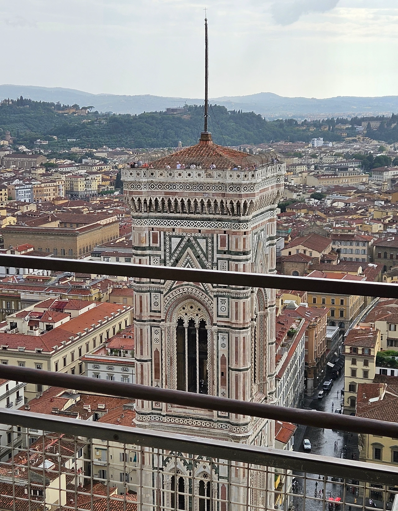 남동쪽으로 오니 조토의 종탑도 눈에 보였다. 매시간마다 멋진 종소리를 전달해 주는 시계와 같은 종탑이었다. 살포시 저 멀리 종탑 위에서 우리를 보고 손을 흔드는 사람들이 보였다. 우리 가족도 그들을 향해서 힘차게 손을 흔들어 주었다. 내일은 저 종탑을 올라서 지금 우리가 서 있는 곳을 바라보고 싶었다. 소나기가 지나가고 시원한 바람이 불기 시작했다. 우리는 그 바람을 맞으며 10여분 정도 돔 정상에 머물렀다. 사실 그곳을 떠나기가 싫었다. 영화 속 그림 같은 경치를 즐기며 가만히 있고 싶었다. 얼마가 지났을까? 관리자가 우리에게 이제는 내려갈 시간이라고 했다. 아쉬움을 달래며 우리 가족은 다시 성당 아래로 발길을 돌렸다.