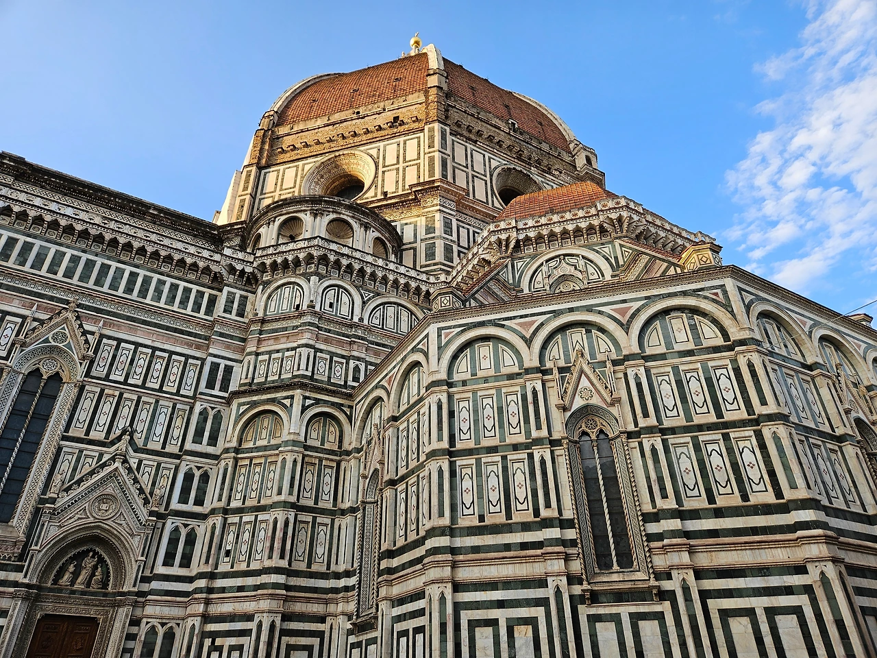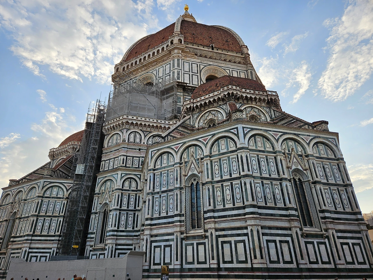 아내가 꼭 한 번 가보고 싶다고 하여 방문하게 된 곳이다. 사실 이곳의 명칭은 피렌체 대성당(이태리어로 Duomo di Firenze)이다. 대성당이라는 말이 이태리어로 두오모. 때문에 우리는 피렌체의 두오모 성당이라고 부른다. 실제로 공식 명칭은 산타 마리아 델 피오레 대성당 (Cattedrale di Santa Maria del Fiore)이지만 너무 복잡하기에 쉽게 따라 부를 수 없다. 이 성당은 필리포 브루넬레스키가 설계한 돔으로 유명하며, 실외는 하얀색으로 윤곽선을 두른 초록색과 분홍색의 대리석 판으로 마감되어 있다. 피렌체에 들리면 꼭 가봐야 하는 것으로 보는 순간 감탄사가 절로 나오는 그런 엄청난 건축물이다.