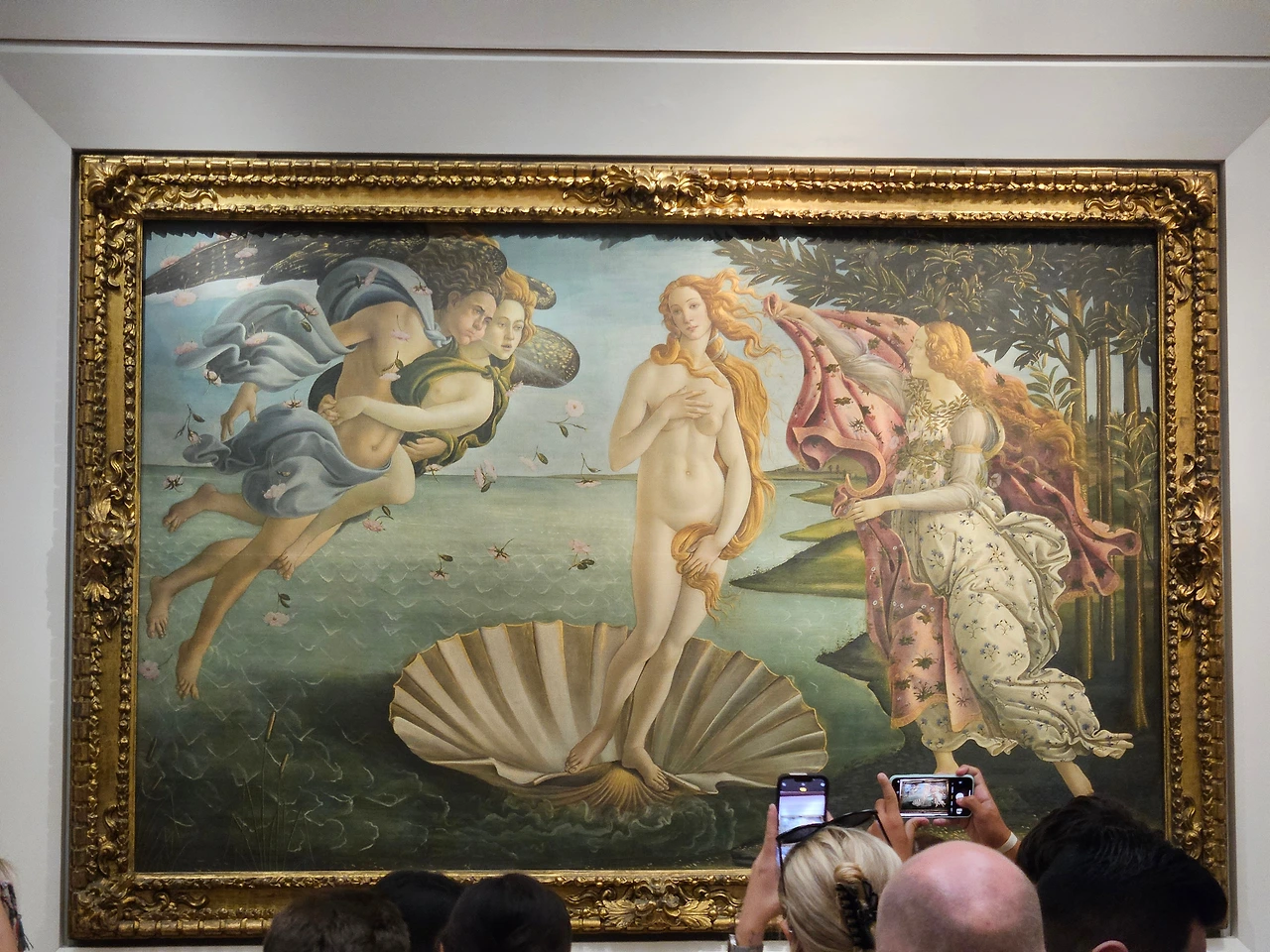 2층 복도에서 처음 접하는 작품들은 대부분 종교적인 색채가 강한 중세 시대의 작품들이었다. 며칠 전 바티칸에서 본 작품들과 비슷한 분위기여서 간단히 오디오 설명만 듣고 지나갔다. 여러 작품 중에서 가장 먼저 눈에 들어온 것은 르네상스 시대의 대표적인 화가 산드라 보티첼리의 '비너스의 탄생'이라는 작품. 교과서 속에서만 보면 비너스의 탄생을 직접 눈으로 본다는 것만으로 감동이었다. 로마 신화를 기반으로 사랑과 미를 상징하는 비너스가 바닷가에 상륙하는 모습을 그린 작품으로 르네상스 시대의 대표적인 작품으로 배운, 바로 그 그림이었다. 나는 그 자리에 멈춰서 멍하니 비너스의 탄생을 지켜봤다. 앞에서 관람했던 가톨릭 그림들과는 다르게 인간을 표현하는 모습이 당시로서의 정말 충격적으로 느껴졌을 것 같았다. 이러한 과감한 변화가 답답하고 어두웠던 중세의 벽을 붕괴시킨 원동력이 아니었을까 생각을 해봤다.