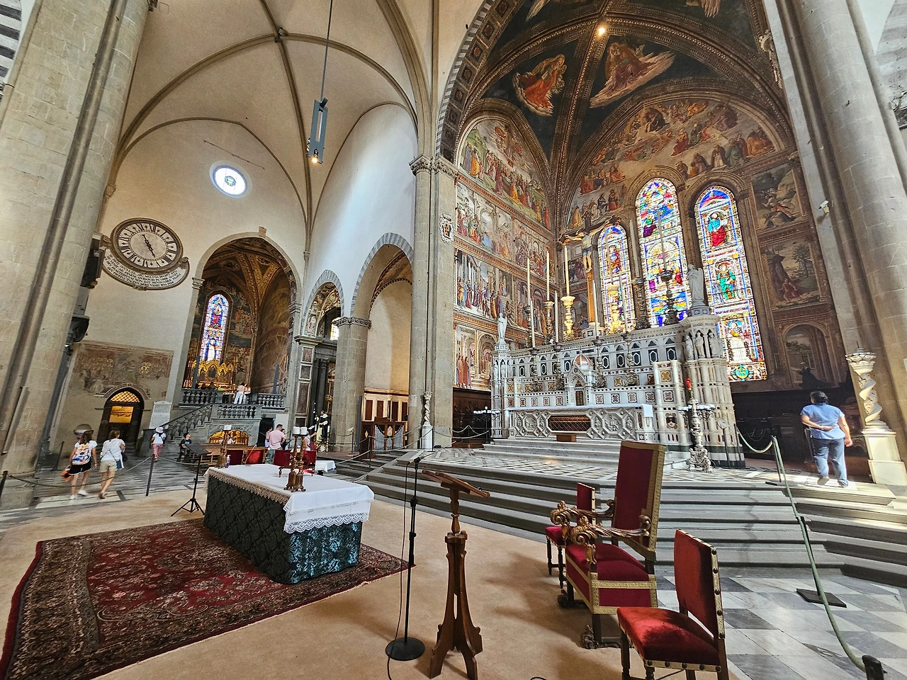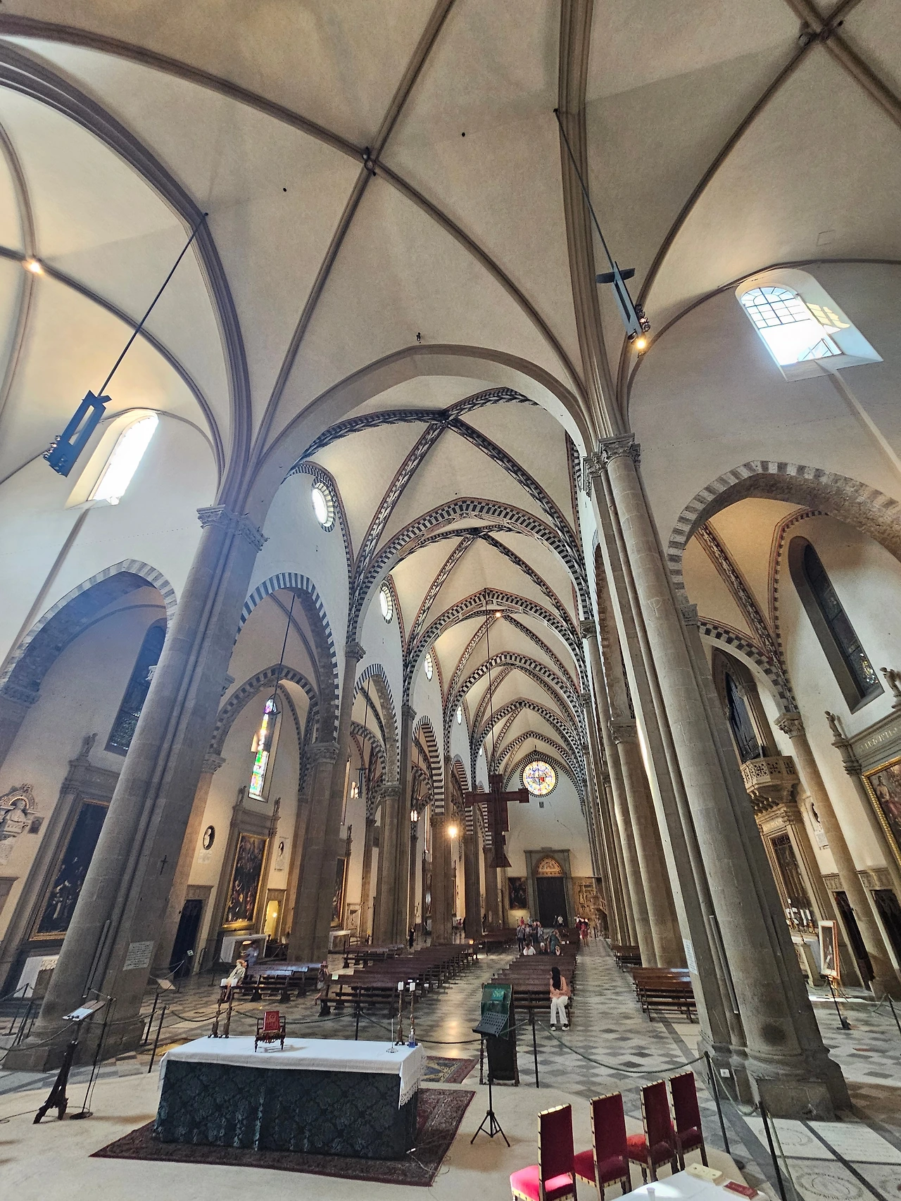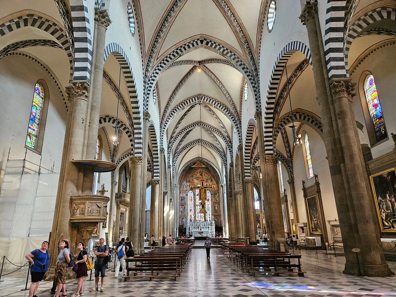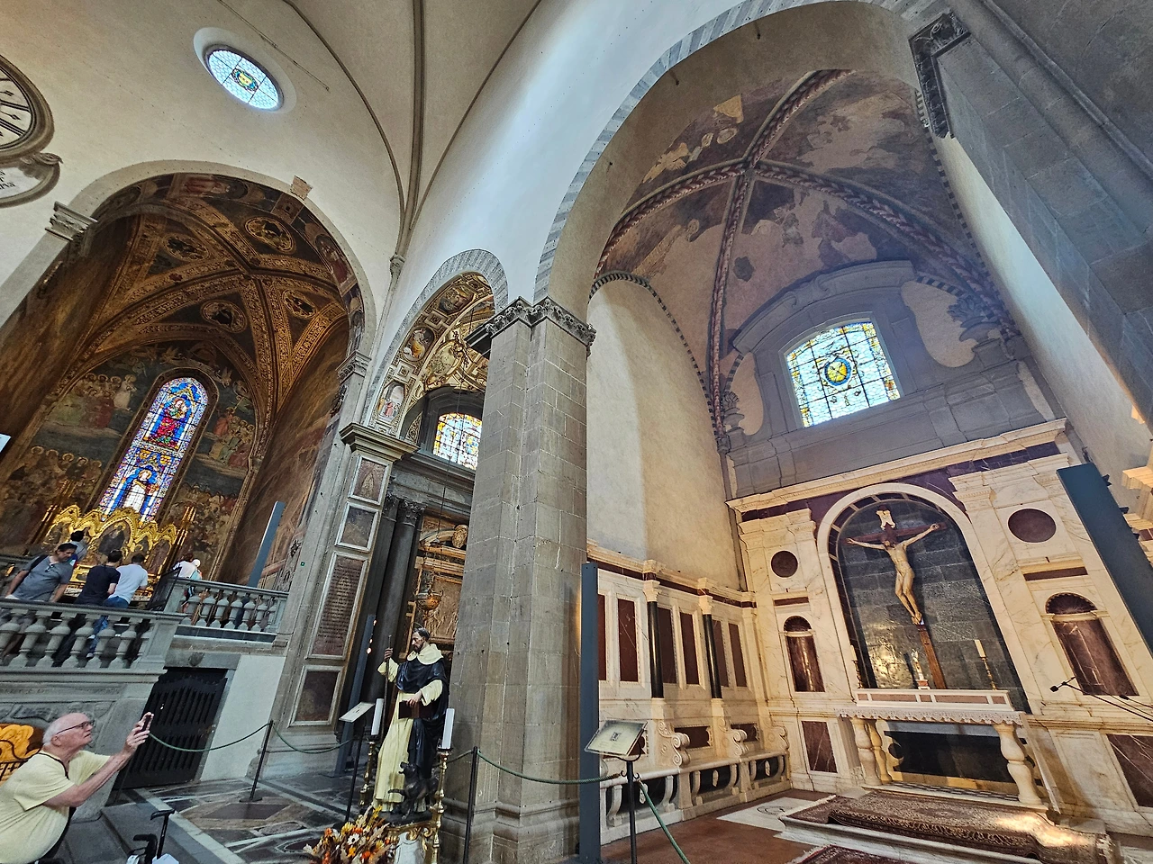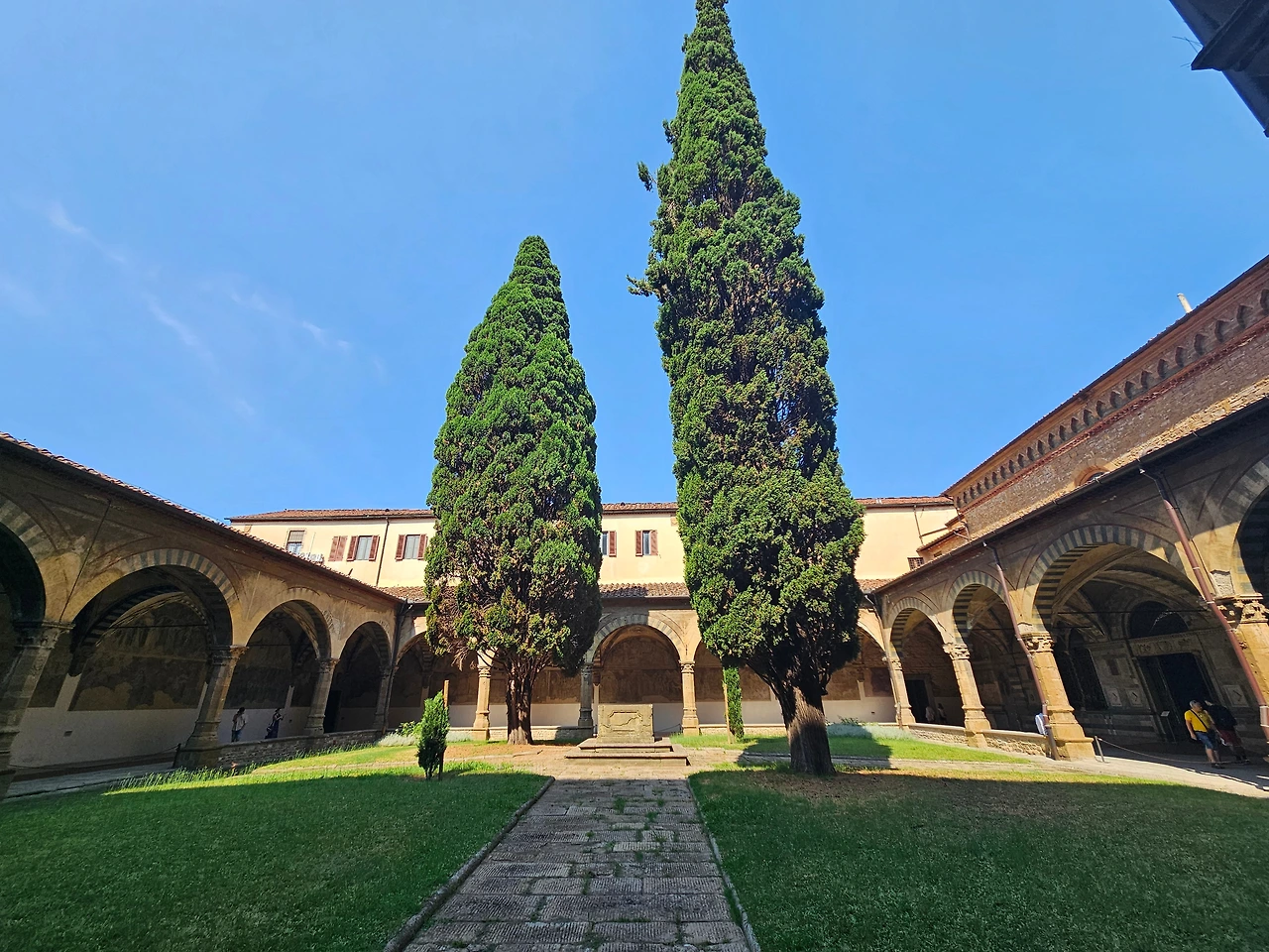 피렌체 역 바로 앞에 위치한 산타마리아 노벨라 성당을 다시 만났다. 이곳은 도미니크 수도회 사람들이 1279년에 공사를 시작하여 1357년에 완공한 피렌체의 대표 성당이다. 르네상스를 대표하는 예술 작품들이 가득한 보물창고와 같은 공간이다. 성당 전체적으로 고딕양식과 로마네스크 양식이 조화를 이루고 있었다. 정면의 기하학적인 패턴과 아치형 입구, 뾰족한 창문과 내부를 수놓은 스테인글라스 등이 인상적으로 다가왔다. 넓은 실내는 T자 모양으로 설계된 구조였으며, 그 길이가 100m 정도로 어마어마했다. 중간중간에 여러 작품들이 전시되어 있었는데 마사초의 삼위일체(1427)가 대표적인 작품이라고 했다. 스테인글라스는 14세기와 15세기에 제작된 것으로서, 15세기의 '성모자상' 그리고 '성 요한과 성 필립보' 등의 스테인드글라스가 성당 안쪽을 장식하고 있었다. 사실 보는 것만으로 중세로 들어온 듯한 그런 느낌이었다. 그냥 모든 것이 놀라웠고 뭔지 모를 시간의 엄숙함이 나를 짓눌렀다. 시선을 따라서 발걸음을 옮겼다. 그리고 작은 문이 있는 왼쪽으로 나오니 수도원으로 이어지는 길이 있었다. 설명을 들으니 우첼로와 그의 문하생들이 그린 프레스코화가 남아 있었는데, 마치 고대의 암벽화를 보는 듯한 기분이었다. 멍하니 그림을 지켜보고 있자니 나의 영혼이 그림 속으로 빠져드는 듯한 착각이 들었다. 아쉽게도 기차 시간이 얼마 남지 않았기에 수도원의 정원을 마지막으로 다시 호텔로 향할 수밖에 없었다.