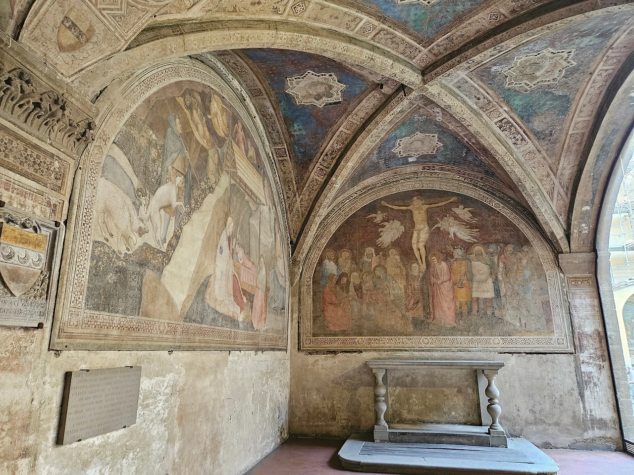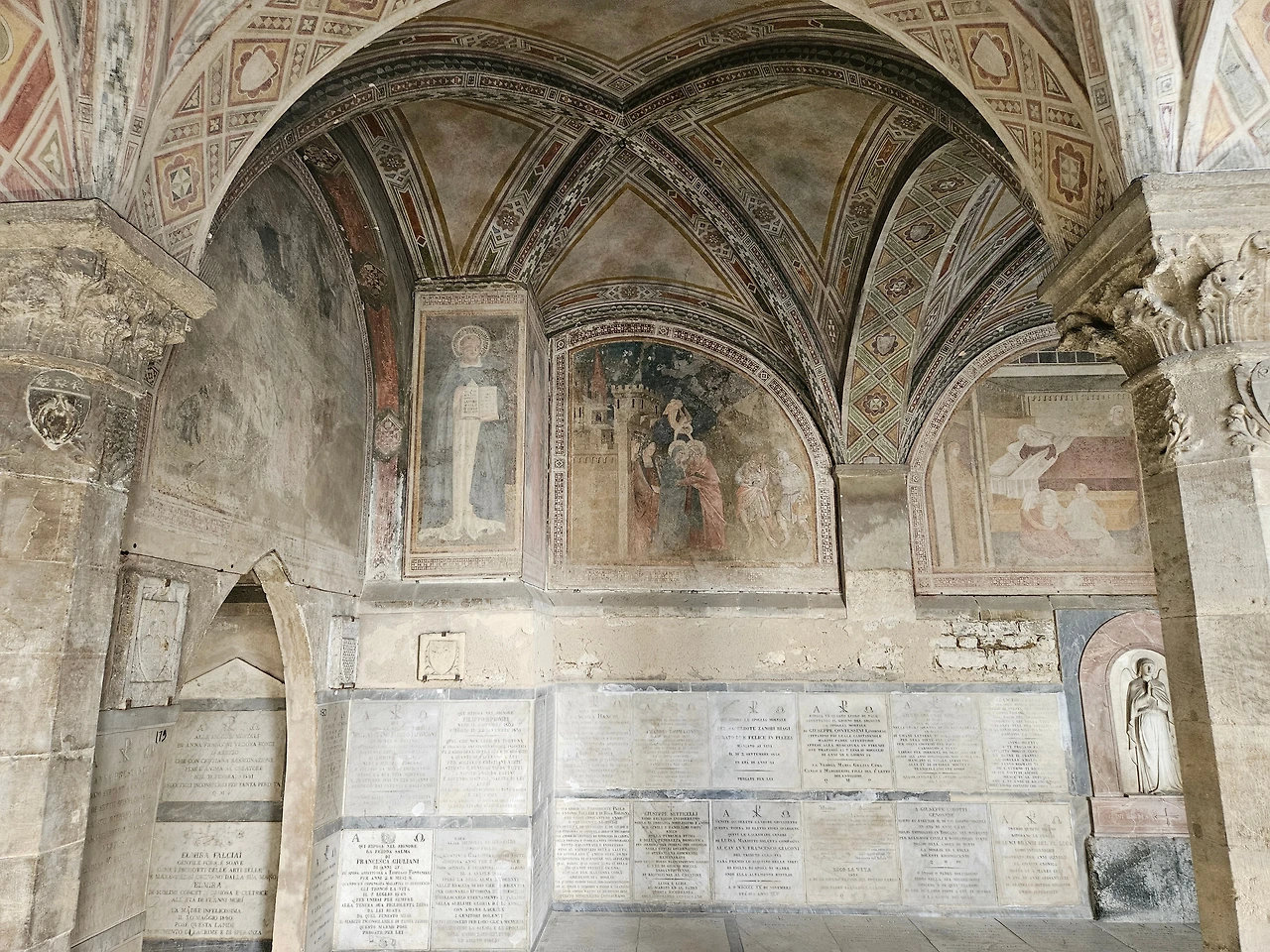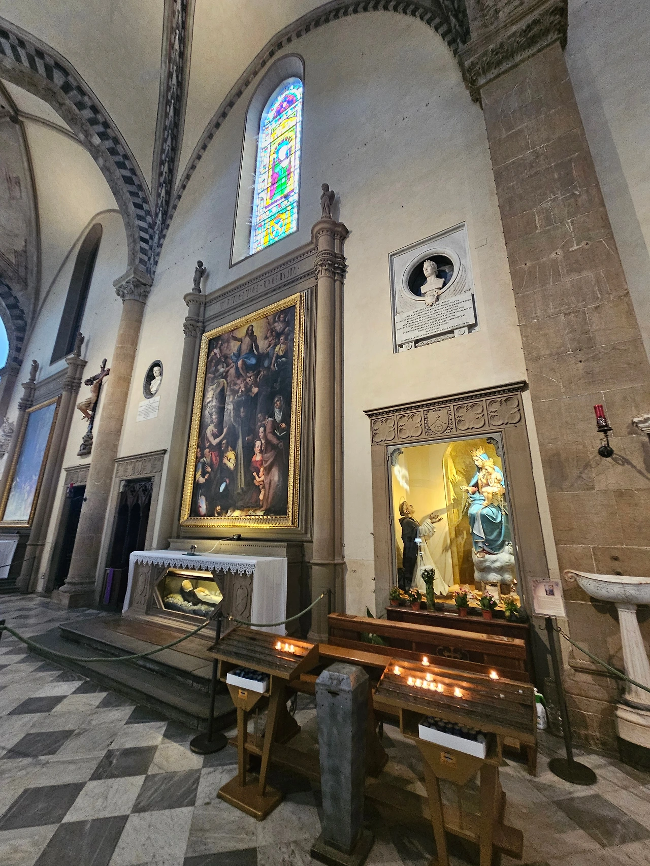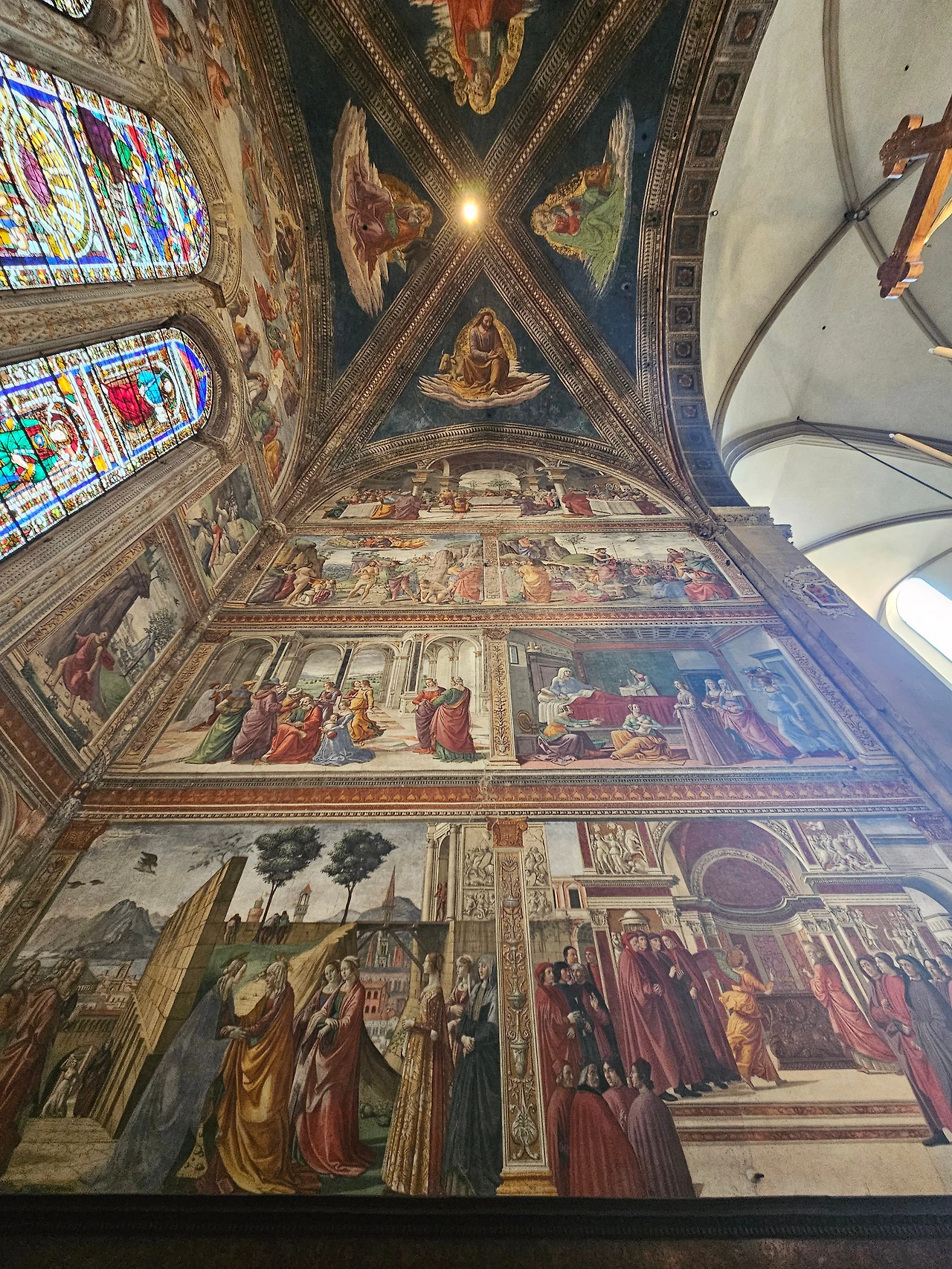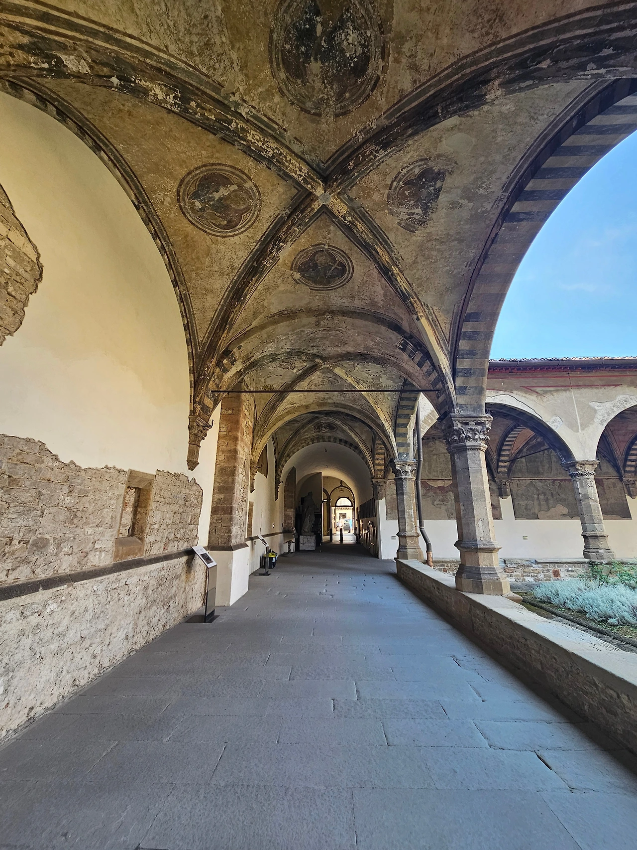 피렌체 역 바로 앞에 위치한 산타마리아 노벨라 성당을 다시 만났다. 이곳은 도미니크 수도회 사람들이 1279년에 공사를 시작하여 1357년에 완공한 피렌체의 대표 성당이다. 르네상스를 대표하는 예술 작품들이 가득한 보물창고와 같은 공간이다. 성당 전체적으로 고딕양식과 로마네스크 양식이 조화를 이루고 있었다. 정면의 기하학적인 패턴과 아치형 입구, 뾰족한 창문과 내부를 수놓은 스테인글라스 등이 인상적으로 다가왔다. 넓은 실내는 T자 모양으로 설계된 구조였으며, 그 길이가 100m 정도로 어마어마했다. 중간중간에 여러 작품들이 전시되어 있었는데 마사초의 삼위일체(1427)가 대표적인 작품이라고 했다. 스테인글라스는 14세기와 15세기에 제작된 것으로서, 15세기의 '성모자상' 그리고 '성 요한과 성 필립보' 등의 스테인드글라스가 성당 안쪽을 장식하고 있었다. 사실 보는 것만으로 중세로 들어온 듯한 그런 느낌이었다. 그냥 모든 것이 놀라웠고 뭔지 모를 시간의 엄숙함이 나를 짓눌렀다. 시선을 따라서 발걸음을 옮겼다. 그리고 작은 문이 있는 왼쪽으로 나오니 수도원으로 이어지는 길이 있었다. 설명을 들으니 우첼로와 그의 문하생들이 그린 프레스코화가 남아 있었는데, 마치 고대의 암벽화를 보는 듯한 기분이었다. 멍하니 그림을 지켜보고 있자니 나의 영혼이 그림 속으로 빠져드는 듯한 착각이 들었다. 아쉽게도 기차 시간이 얼마 남지 않았기에 수도원의 정원을 마지막으로 다시 호텔로 향할 수밖에 없었다.