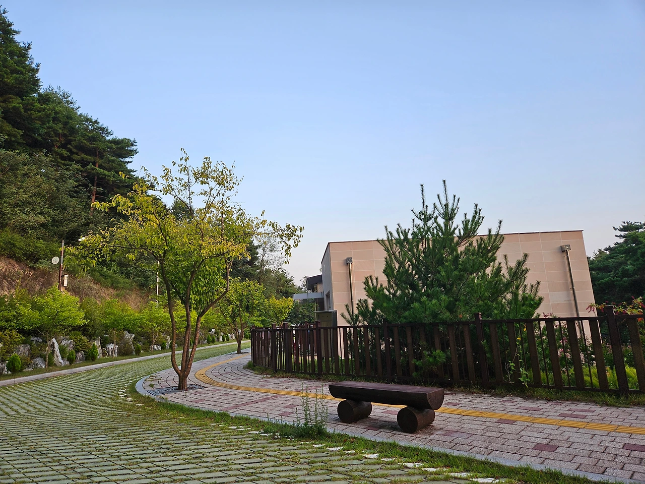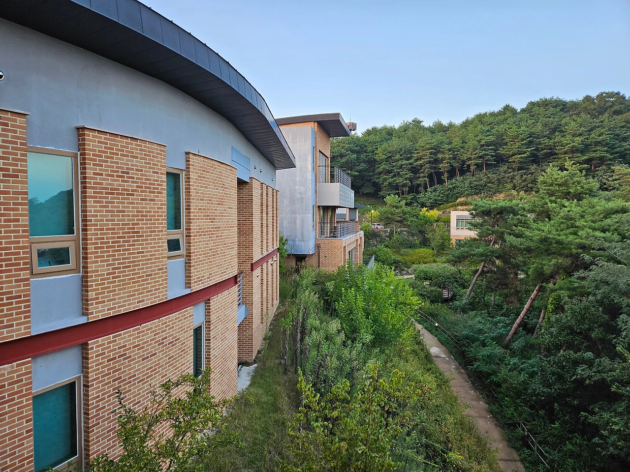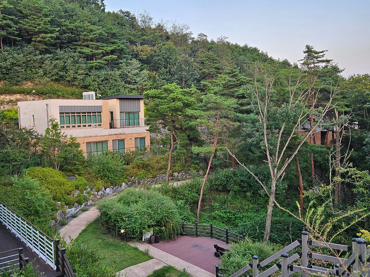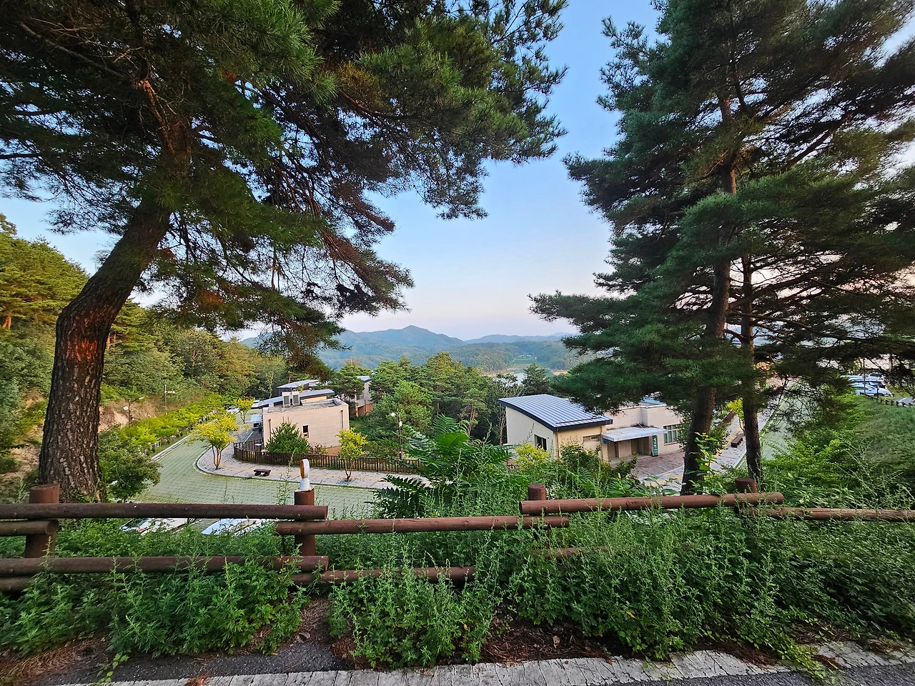 멋진 노을을 뒤로하고 숲 속의 집이 있는 호수가 쪽으로 내려왔다. 오는 길에 위풍당당한 산림휴양관이 자리를 지키고 있었다. 호반하우스나 숲 속의 집 예약이 하늘의 별따기만큼 힘들기 때문에 이곳을 예약하여 안동호반을 즐기는 이들도 많이 있었다. 작년 기억으로는 이곳에서도 살포시 안동호수를 볼 수 있었다.