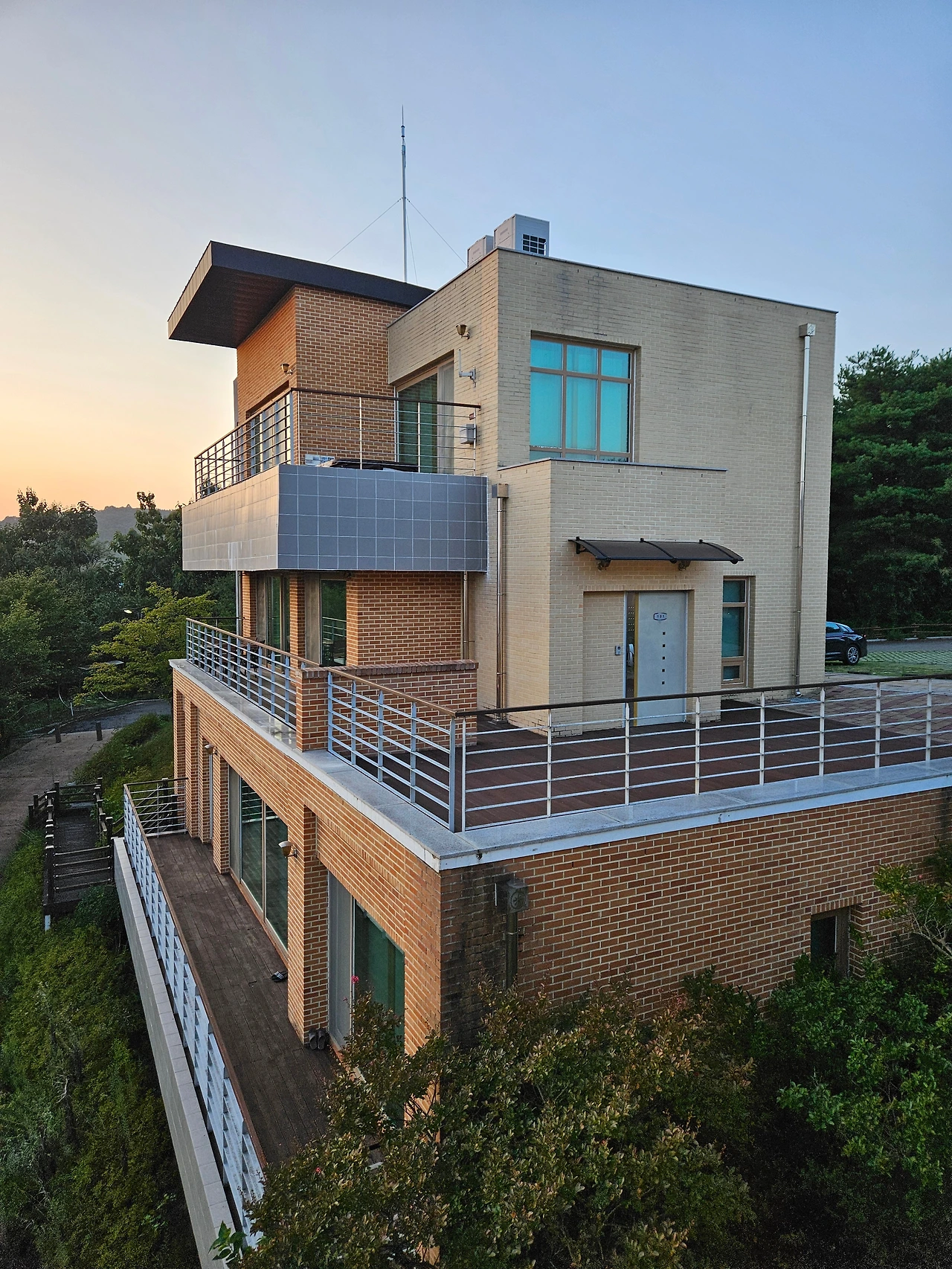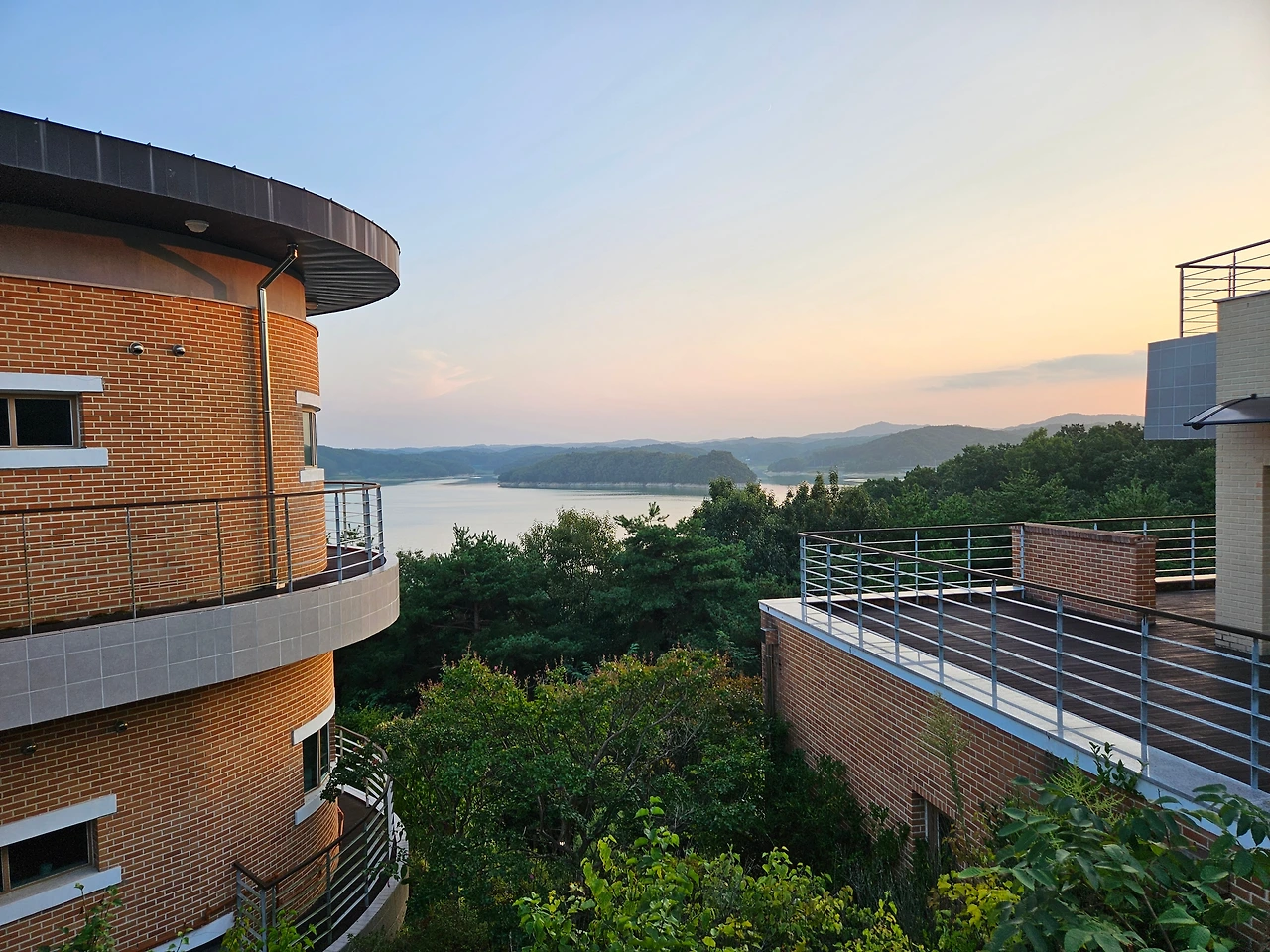 조금 더 달리니 소나무 사이로 멋진 숙소의 풍경이 들어왔다. 호반하우스 지구였다. 안동호가 훤히 내려다보이는 곳에 5개의 호반하우스가 있었다. 워낙 시설과 풍경이 좋아서 자연 휴양림의 5성급 호텔로 불릴 정도로 인기가 높은 곳이었다. 자주 예능 프로그램의 촬영장소로도 활용이 된다고 한다. 계명산, 학가산, 영지산, 청량산, 검무산 등 산속의 고급 별장을 보는 듯한 느낌이었다. 주차 공간을 보니 한 숙소에 2~3집 정도가 함께 머물기 가능한 것으로 보였다. 잠시 테라스 근처에서 호수를 바라보는데 저 멀리 붉은 노을이 너무 아름답게 보였다. 나중에 기회가 된다면 꼭 한 번 머물고 싶은 곳이 아닐 수 없었다.