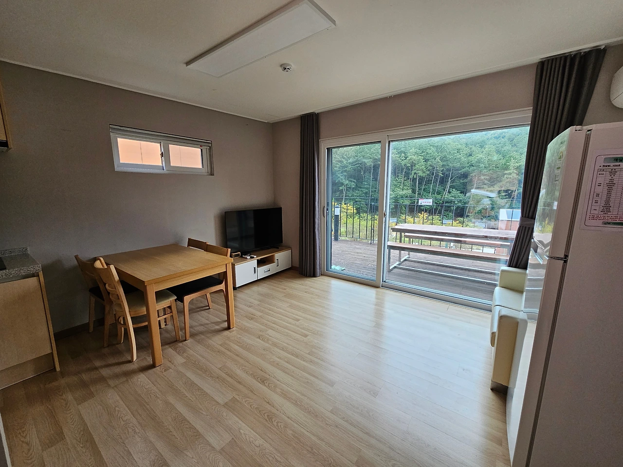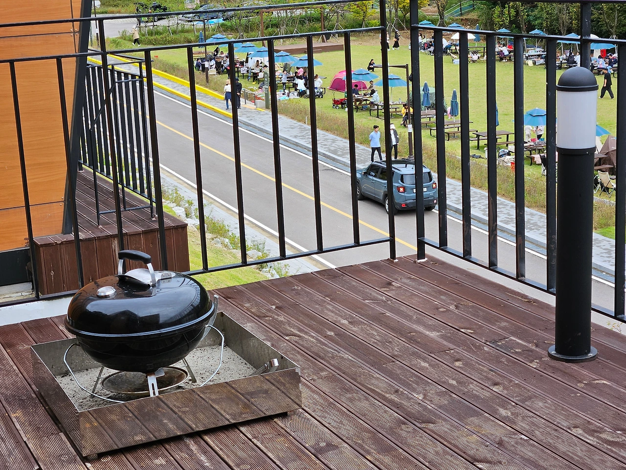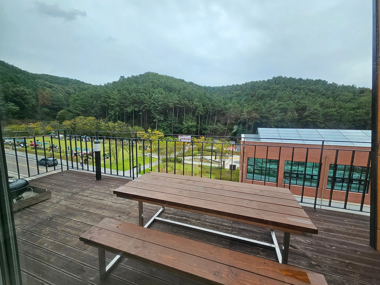 관리사무소에서 키를 수령하고 우리가 머물 숙소로 향했다. 차를 몰고 숲 속의 집이 있는 언덕으로 올라갔다. 그리고 드디어 105호의 문을 열었다. 넓게 빠진 거실이 우리를 먼저 맞이했다. 식탁과 소파가 있었고 전자레인지와 밥솥도 준비되어 있었다. 문을 열고 나가니 마음에 쏙 드는 넓은 테라스가 우리 눈에 들어왔다. 가족들이 함께 저녁 식사를 즐길 수 있는 근사한 야외 식탁과 함께 바비큐 장비로 구비되어 있었다. 역시 새삥(?) 휴양림이다. 모든 것이 완벽했다. 진심으로 내가 지금껏 다녀본 휴양림 중에서 최고가 아닐까 라는 생각이었다.