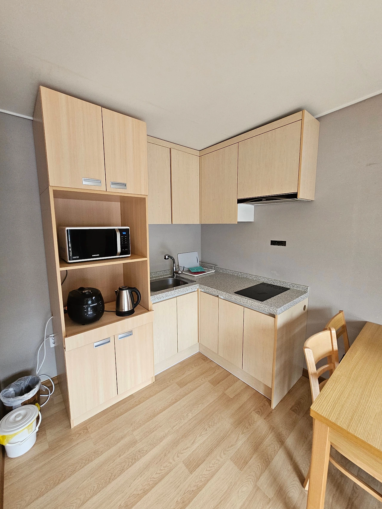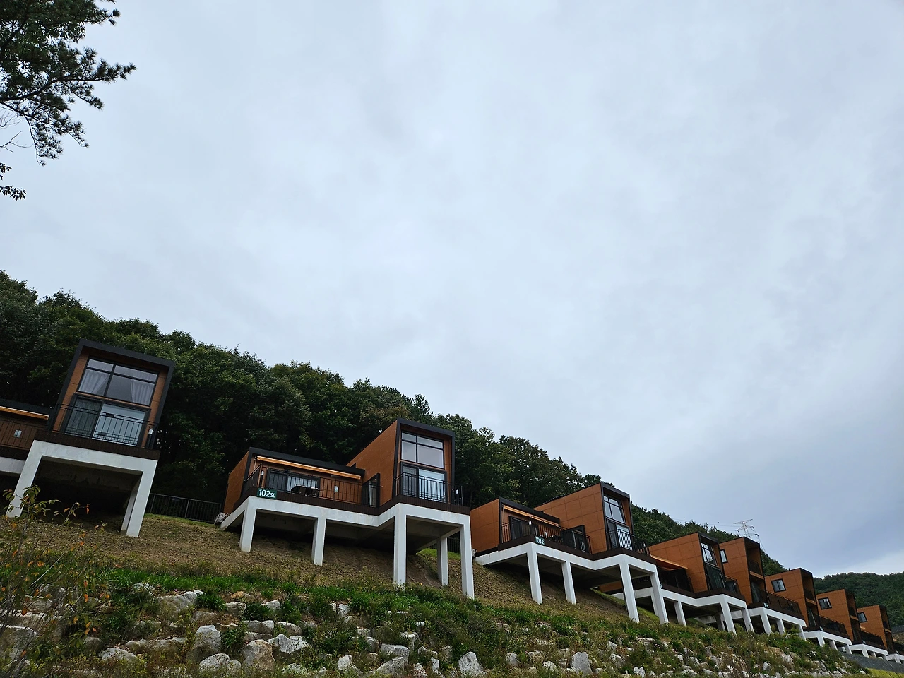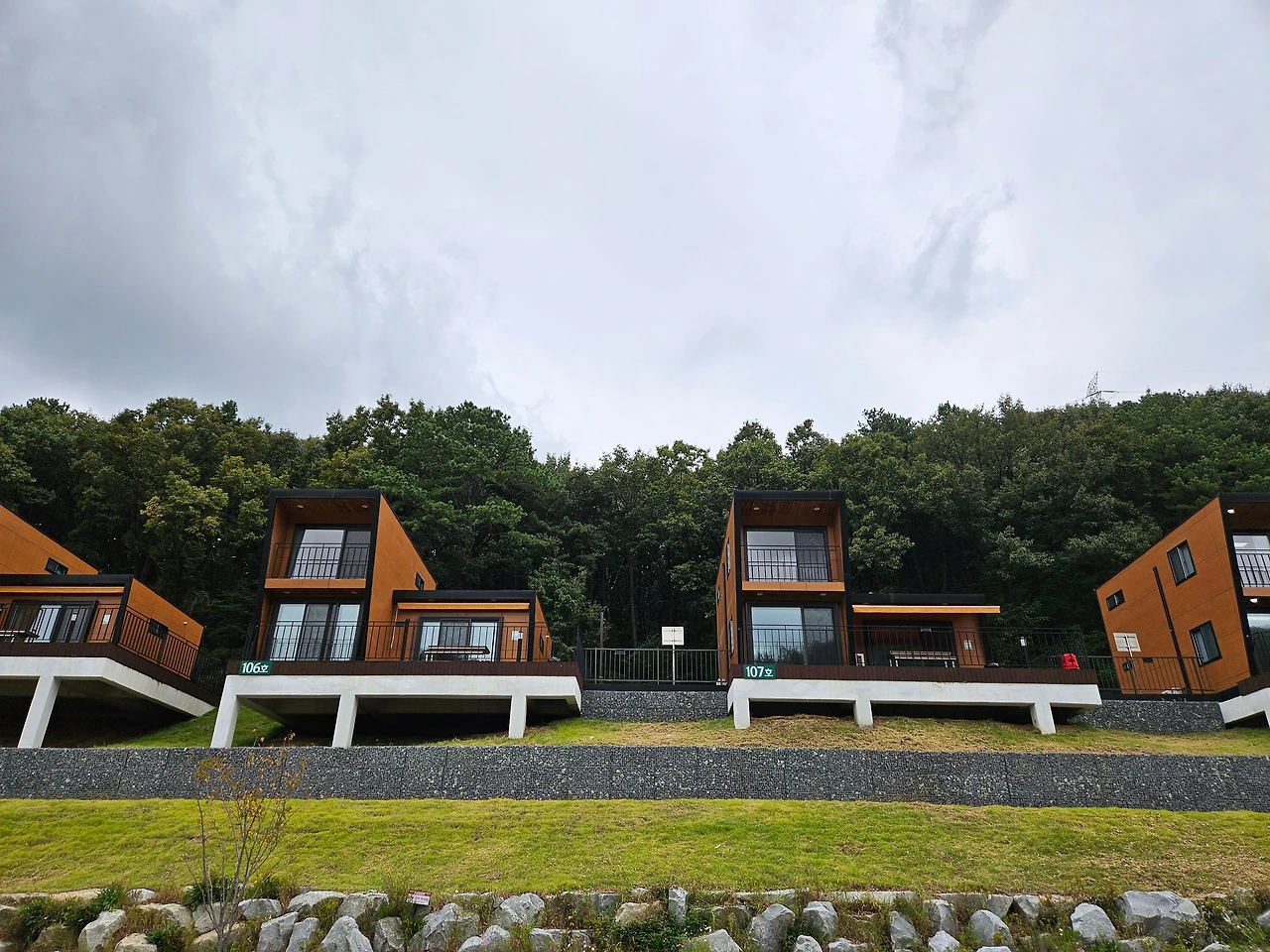 관리사무소에서 키를 수령하고 우리가 머물 숙소로 향했다. 차를 몰고 숲 속의 집이 있는 언덕으로 올라갔다. 그리고 드디어 105호의 문을 열었다. 넓게 빠진 거실이 우리를 먼저 맞이했다. 식탁과 소파가 있었고 전자레인지와 밥솥도 준비되어 있었다. 문을 열고 나가니 마음에 쏙 드는 넓은 테라스가 우리 눈에 들어왔다. 가족들이 함께 저녁 식사를 즐길 수 있는 근사한 야외 식탁과 함께 바비큐 장비로 구비되어 있었다. 역시 새삥(?) 휴양림이다. 모든 것이 완벽했다. 진심으로 내가 지금껏 다녀본 휴양림 중에서 최고가 아닐까 라는 생각이었다.