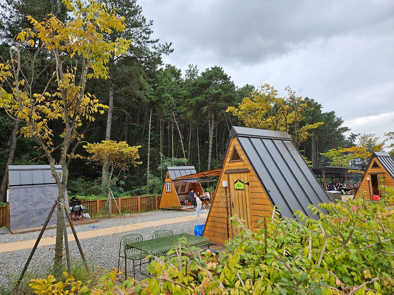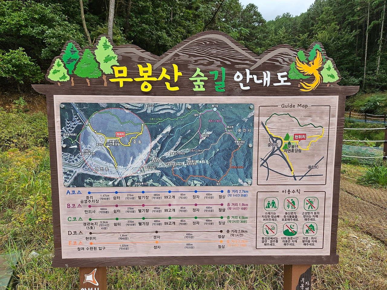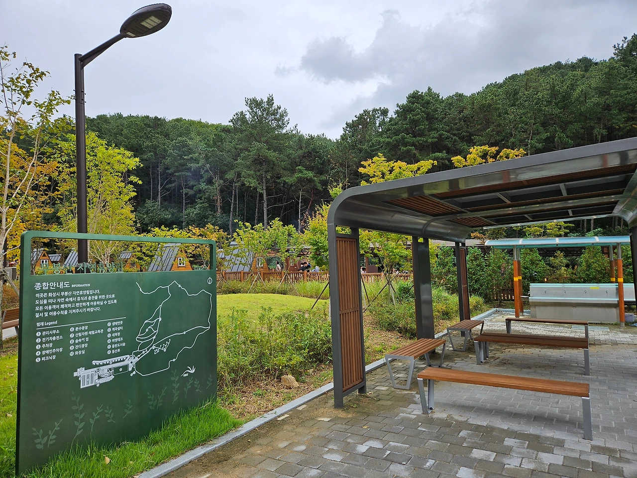 근처에 종합 안내도가 있어서 지도를 확인해 보았다. 무봉산 자연휴양림에는 숲 속의 집 10개 동을 비롯하여 텐트를 칠 수 있는 데크야영장, 뾰족하게 삼각뿔 모양으로 만들어진 피크닉오두막 10여 개, 야외에서 고기를 구워 먹을 수 있는 바비큐존 등이 옹기종기 모여있었다. 가족들이나 친구들끼리 함께 와서 자연을 즐기기에 최고의 공간임이 틀림없었다.