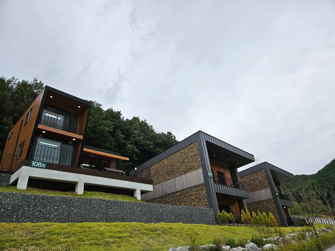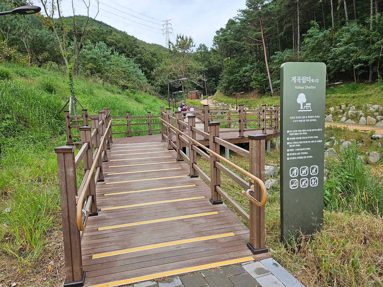 숲 속의 집을 나와서 무봉산 쪽으로 발걸음을 옮겼다. 무봉산은 해발 360m로 산새가 험하지 않고 등산로가 잘 정비돼 있었다. 무봉산 안쪽으로 들어가는 길에는 계곡 쉼터와 산책로가 이어져 있었다. 야영장 앞의 화장실과 샤워장을 지나서 계곡으로 올라갔다. 이동이 편하도록 나무테크가 계곡을 따라서 이어져 있었다.