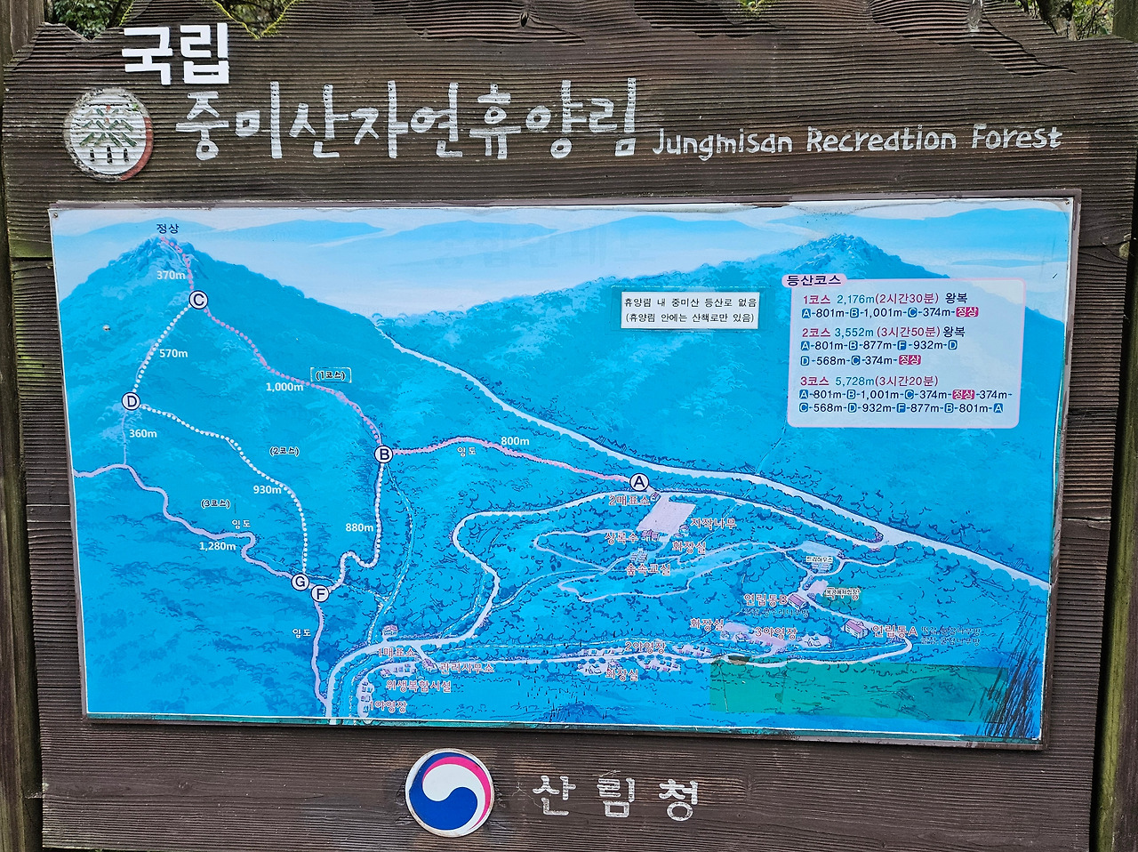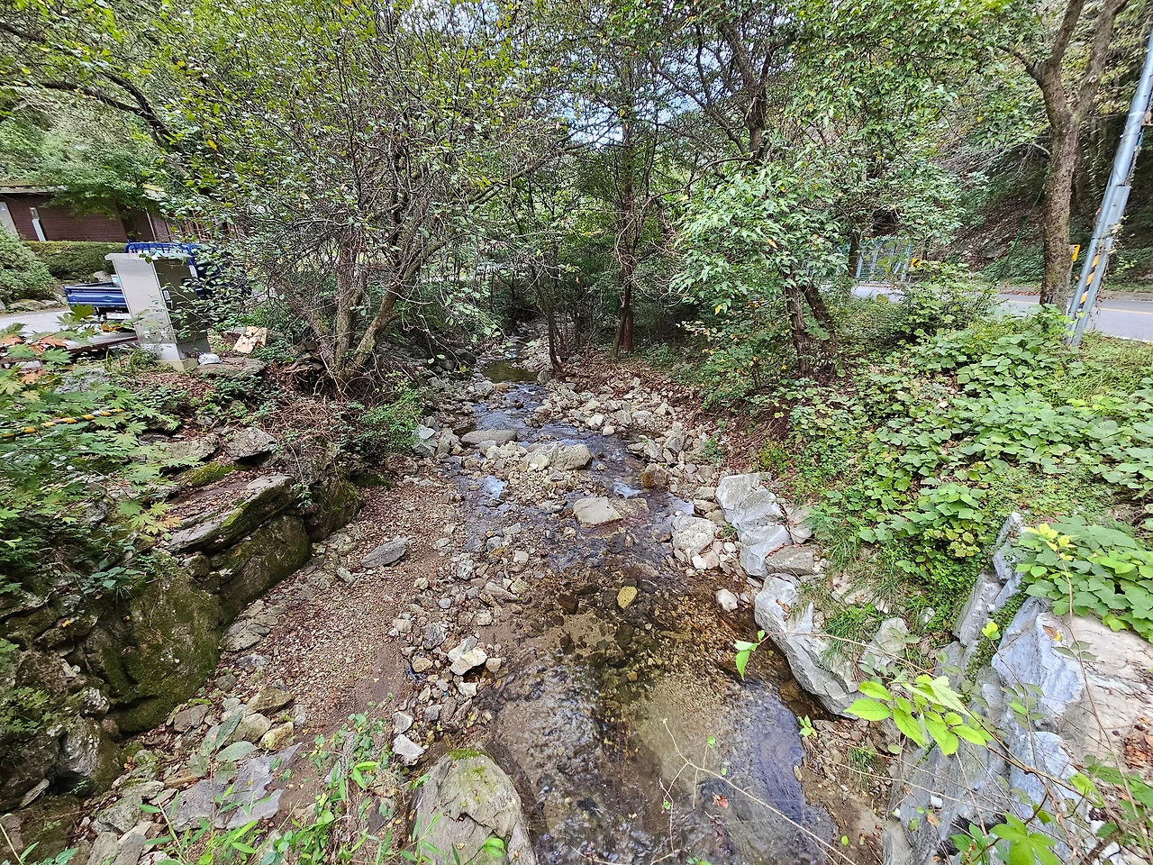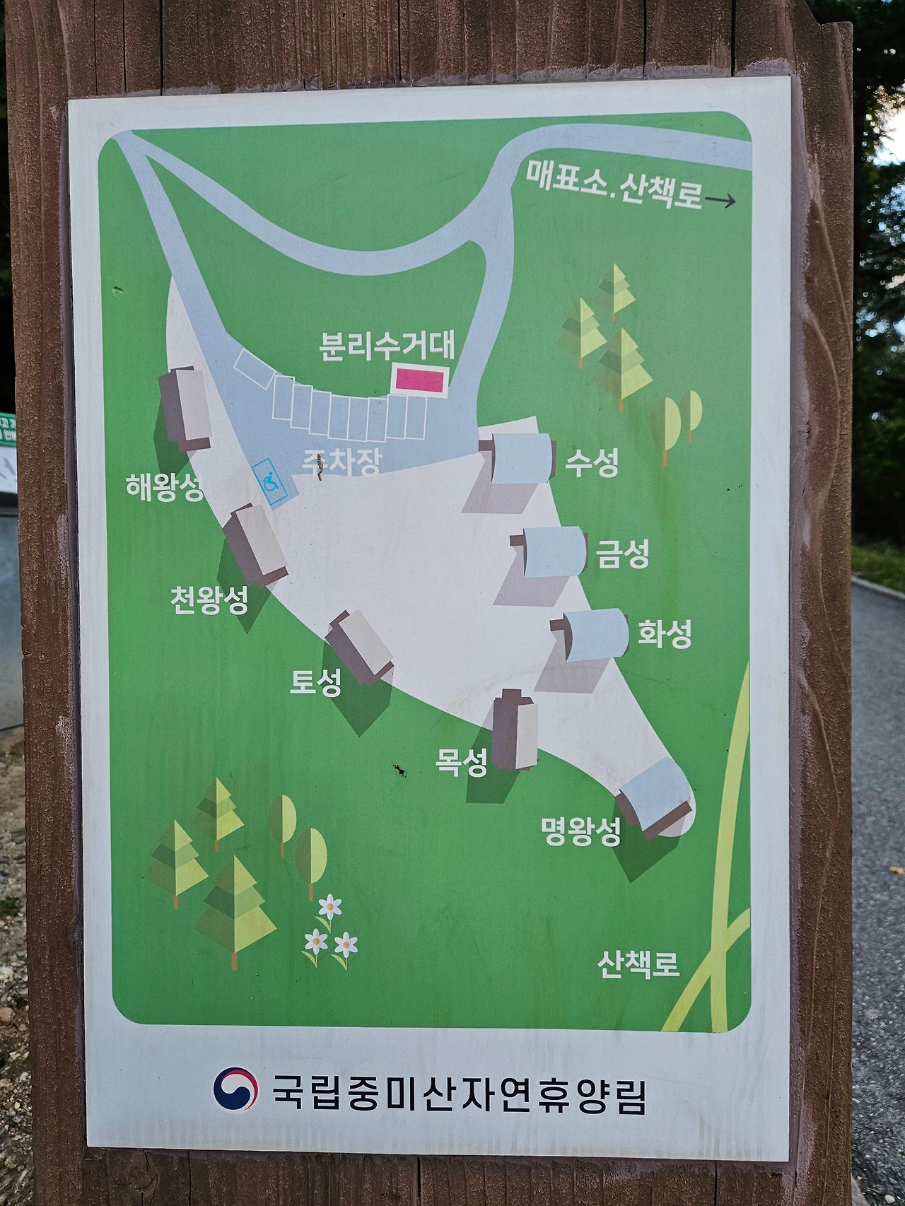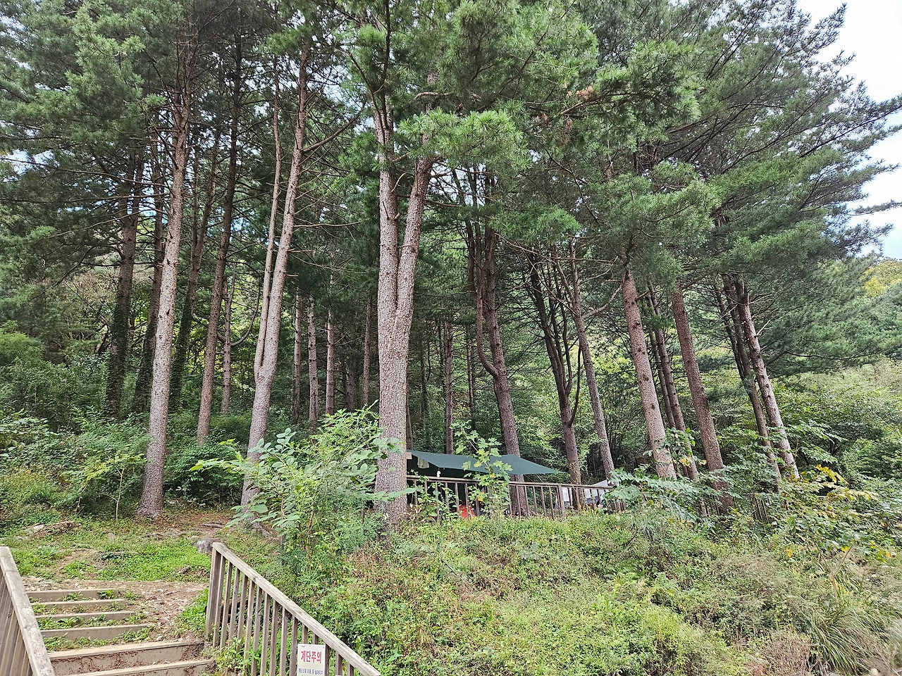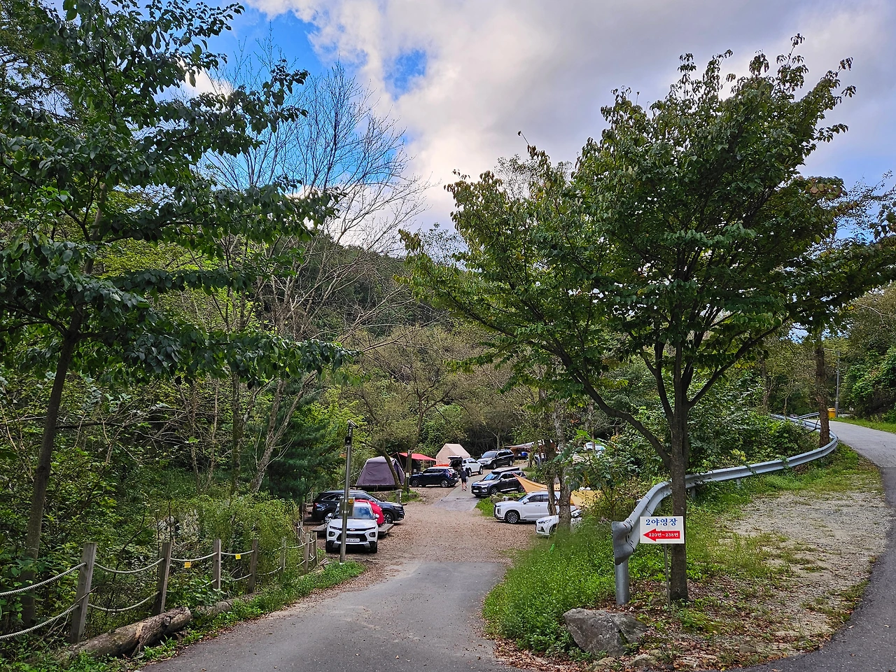 차를 타고 몇 백 미터를 더 내려오니 중미산 자연휴양림 입구가 보였다. 이곳에서 키를 받고 쓰레기봉투를 구입했다. 잠시 차에서 내려서 휴양림 안내도를 살폈다. 입구 쪽에는 계곡과 야영장이 있었고, 우리가 머물 숲 속의 집은 차를 타고 또 한참을 들어가야 하는 것처럼 보였다. 계곡 구경을 하기 위해서 잠시 야영장 쪽으로 발걸음을 옮겼다. 서울에서 가까운 곳이라서 그럴까? 평일이었지만 야영장은 빈 사이트가 없어 보였다. 계곡에서 물놀이를 즐기는 사람들도 몇몇 보였다. 한 여름이면 정말 인기 가득한 야영장이 아닐까 상상해 봤다.