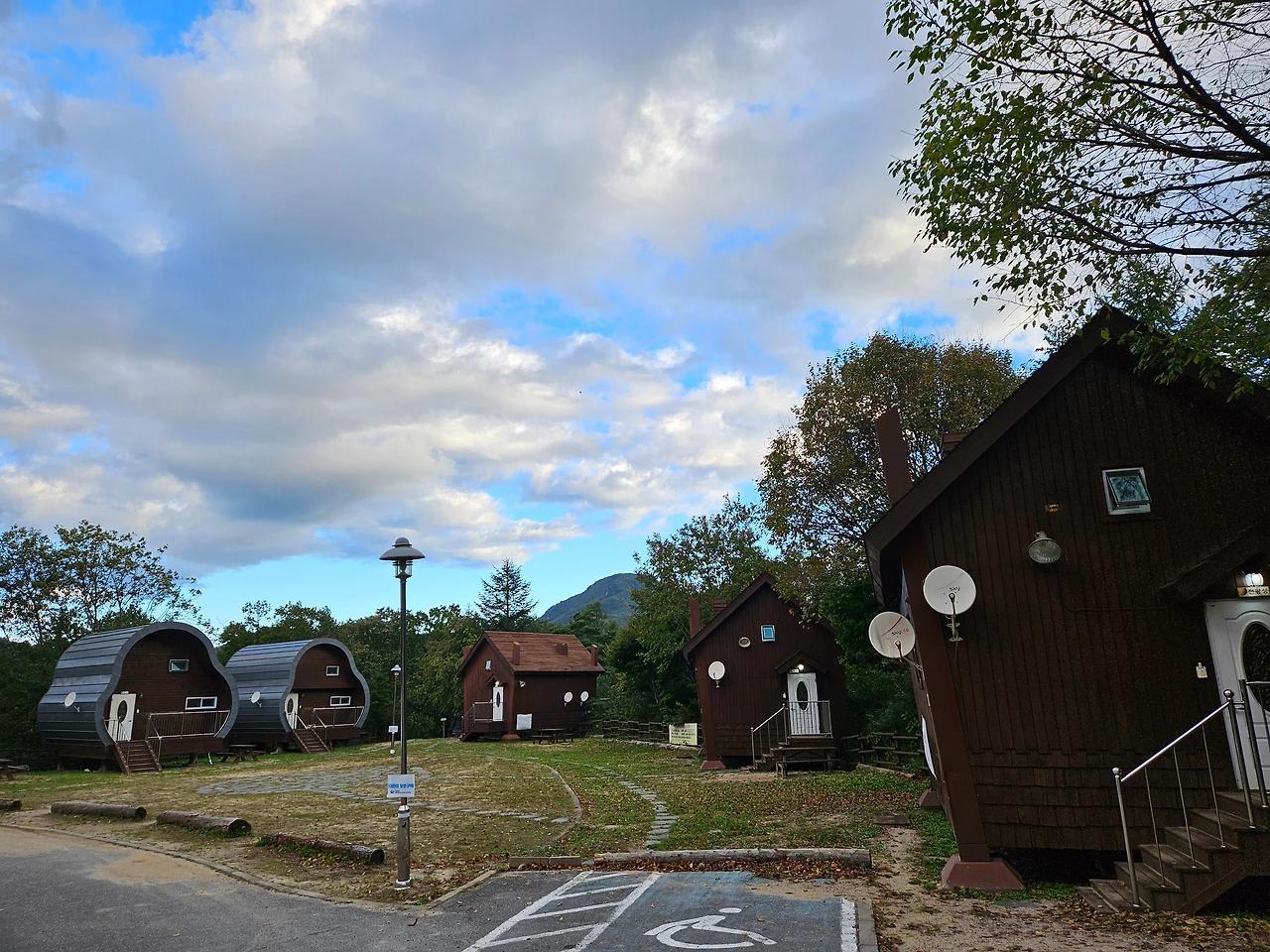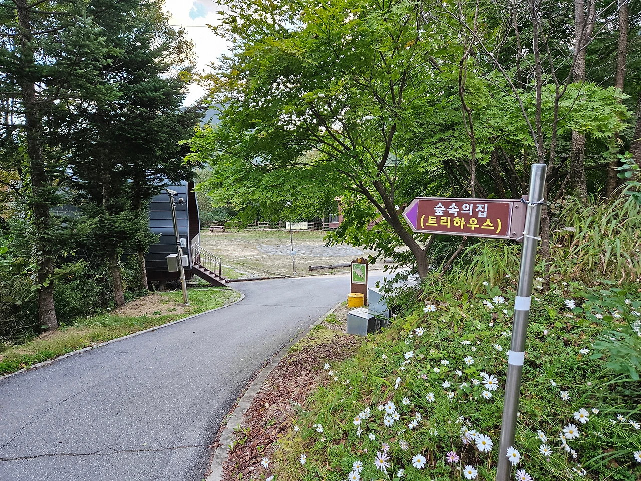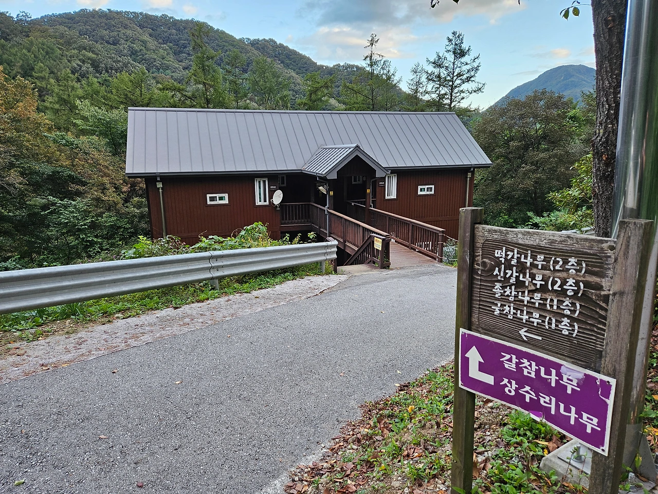 근사한 숲길을 조금 더 올라가니 또 하나의 야영장이 있었다. 길에서 조금 떨어져 있었지만 이미 텐트와 자동차로 가득 차 있는 모습이었다. 제2야영장을 지나서 크게 회전하는 길이 나왔고 그 길을 조금 더 오르니 연립동이 있었다. 2층으로 된 건물에는 4개의 숙소가 함께 있었고, 그 안쪽으로 갈참나무와 상수리나무 숙소가 있었다. 길가에는 목공예 체험장도 있었다.