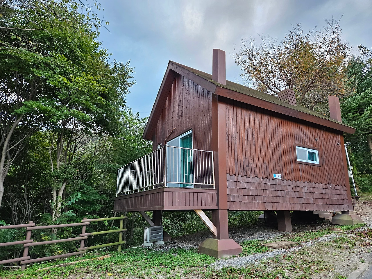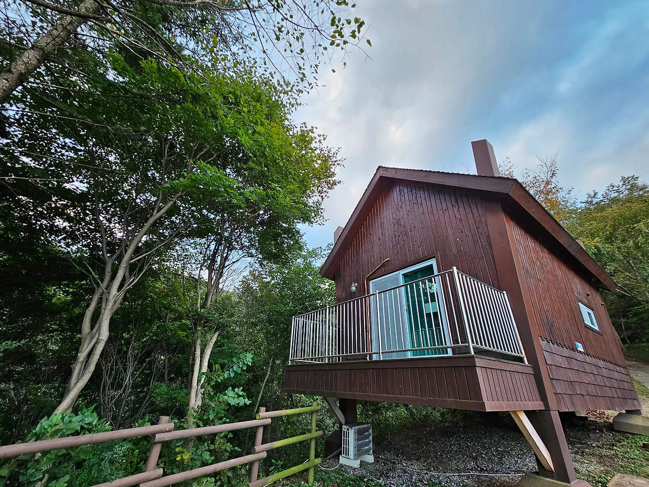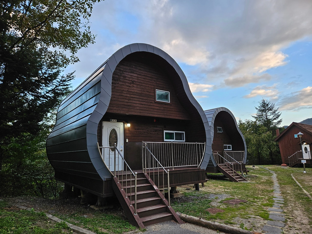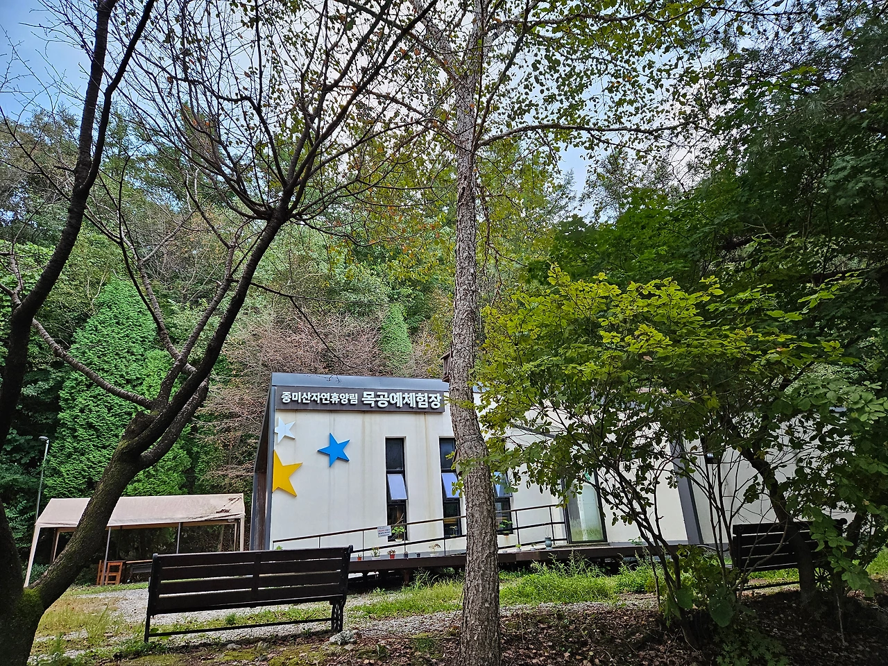 근사한 숲길을 조금 더 올라가니 또 하나의 야영장이 있었다. 길에서 조금 떨어져 있었지만 이미 텐트와 자동차로 가득 차 있는 모습이었다. 제2야영장을 지나서 크게 회전하는 길이 나왔고 그 길을 조금 더 오르니 연립동이 있었다. 2층으로 된 건물에는 4개의 숙소가 함께 있었고, 그 안쪽으로 갈참나무와 상수리나무 숙소가 있었다. 길가에는 목공예 체험장도 있었다.