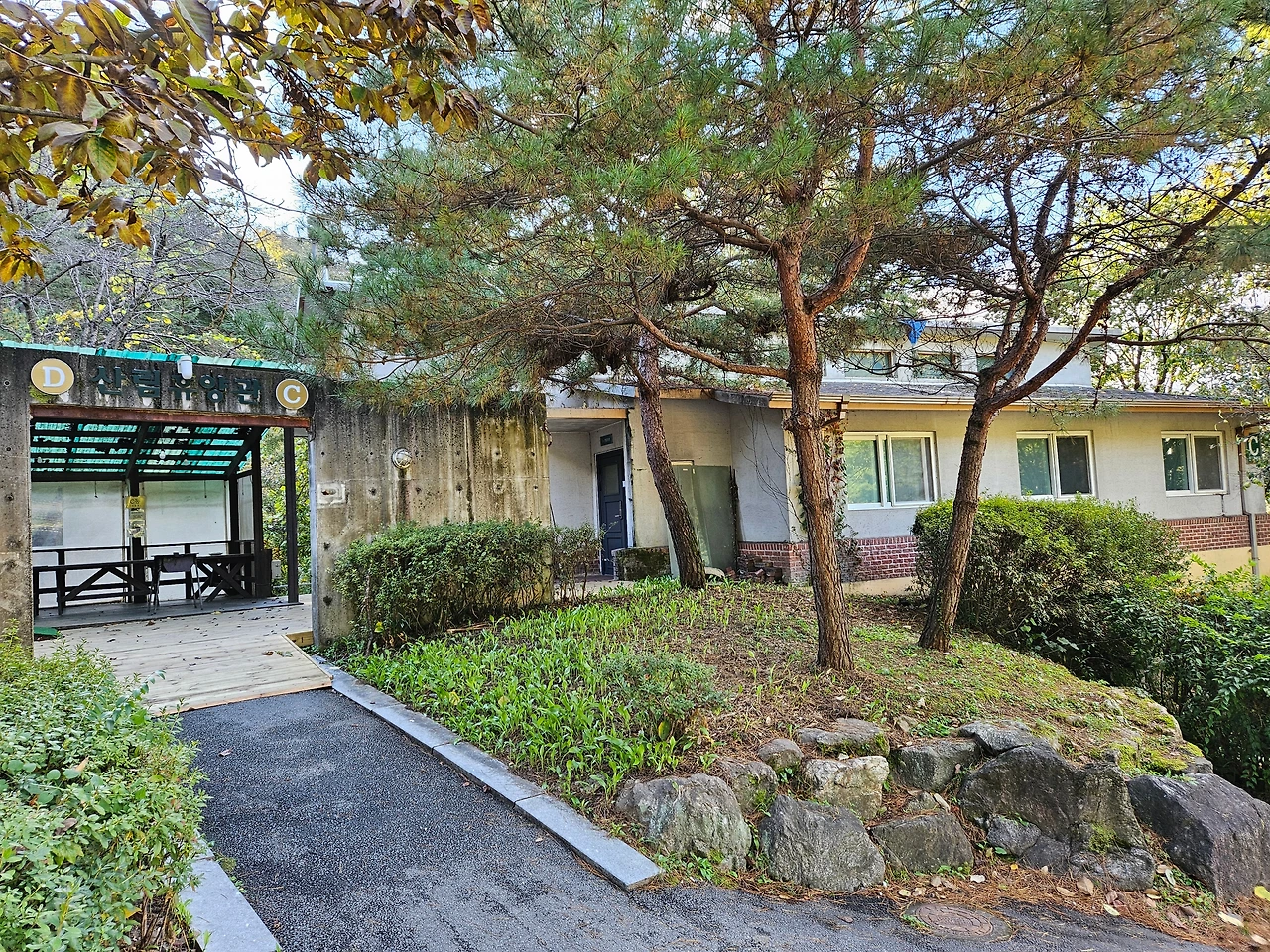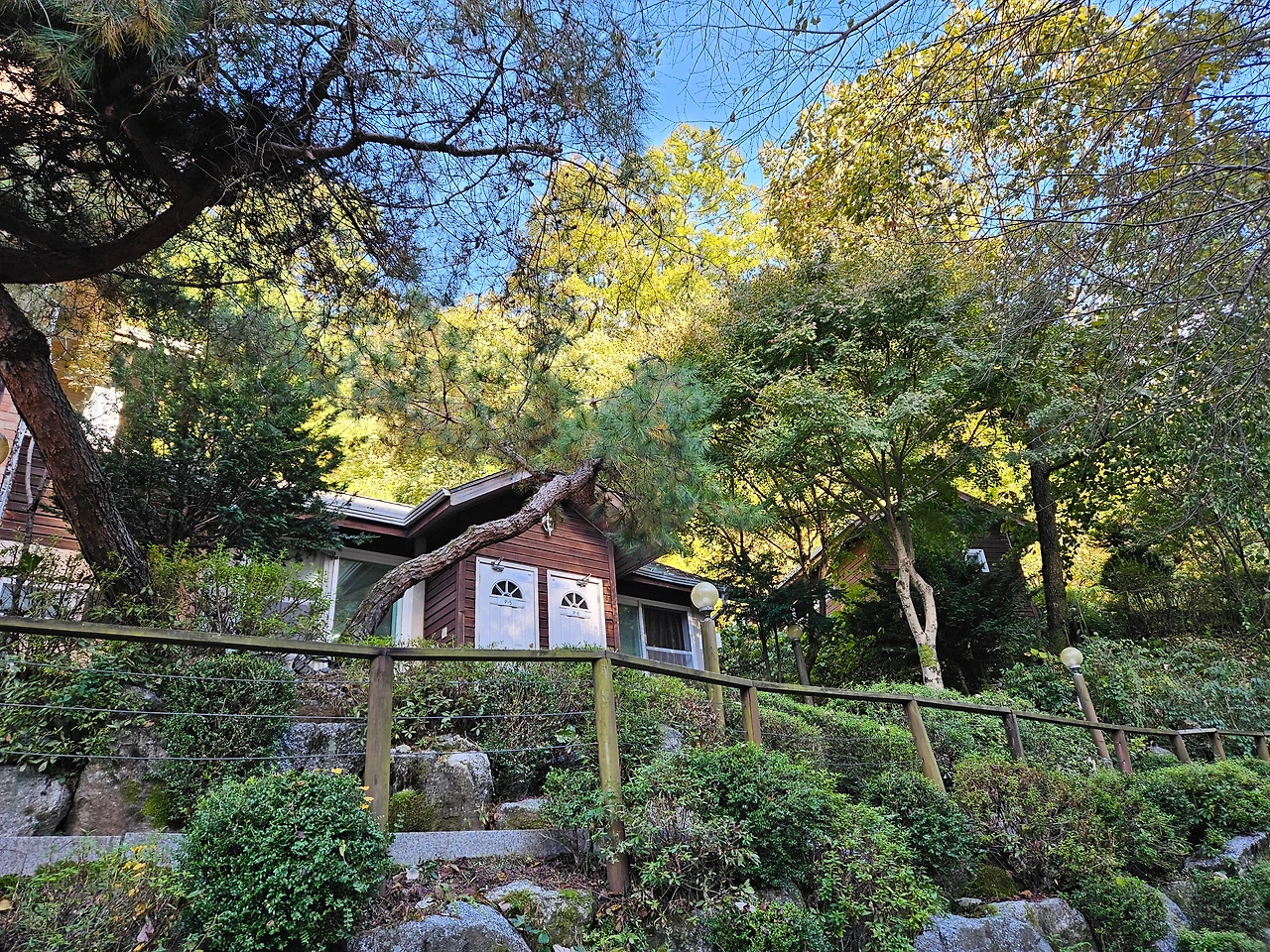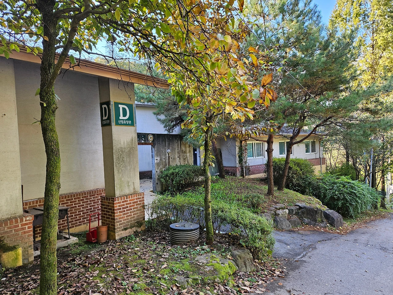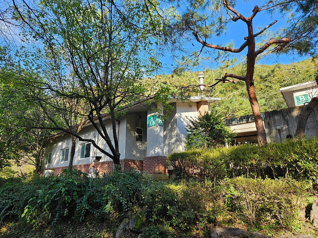 잠시 숨을 돌리고 이제 휴양림 위쪽으로 발길을 돌렸다. 다른 휴양림과는 다르게 순박하다고 할까? 아직 정리가 덜 된 조용한 시골길을 걷는 느낌이었다. 개장한 지 벌써 20여년이 지났으니 깔끔하게 정돈된 것은 않았지만 자연 그대로였기에 더욱 정감이 갔다. 신선한 소나무 내음에 취해서 산책로를 걸었다. 조금 더 올라가니 산림휴양관들이 보였다. 휴양관 A,B가 나타났다.