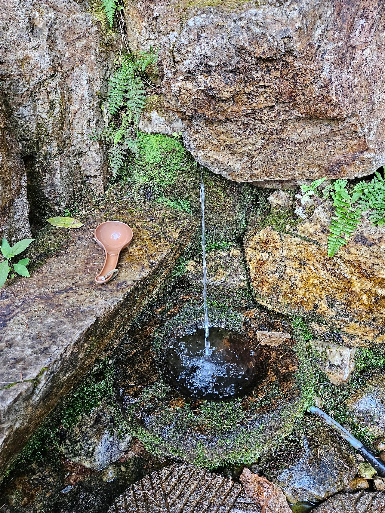 잠시 여유를 즐기다가 다시 산책 시작했다. 가는 길은 북한강을 곁에 두고 걸었다. 그래서 더욱 힘이 나는 듯 했다. 아들 녀석도 너무 좋다며 더욱 빨리 걷자고 내게 말했다. 200미터 남은 구간에서는 내리막길로 길이 변했다. 얼마 걸었을까 휴양림에서 출발해서 30분 정도 걸릴 듯 하다. 원시림에서 쏟아나오는 약수터가 나타났다. 너무나 목이 말라서 약수물 두 바가지를 원샷했다. 정말 시원했다. 약수 맛이 일품이었다. 아들 녀석도 신기한 듯 벌꺽벌꺽 약수물을 마셨다. 약수터 앞에 있는 쉼터에서 잠시 휴식을 취한 후에 우리는 다시 휴양림으로 발걸음을 옮겼다.