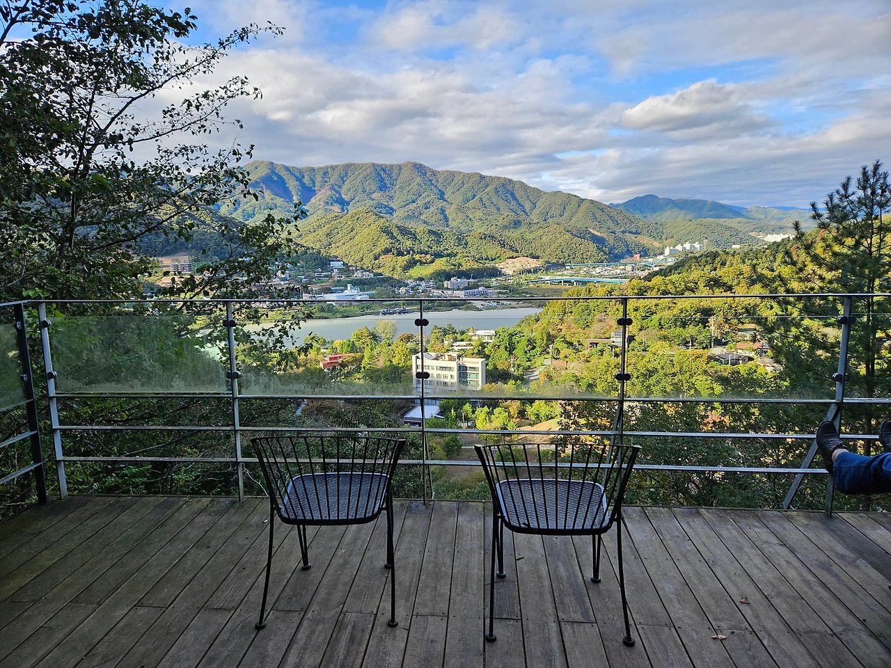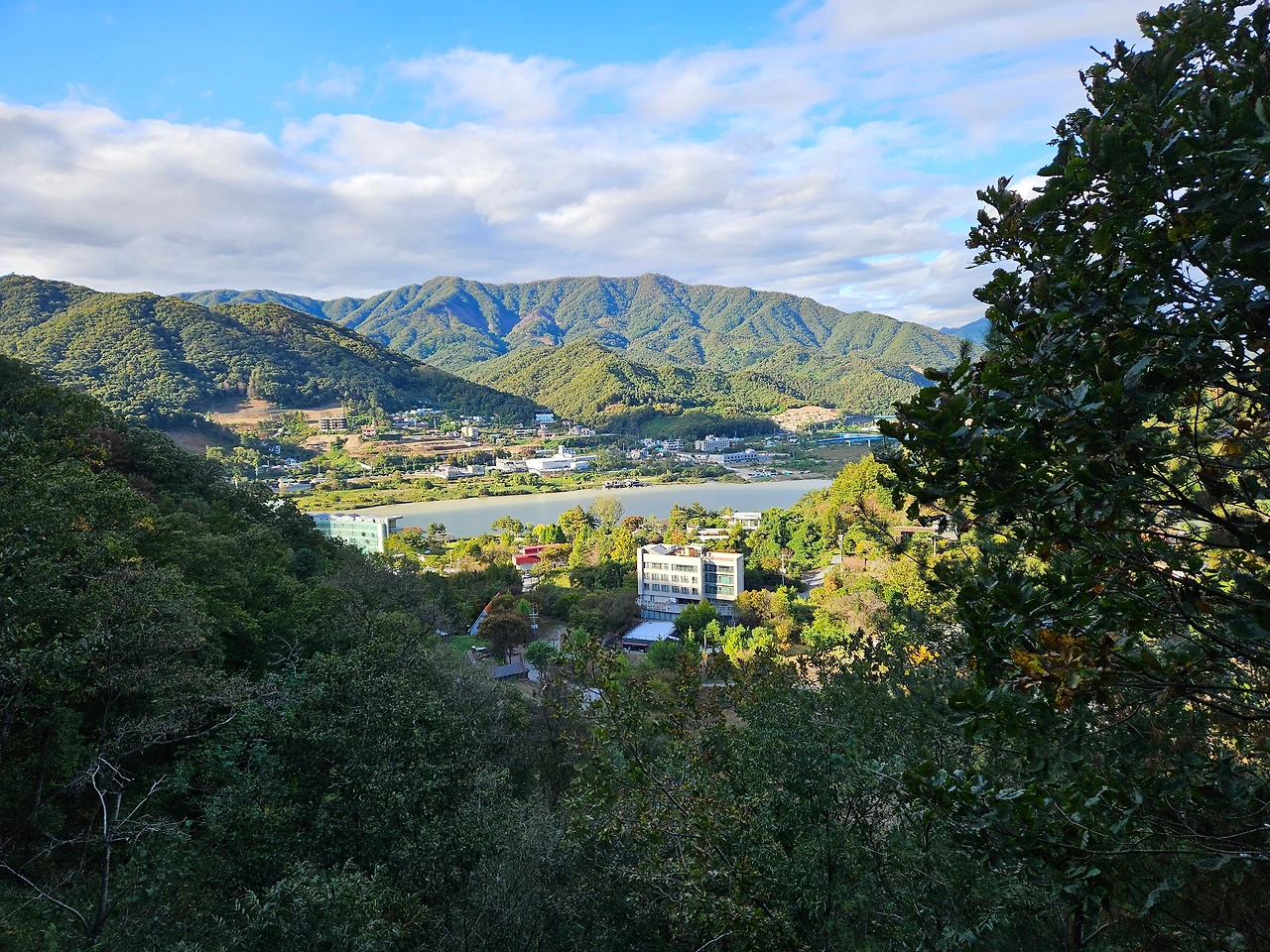 첫 시작은 잔잔한 오르막길이었다. 혹시 900미터가 가파른 길이 아닐까 라는 걱정이 들었지만 가족들을 안심시키며 가을 산책을 시작했다. 다행히도 가는 길은 완만한 길이었다. 5분 정도 걸으니 저 멀리 뭔가 보이기 시작했다. '북한강 전망대인가?' 살짝 속도를 내서 걸었다. 그 앞에 가니 "와" 라는 감탄사가 터져나왔다. 근사한 풍경이었다. 진정한 북한강 전망대였다. 청평 뒤로 이어지는 푸른 산과 강이 한 눈에 들어왔다. 너무나 아름다운 풍경이었다. 이곳에 잘 왔다는 생각이 들었다. 아내, 아들 녀석과 함께 잠시 자리에 앉아서 멋진 풍광을 눈으로 담았다.