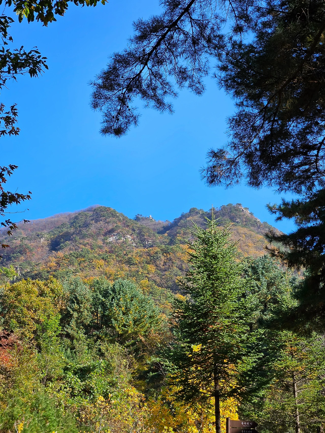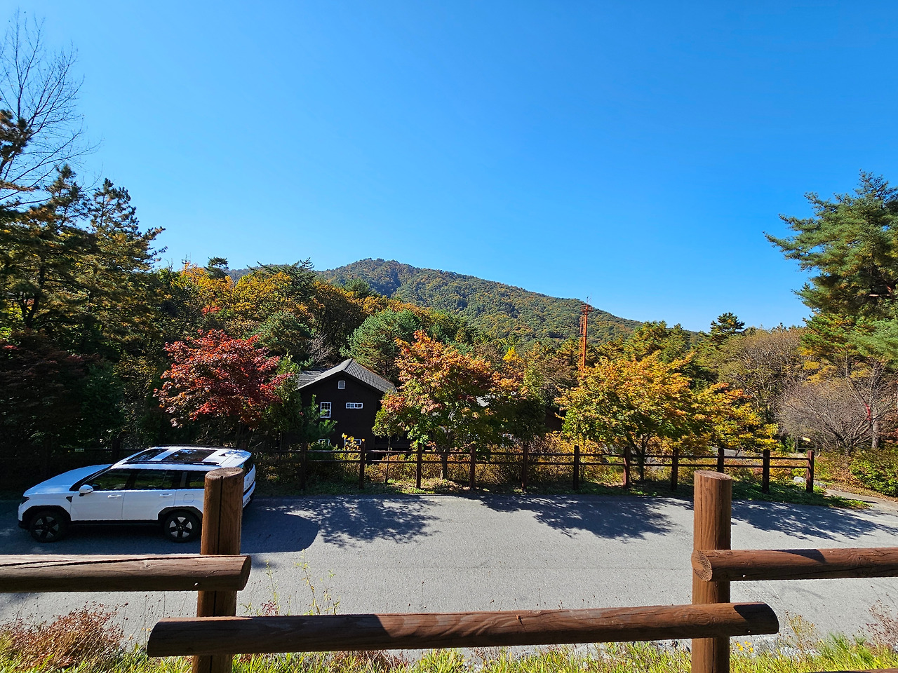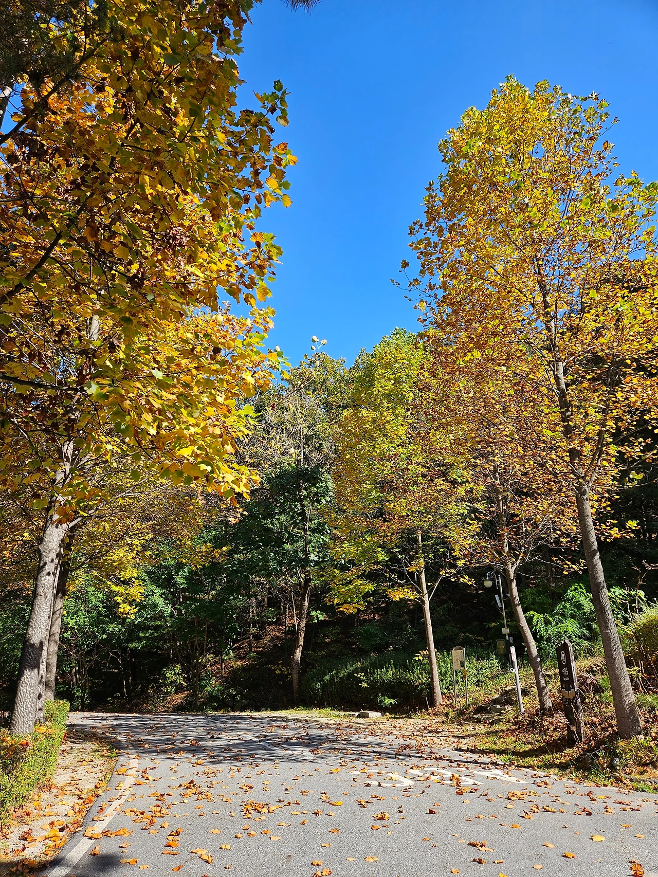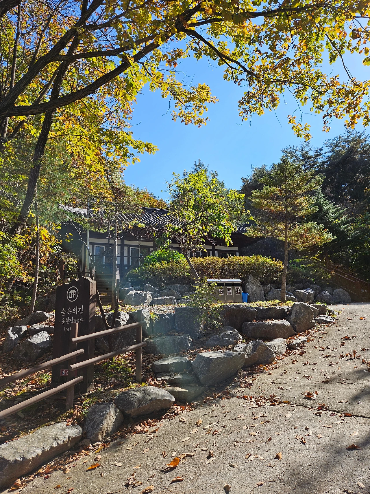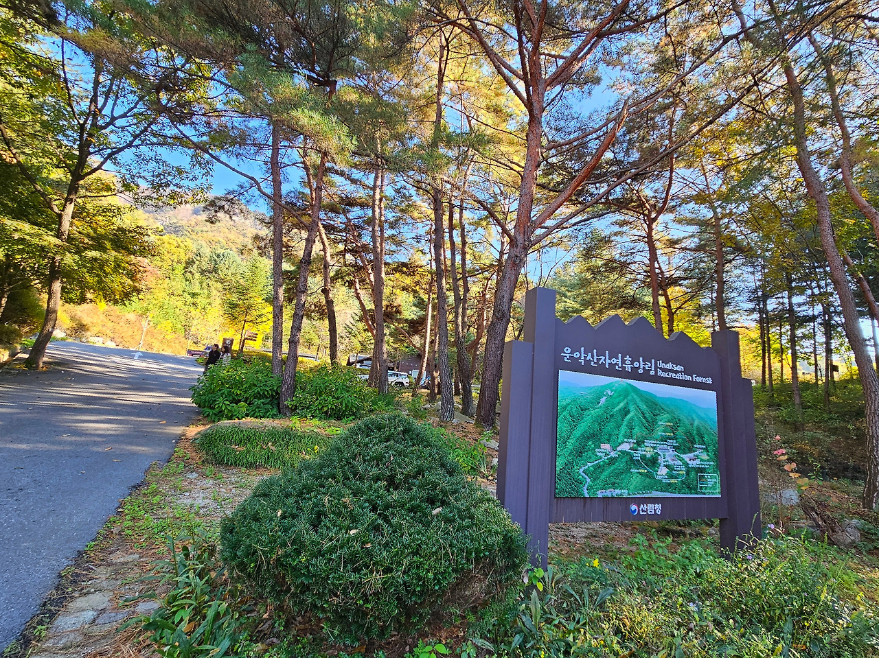 이윽고 주말 아침. 내가 상상했던 가을 날씨, 그 이상이었다. 구름 한 점 없이 맑은 하늘에 선선한 바람까지. 여행 가기 딱 좋은 날씨였다. '룰루랄라~' 콧노래가 절로 나왔다. 짐을 챙겨서 강원도 포천에 있는 운악산 자연휴양림으로 향했다. 집에서 출발하여 1시간 20분. 가을색으로 갈아입은 나무들이 가득한 운학산 자연휴양림 입구에 도착할 수 있었다.