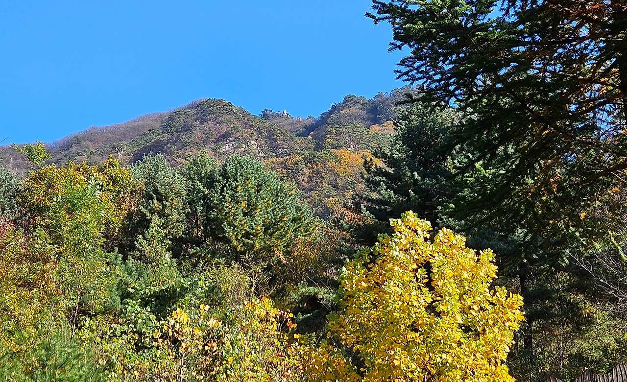 입구에서 바라본 운악산 정상포천 운악산은 서울 관악산, 원주 치악산, 춘천 화악산, 개성 송악산과 함께 중부 지방의 5대 악산 중 하나다. 해발 935.5미터로 아름다운 산세와 가을 단풍이 유명하여 경기도의 소금강으로 불릴 정도라고. 운악산이 품은 골짜기 아래에 아담하게 위치한 것이 바로 운악산자연휴양림이다. 2007년 3월에 개장한 이 휴양림은 가을을 담은 풍광과 함께 역사적인 스토리가 합쳐지면서 인기를 모으고 있다. 휴양림 안쪽에는 고려말에 있었던 가마터가 있다. 15세기 도자기를 생산했던 곳이 여기에 있었다고. 또한 휴양림에서 조금 더 들어가면 궁예의 성터도 있다. 궁예가 입산 후에 왕건군을 막으려고 운악산성을 축성해 반년 동안 왕건과 대항했는데 그때 신축한 성터라고 한다. 이런 특별함으로 운악산은 가을을 즐기는 사람들에게 여전히 사랑받고 있는 명산 중의 하나다.