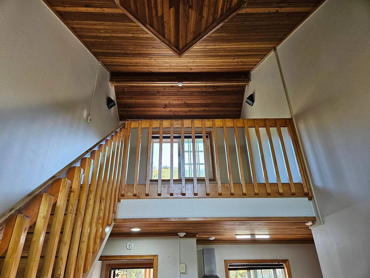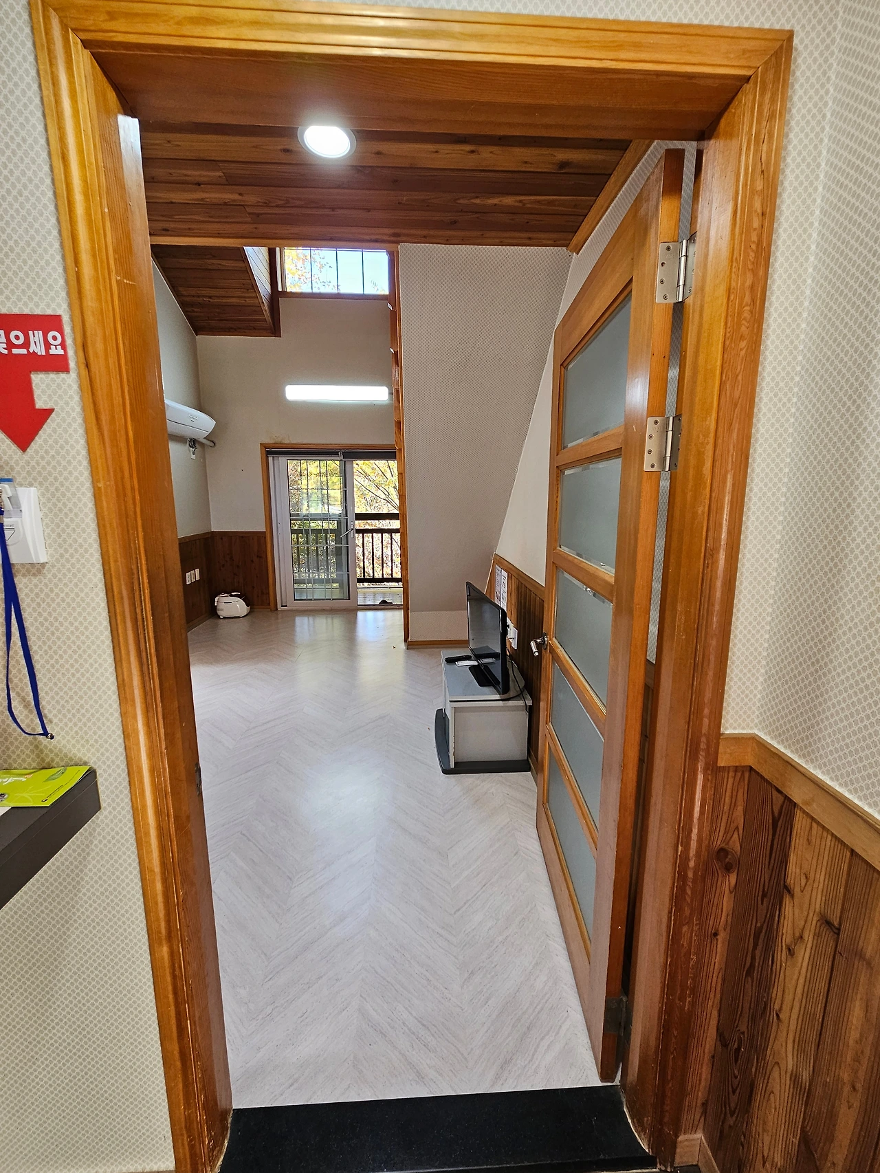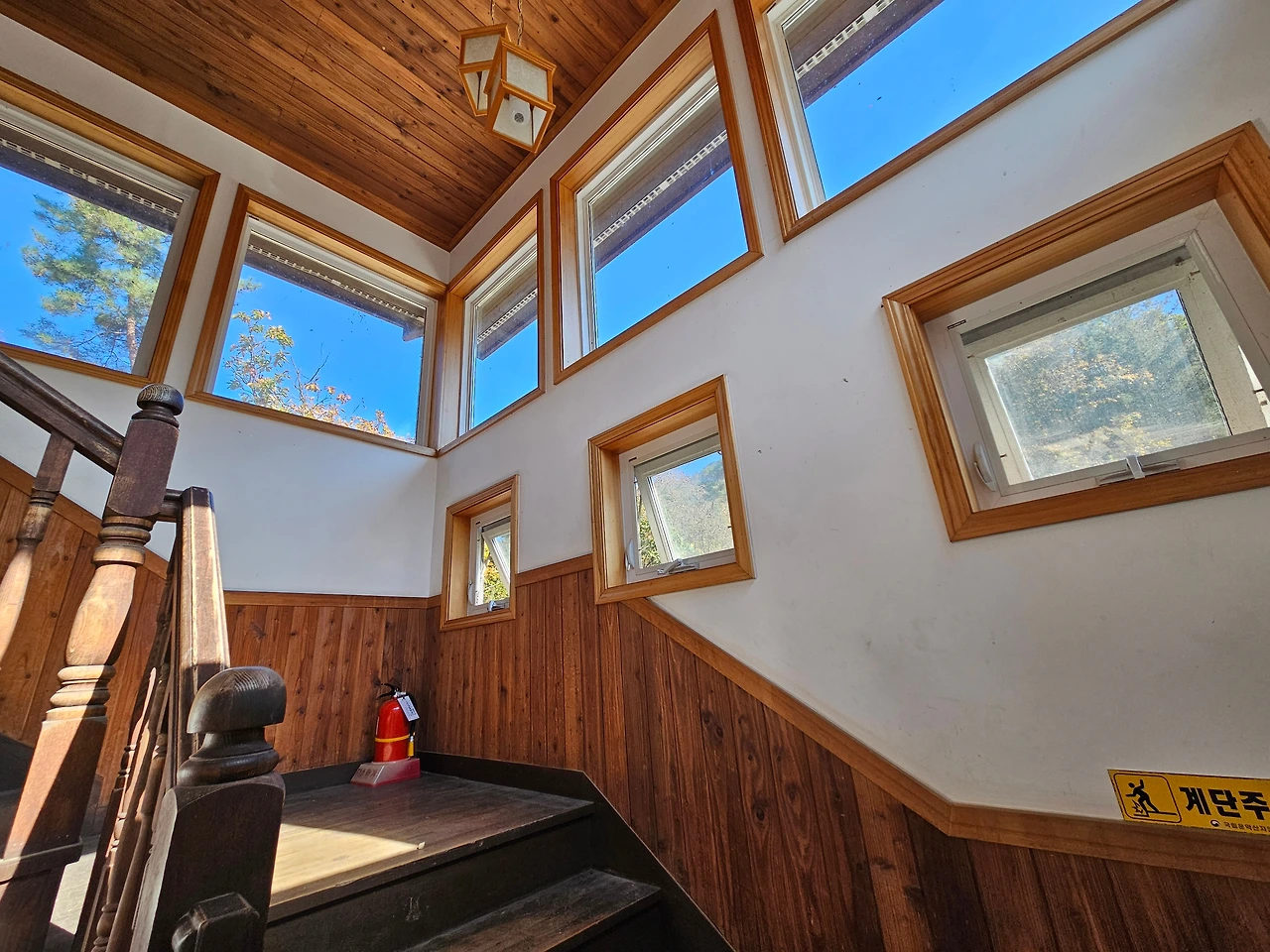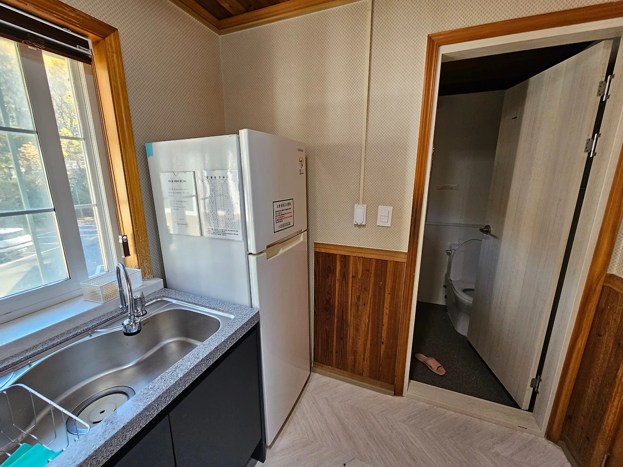 숙소 앞에 차량을 주차하고 구불구불 계단을 걸어서 2층으로 올라갔다. 그리고 문을 열었다. 그런데 기대 이상이었다. 국립 자연휴양림 단체 숙소인 연립동이지만 의외로 시설과 관리 상태가 좋았다. 문을 여니 긴 거실이 나왔다. 건너편에 확트인 창이 있었고 문쪽에는 싱크대가 있었다. 화장실도 깨끗했다. 거실 옆에는 또 하나의 큰 방이 있었다. 여기에는 통창은 아니었지만 양쪽으로 나눠진 중간 크기의 창이 있었다. 다시 복층으로 이어지는 계단을 오르면 작은 공간이 있었다. 1~2명 정도 잘 수 있는 크기였다. 우리 가족이 머물기에는 완벽했다. 그래서인지 내 마음 속의 행복 지수가 쭈욱 올라가고 있었다.