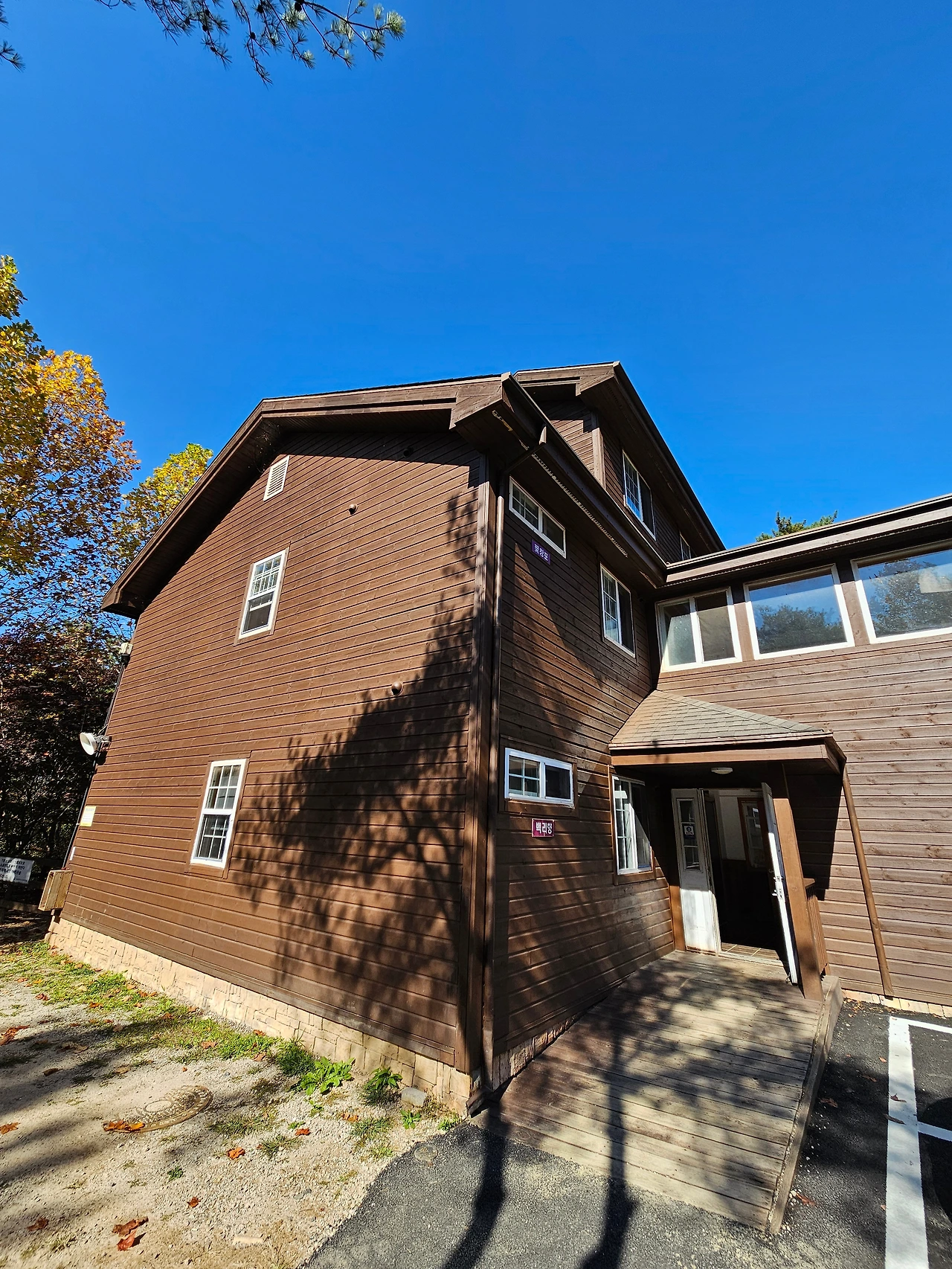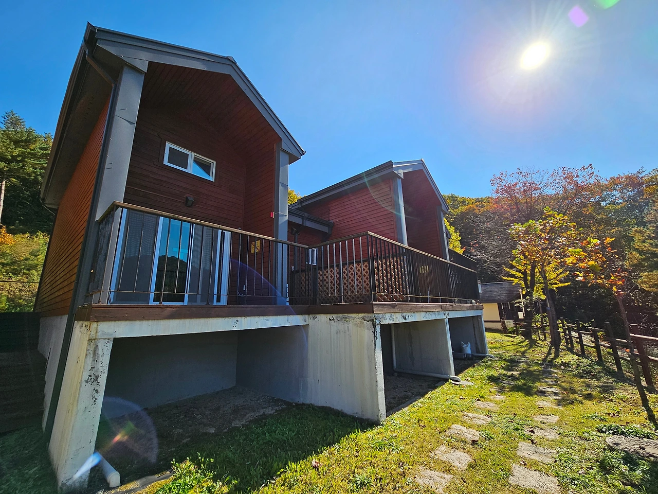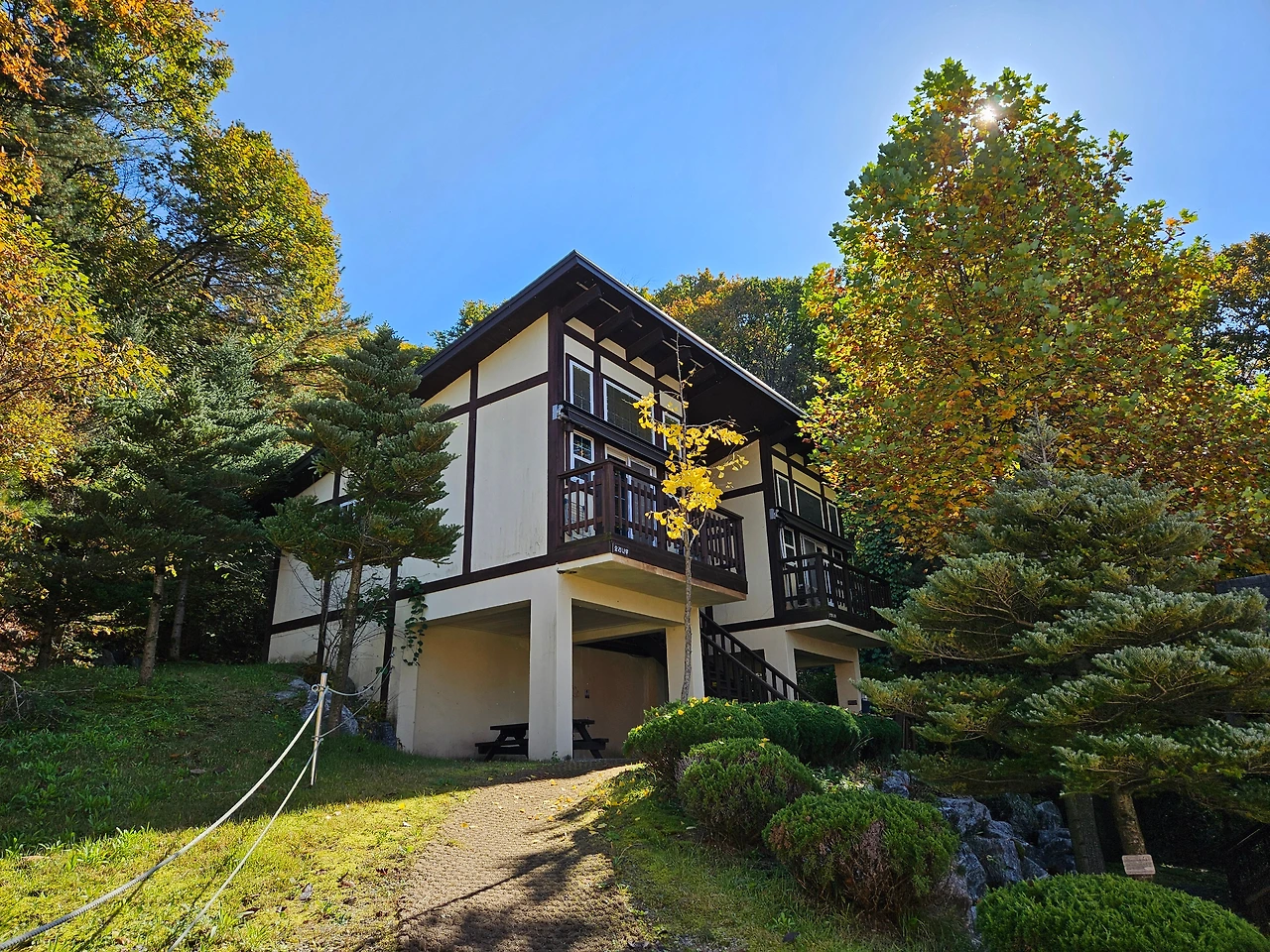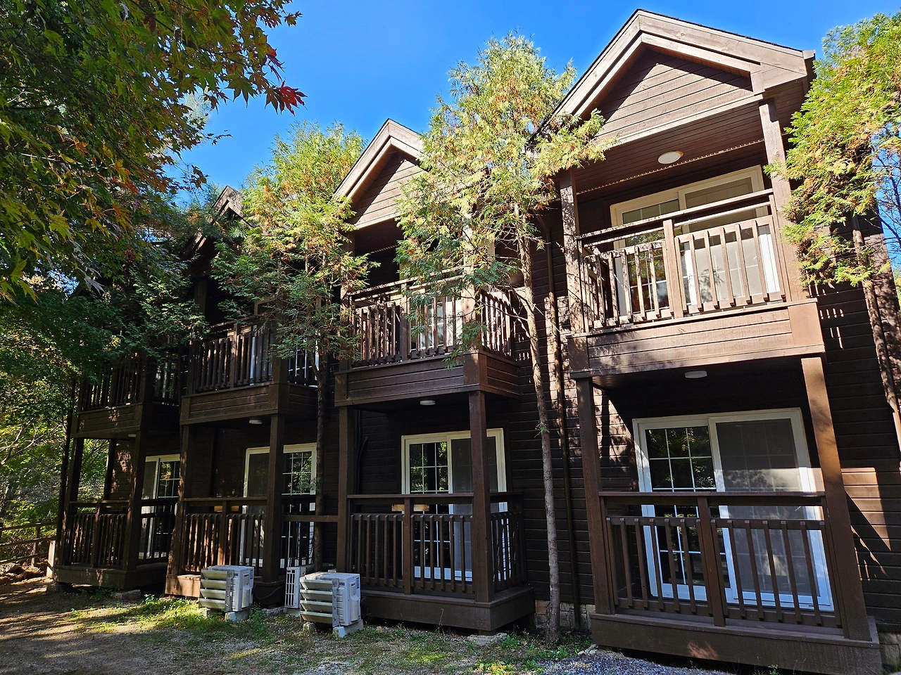 이제 방향을 바꿔서 언덕 위쪽으로 올라갔다. 입구에서 들어오면 가장 먼저 만나는 연립동 A부터 C까지가 이어져 있었다. 가장 높은 곳에 위치하기에 인기가 가장 많은 숙소처럼 보였다. 앞쪽에도 멋진 테라스가 있었다. 잠시 객실에서 바라보는 뷰가 궁금해져서 숙소 앞쪽으로 올라가보았다. 우리 숙소와는 다르게 확트인 풍경을 볼 수 있었다. 건너편 붉은 단풍으로 갈아입은 산들이 멋지게 펼쳐졌다. 가을이 선물에 주는 근사한 정원 같았다. 이런 모습을 보면서 커피 한 잔 마시면 일상에서의 스트레스가 한 방에 사라질 것 같은 느낌. 나중에 다시 방문한다면 이 숙소를 찜해야 되겠다고 다짐했다. 그 옆으로는 연립동 C가 있었다. 오리나무와 산벚나무 2개동으로 구성된 연립동 C도 2가족 정도가 함께 머물기에 충분한 크기로 보였다.